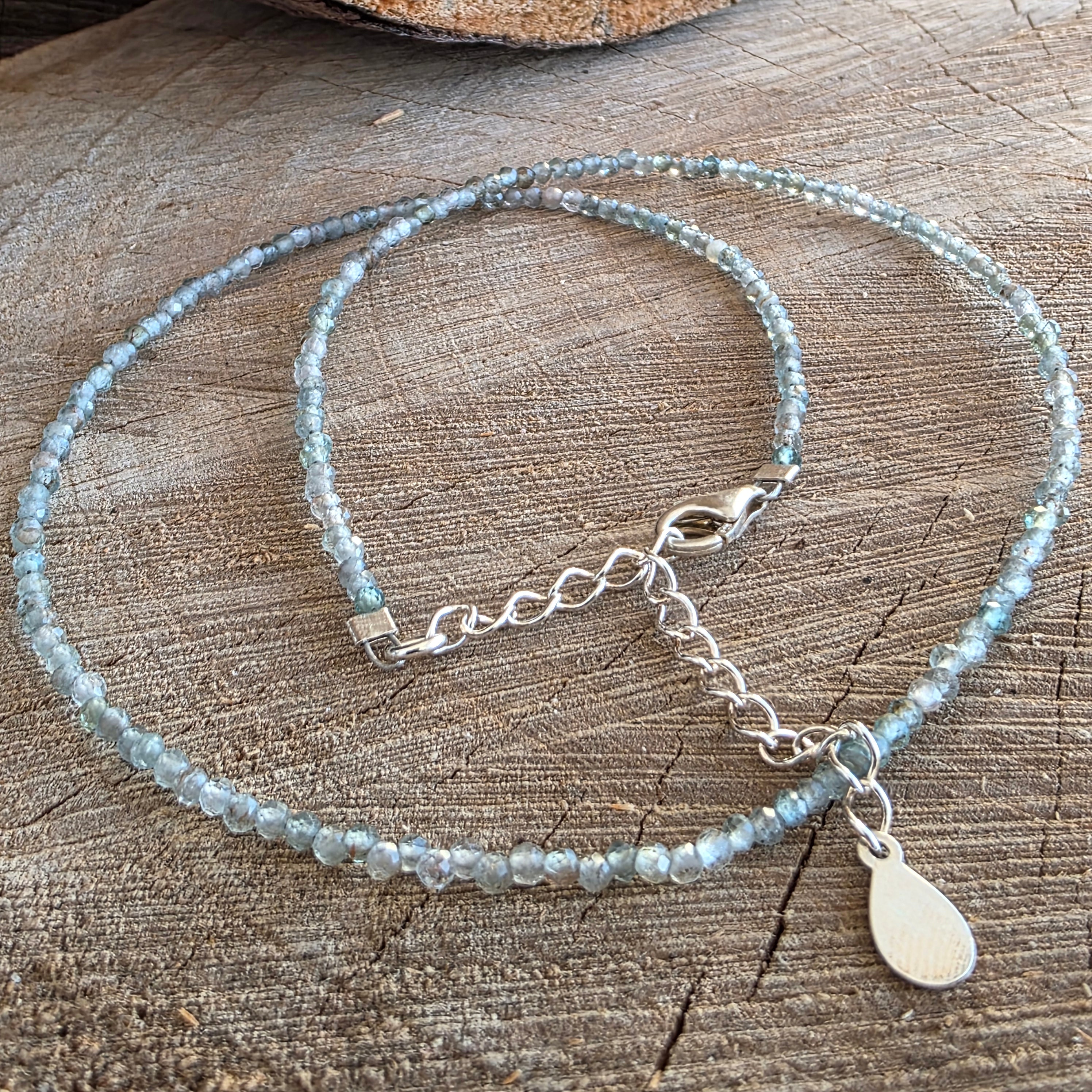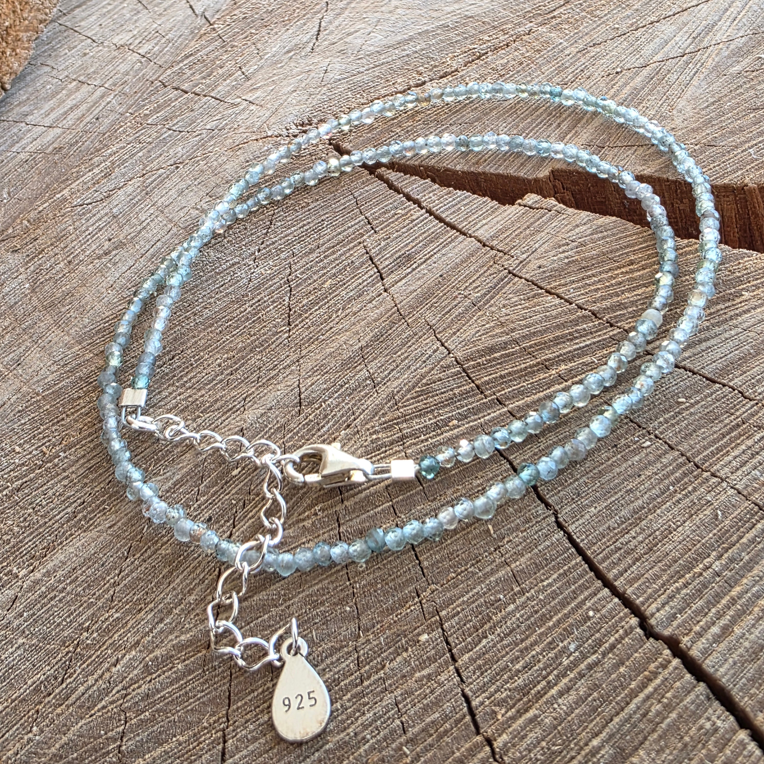 Un colier delicat ca o adiere limpede de gând senin – realizat din mărgele sferice de apatit albastru fațetat, cu diametrul de 2,5–3 mm, într-o nuanță profundă de albastru marin cu reflexii translucide.