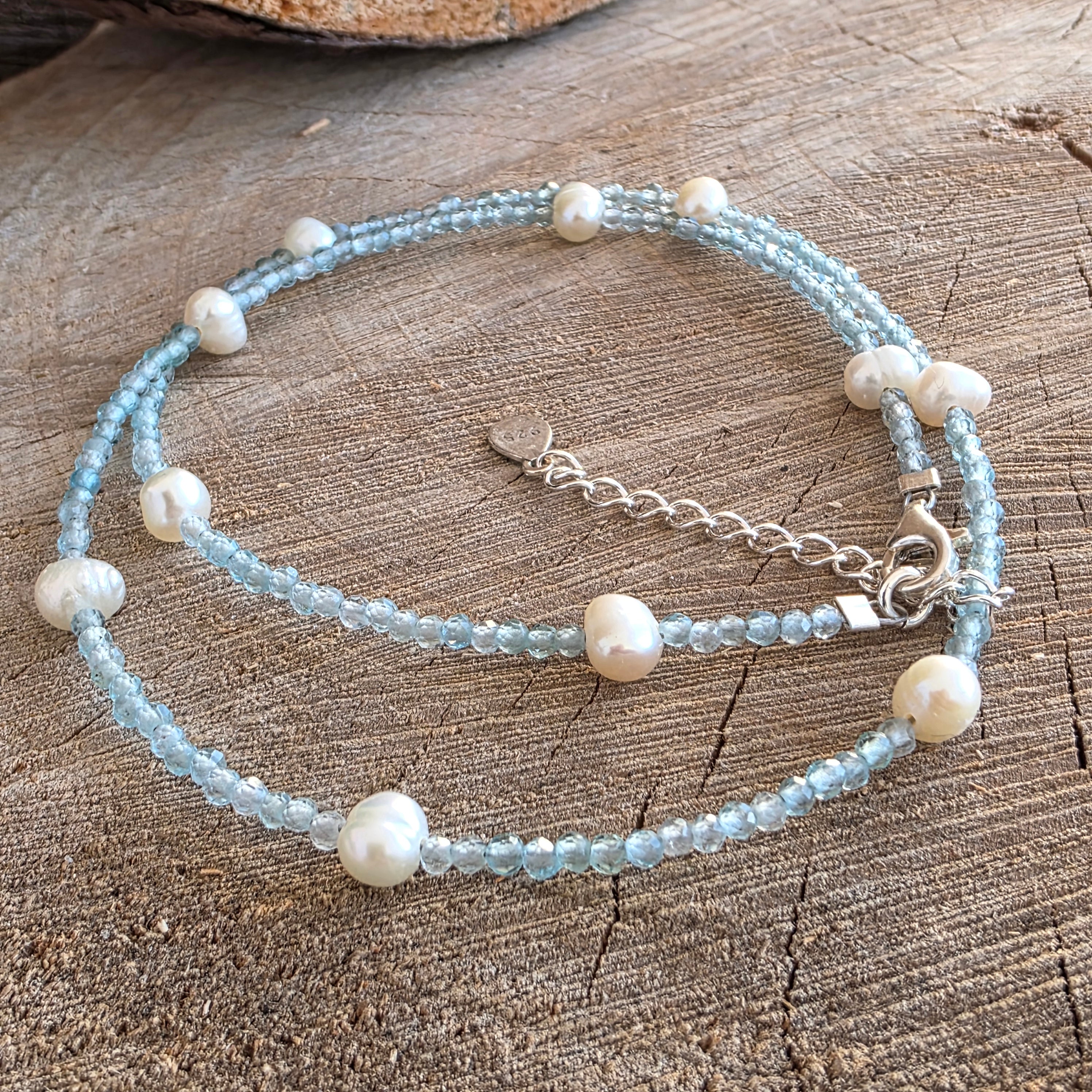 Materiale: apatit albastru fațetat 2,5 mm, perle naturale ~5 mm, argint 925