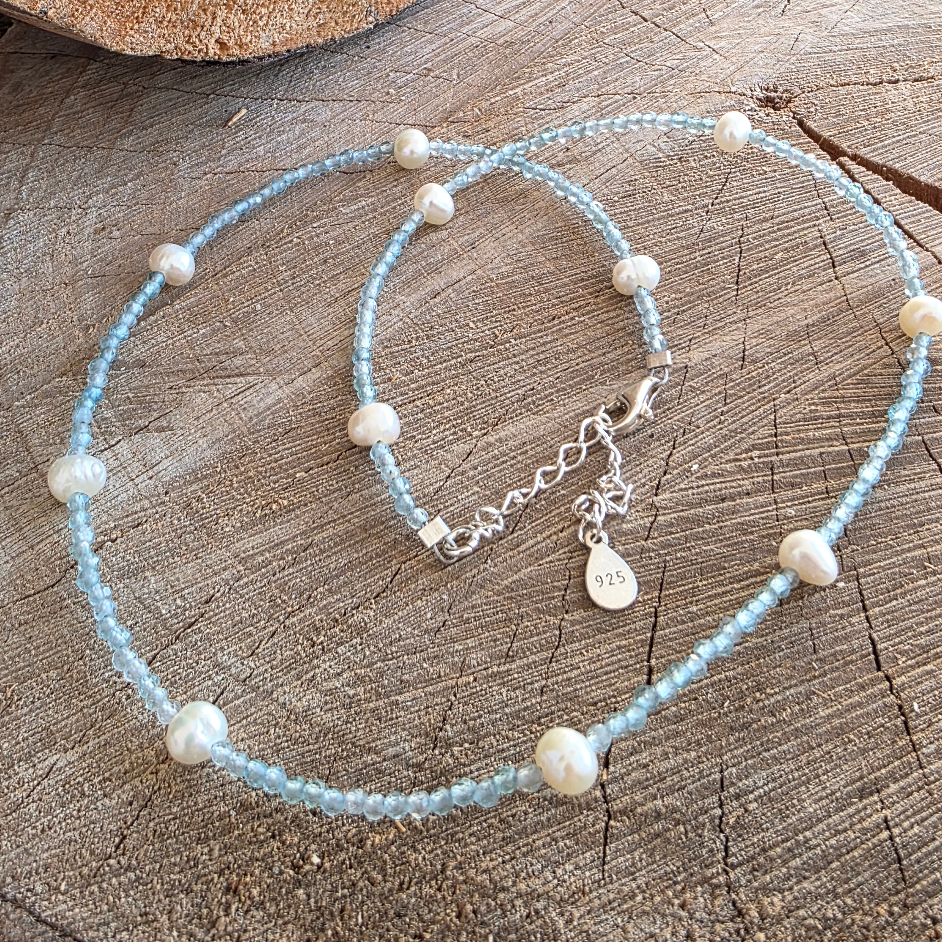 Un colier fin ca un fir de gând limpede ce se strecoară printre emoții. Mărgelele sferice de apatit albastru, fațetate cu grijă și măsurând doar 2,5 mm, strălucesc discret în nuanțe acvatice, translucide, ca valurile unei ape tăcute.
