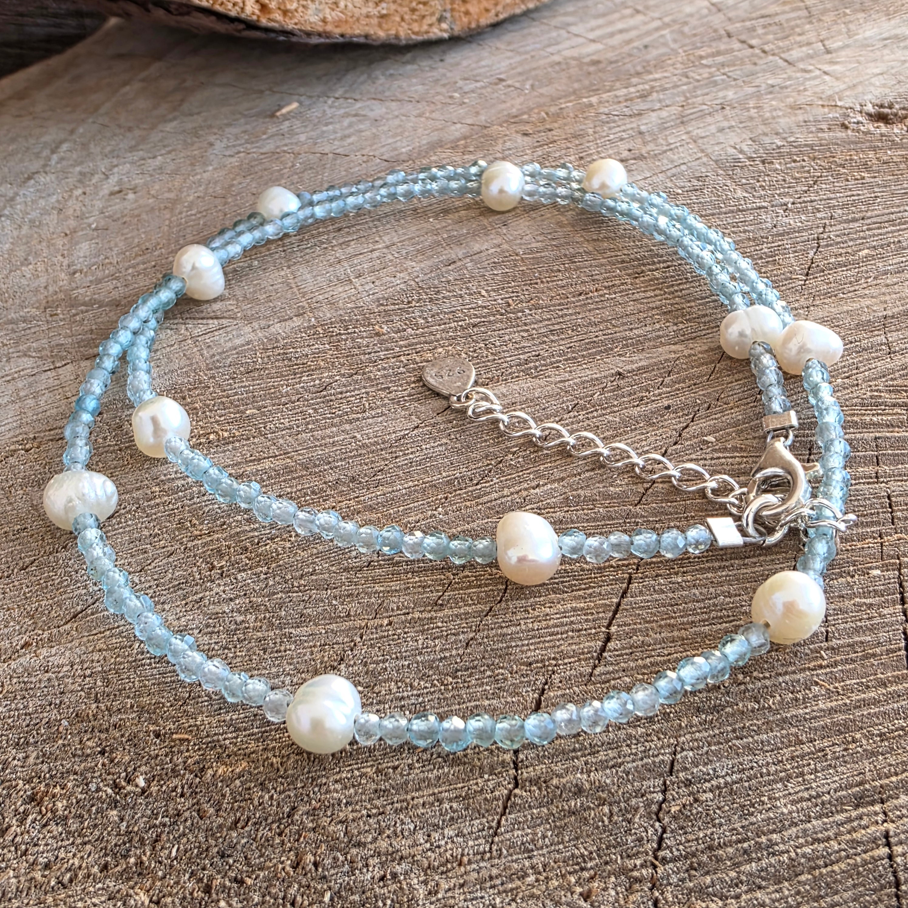 Presărate de-a lungul șiragului, perlele naturale de aproximativ 5 mm adaugă un contrast perlat și organic – ca niște puncte de lumină între picăturile de cer. Împreună, formează o bijuterie ce îmbină claritatea cu blândețea, seninul cu profunzimea.