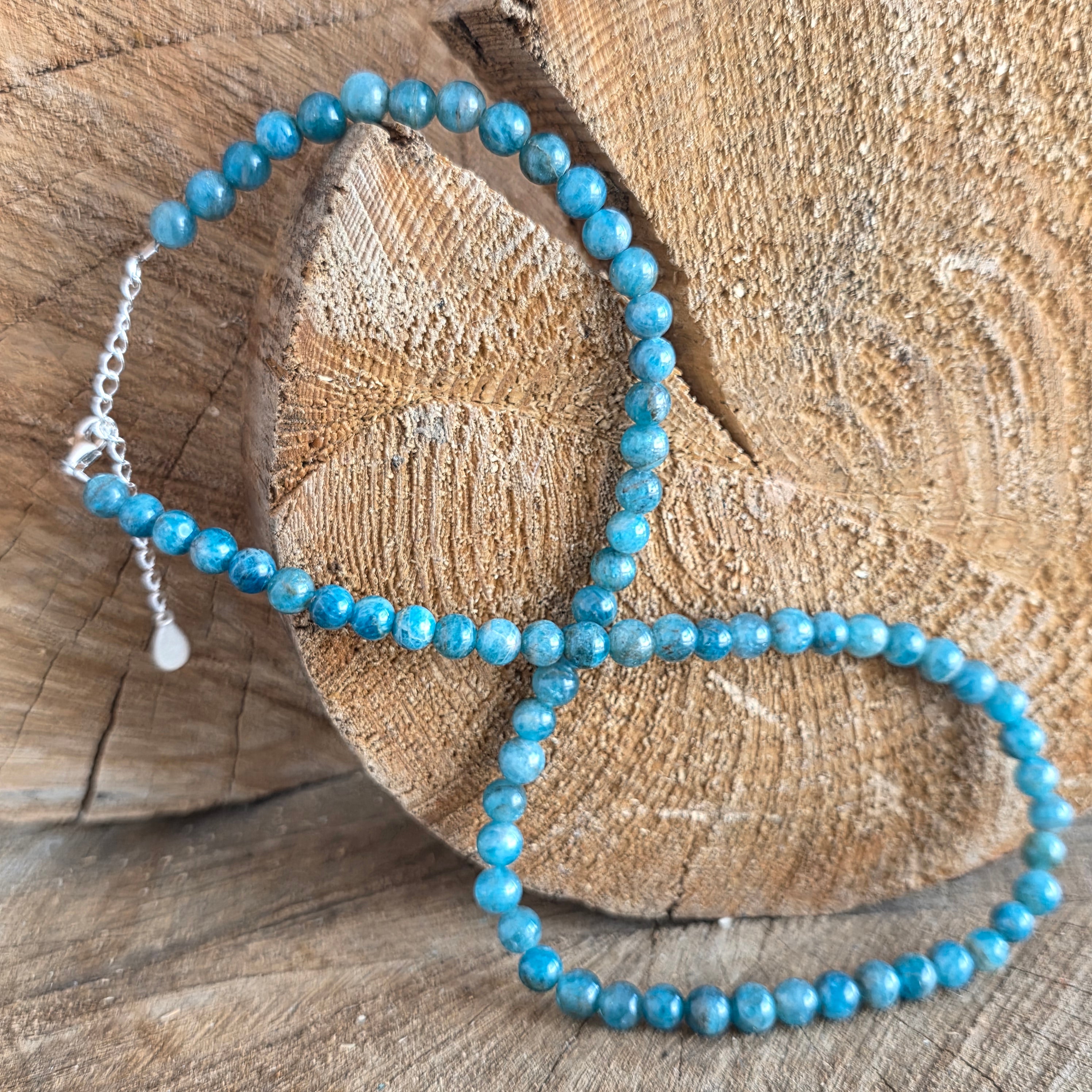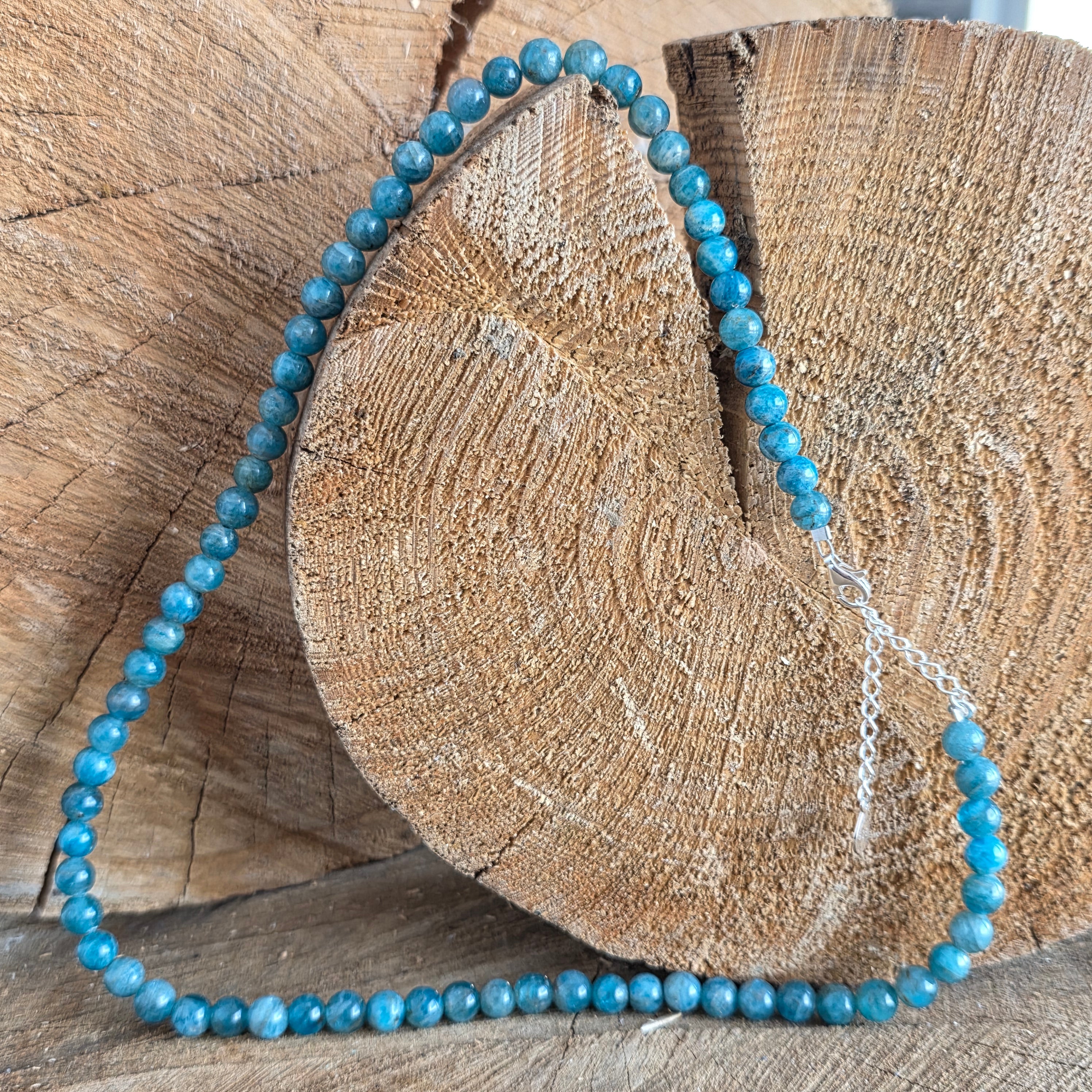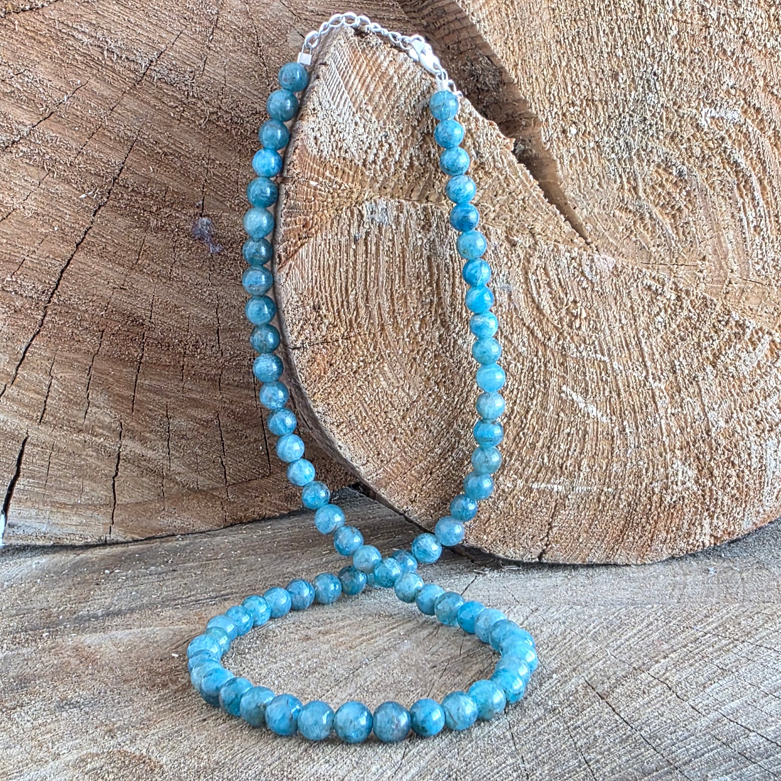 Un colier ca o adiere de gânduri limpezi – delicat, profund, clar ca o apă liniștită în lumina dimineții. Mărgelele rotunde de apatit de 6 mm, cu albastrul lor vibrant, creează un ritm vizual armonios, care inspiră deschidere, comunicare și intuiție.