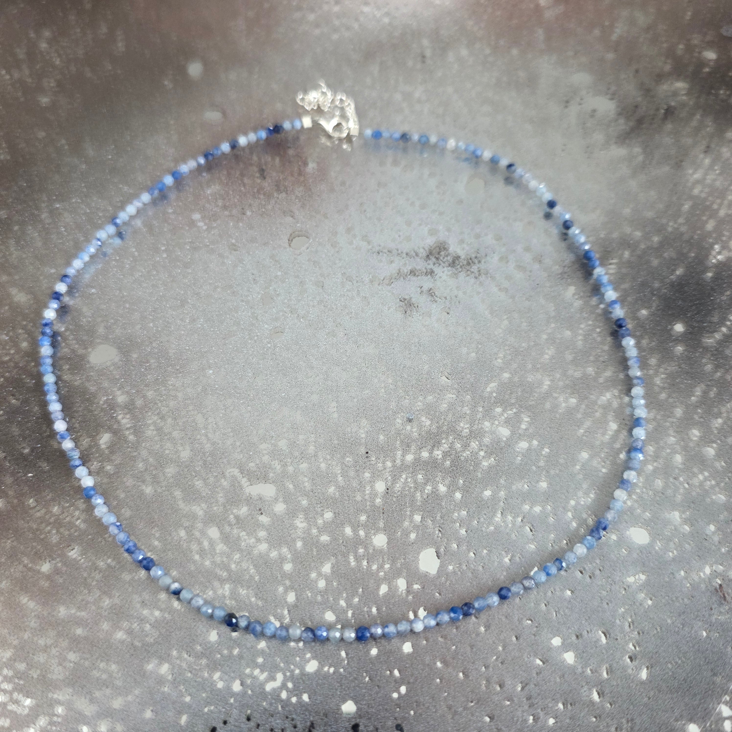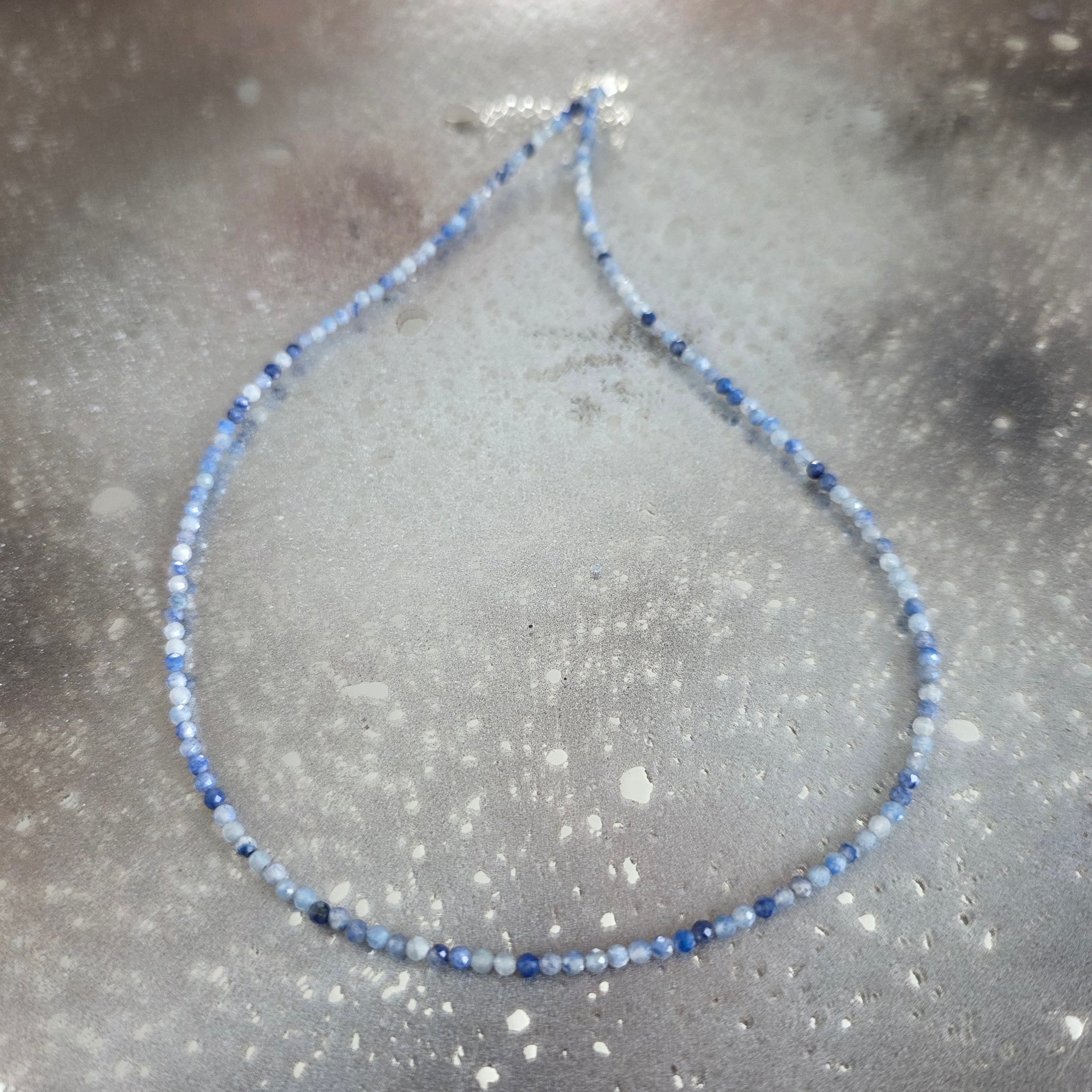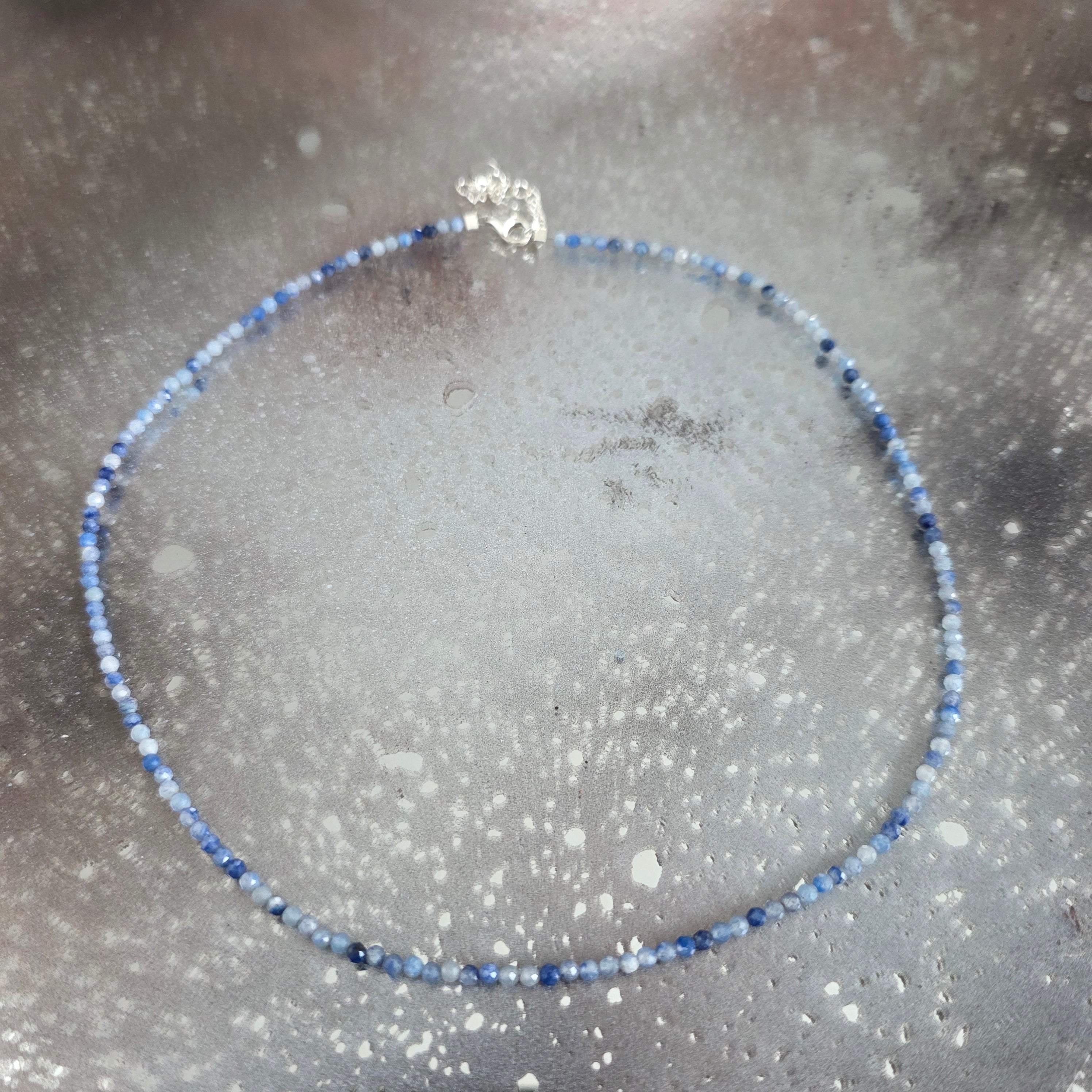 Un colier ca o lumină discretă ce se naște în adâncuri – fin, subtil și magnetic. Mărgelele fațetate de aventurin albastru de 2 mm captează și reflectă lumina în scântei delicate, ca o noapte senină presărată cu promisiuni tăcute.