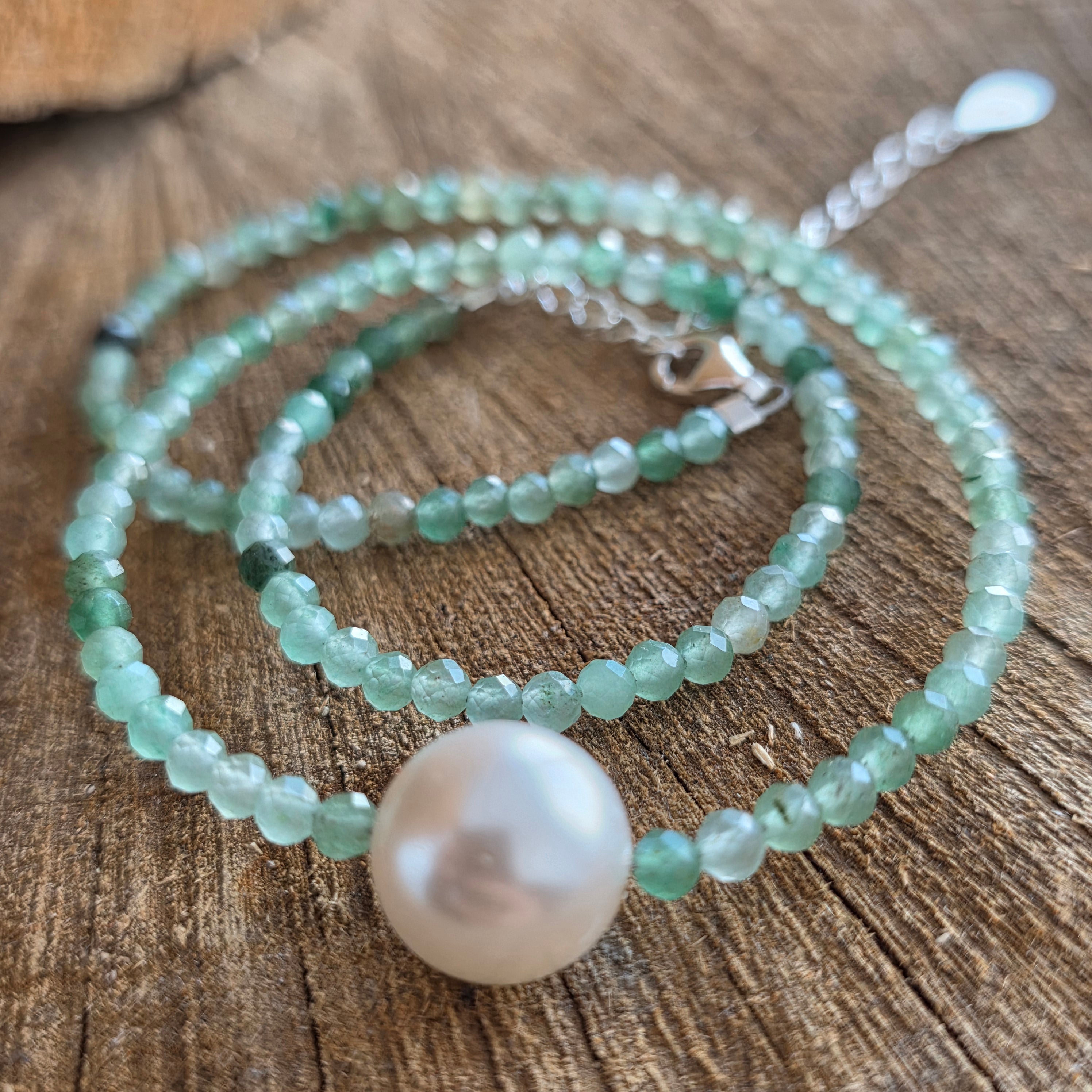 Un colier care poartă energia prospețimii și a norocului senin, asemenea luminii care dansează pe frunzele dimineții. Aventurinul, cu nuanțele sale de verde calm și străluciri subtile, este cunoscut drept piatra norocului, a abundenței și a încrederii în viață.