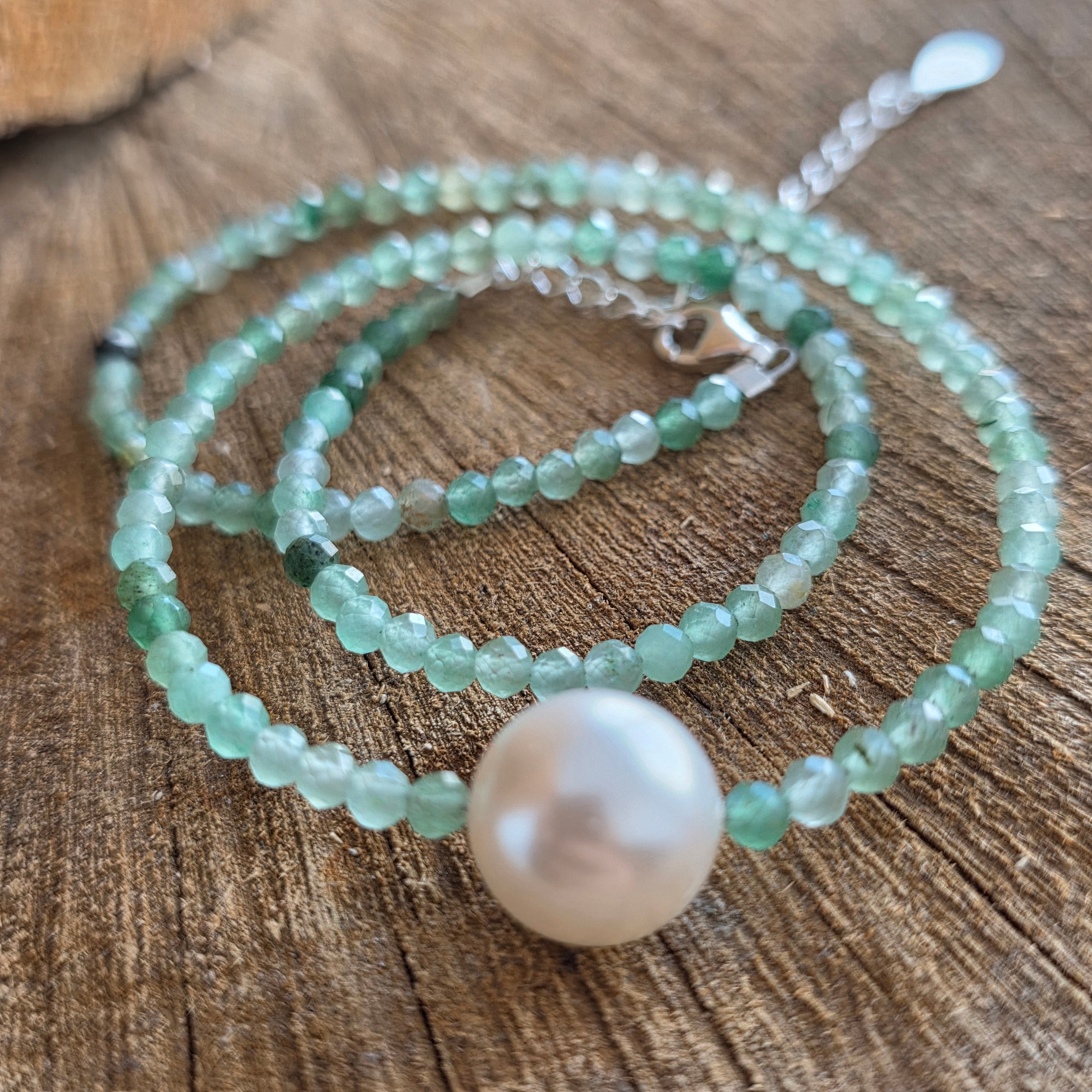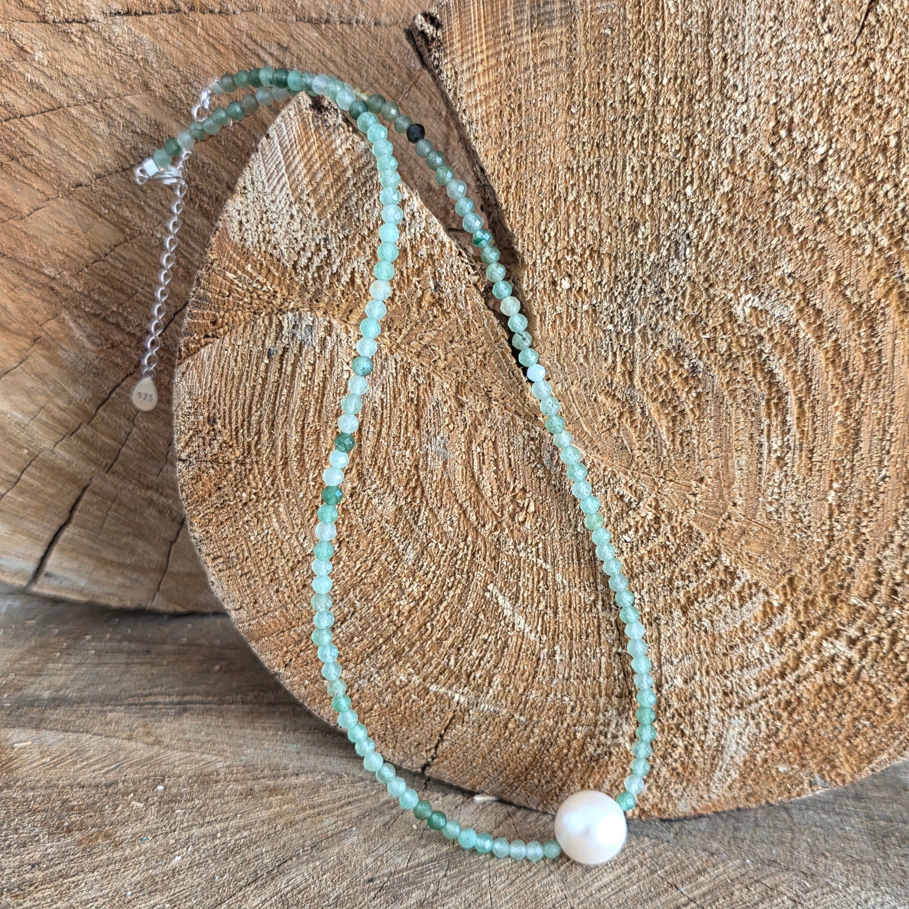 Materiale: aventurin verde fatetat 3 mm, argint 925, perla 1 cm