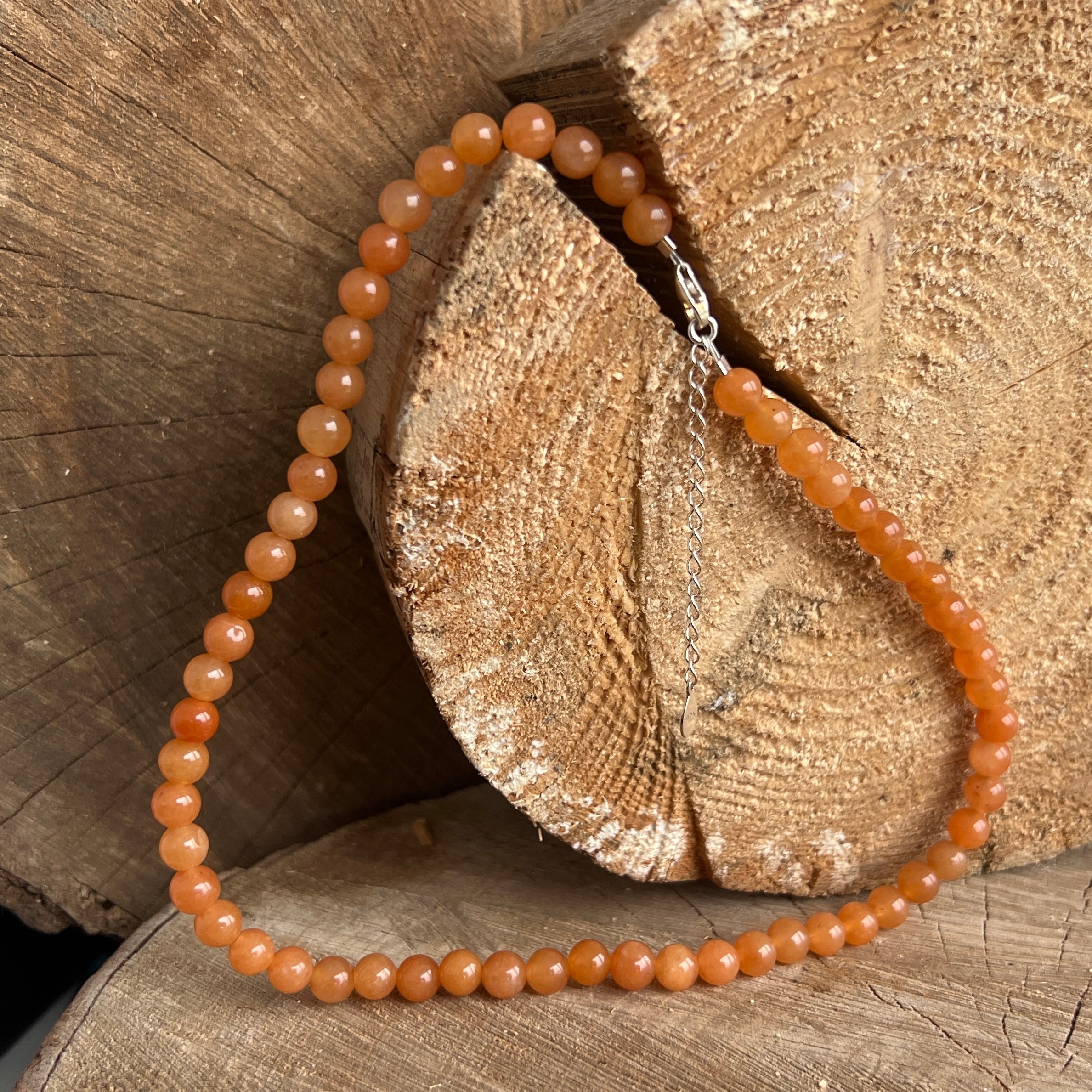 Firul este compus integral din sfere șlefuite de aventurin portocaliu de 6 mm, mărgele netede și catifelate ce par modelate din soare domol. Nuanțele variază de la piersică aurie la portocaliu ars, într-un joc subtil care amintește de mierea curgătoare, de lutul cald sau de lumina filtrată prin perdeaua unei după-amiezi de vară.