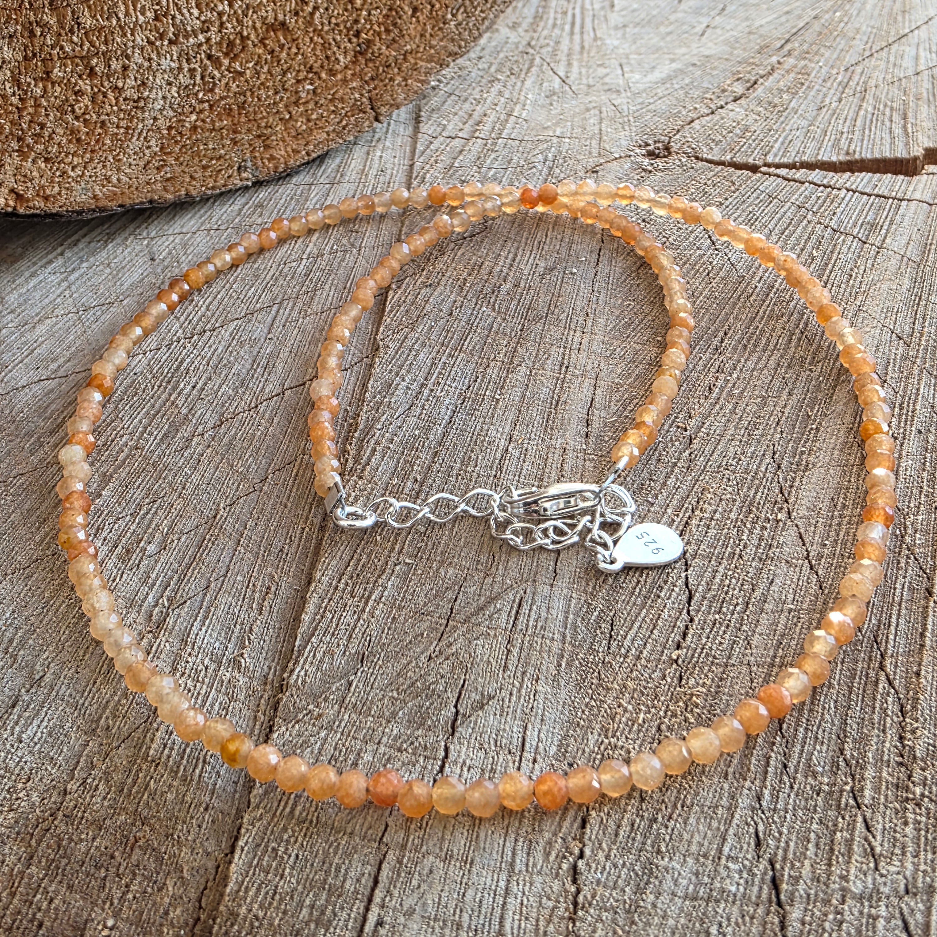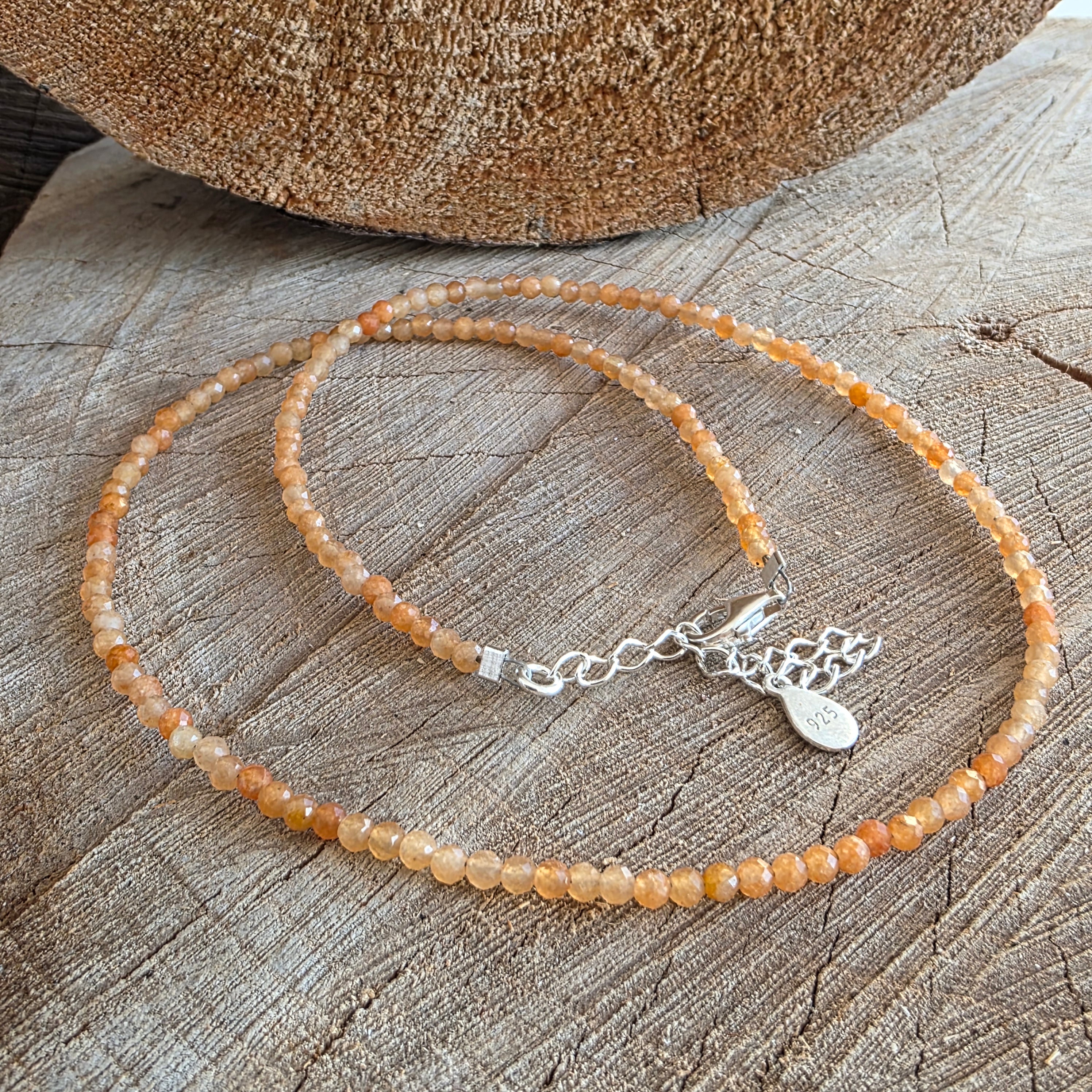 Firul este compus integral din sfere fațetate de aventurin portocaliu de 2.5 mm, mărgele fine, transparente în unele unghiuri și mătăsoase în altele, care prind lumina în scântei blânde, ca licăririle apusului peste nisip cald. Nuanțele variază între piersică stinsă și o tentă subtilă de chihlimbar deschis – o culoare solară, dar netulburătoare, care mângâie, nu orbește.