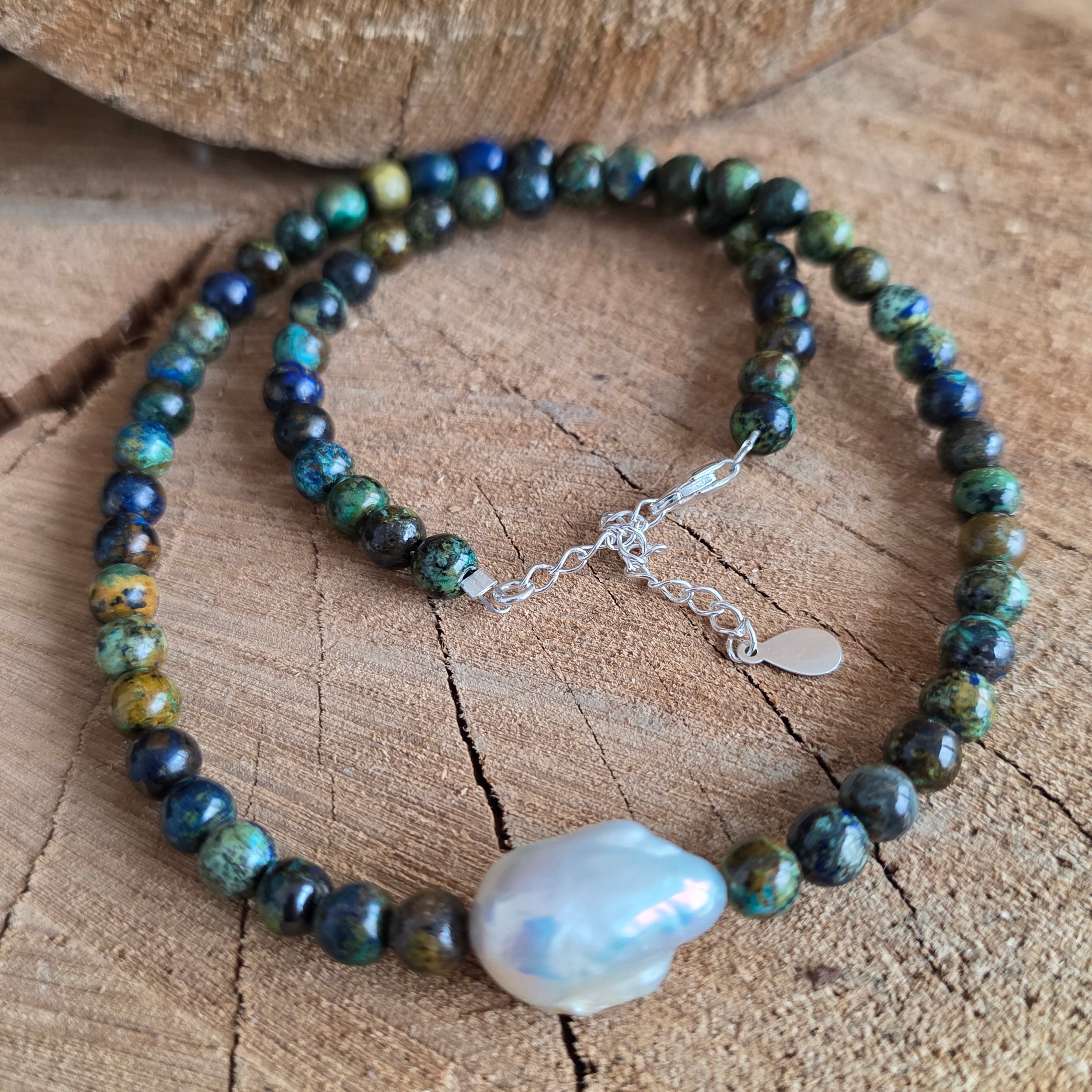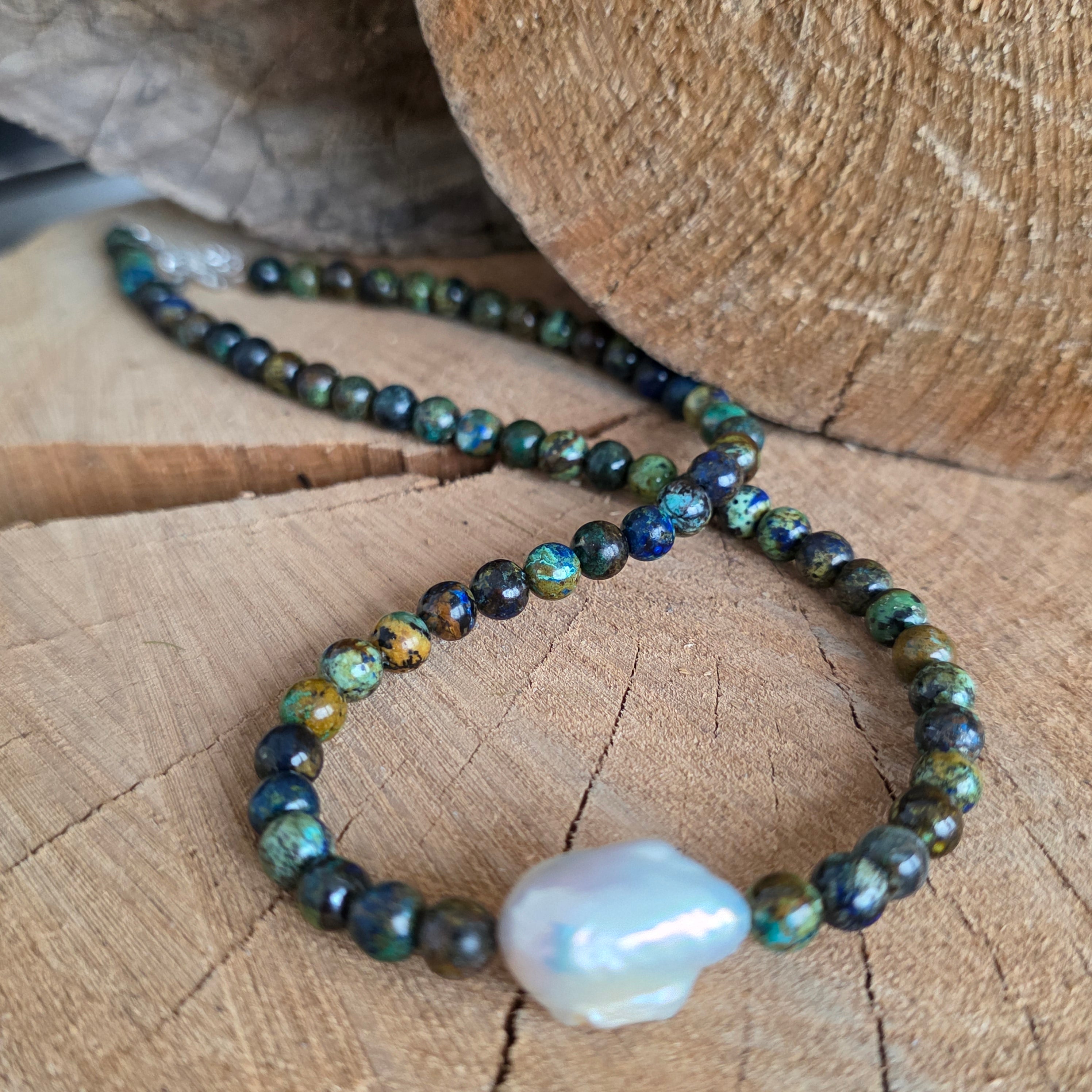 Acest colier este realizat din azurit–malachit natural, o combinație minerală spectaculoasă, apreciată pentru contrastul său intens dintre nuanțele profunde de albastru și verde. Sferele de 6 mm sunt atent selecționate pentru desenul lor natural unic, fiecare piesă prezentând variații organice care fac colierul irepetabil.