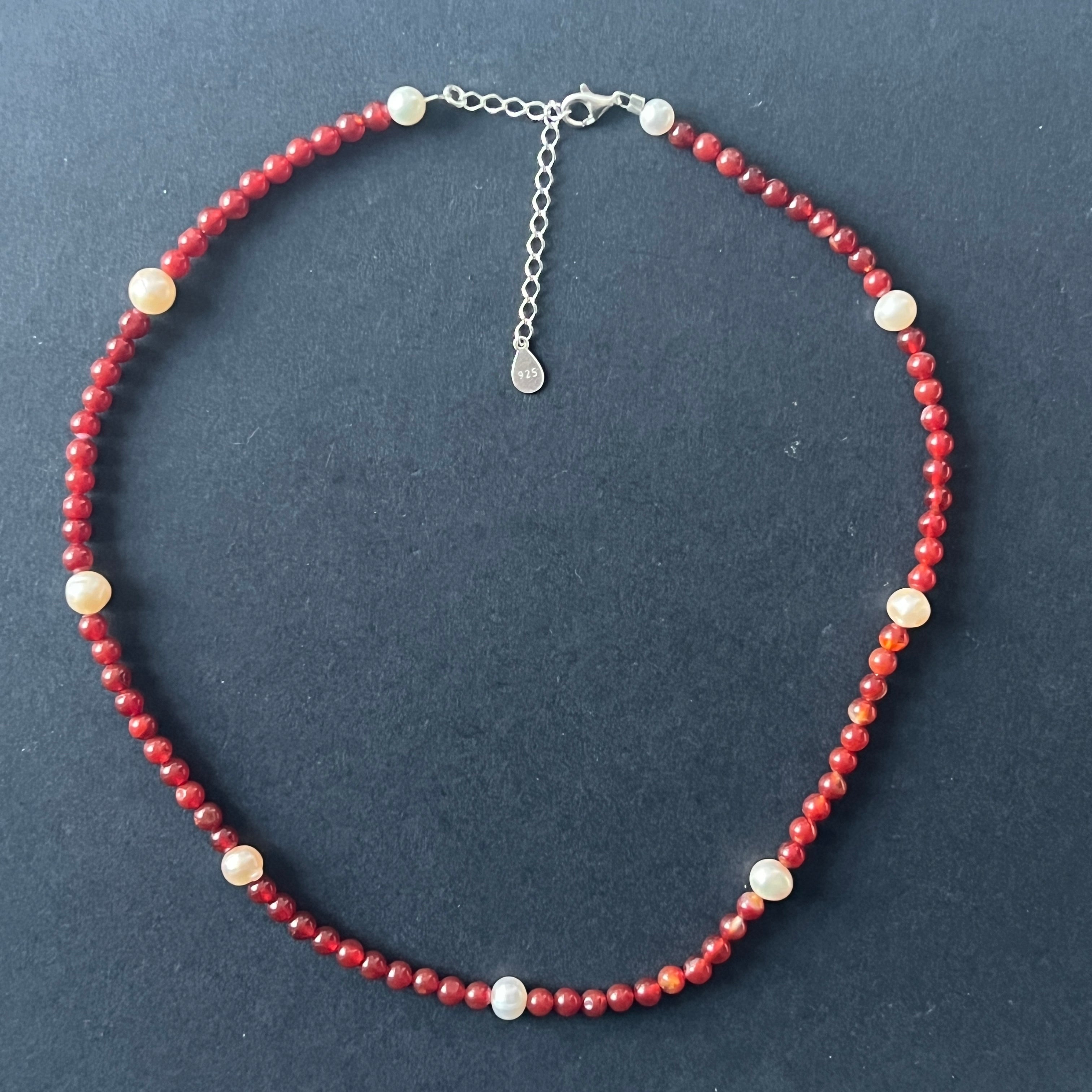 Materiale: carneol natural șlefuit, mărgele sferice de 4 mm, perle naturale de 6 mm, argint 925