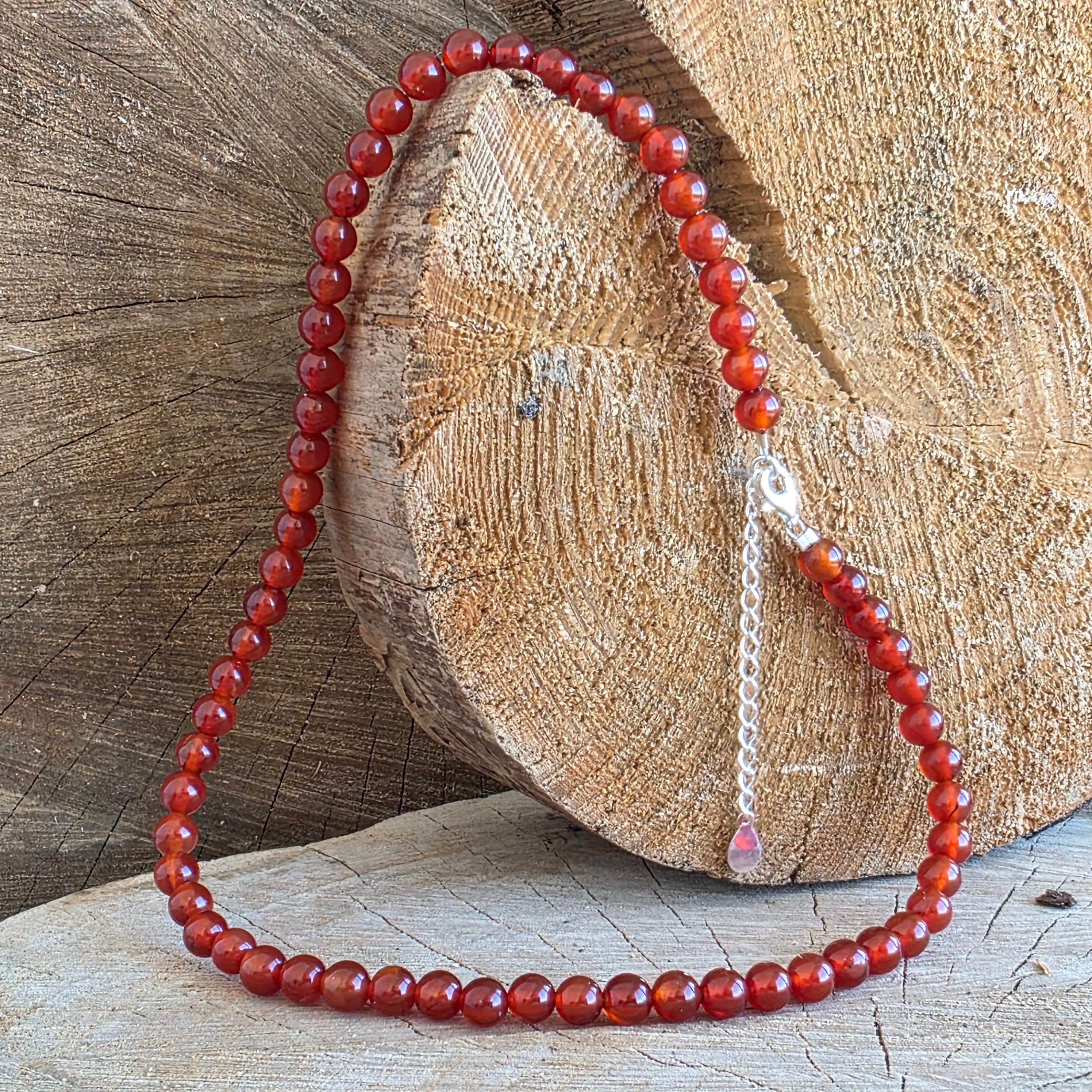 Un colier cu prezență caldă și vibrantă, realizat din sfere de carneol de 6 mm, care se așază armonios în jurul gâtului, formând o linie rotundă și echilibrată. Nuanțele bogate de portocaliu și roșu ars, uneori cu variații translucide, evidențiază caracterul viu al pietrei, iar forma sferică accentuează senzația de continuitate și fluiditate vizuală. Designul este curat și atemporal, lăsând culoarea și textura naturală a carneolului să fie în prim-plan.