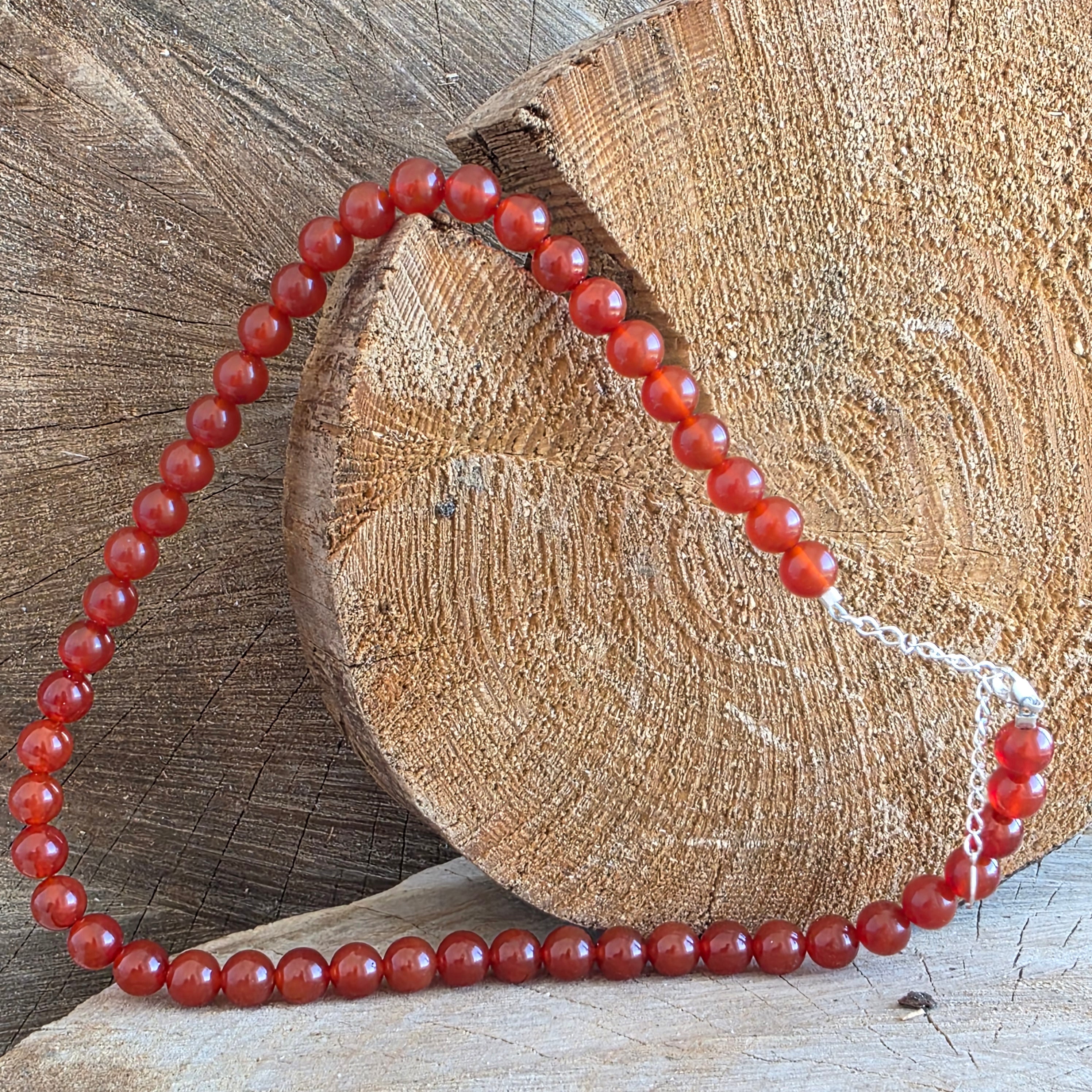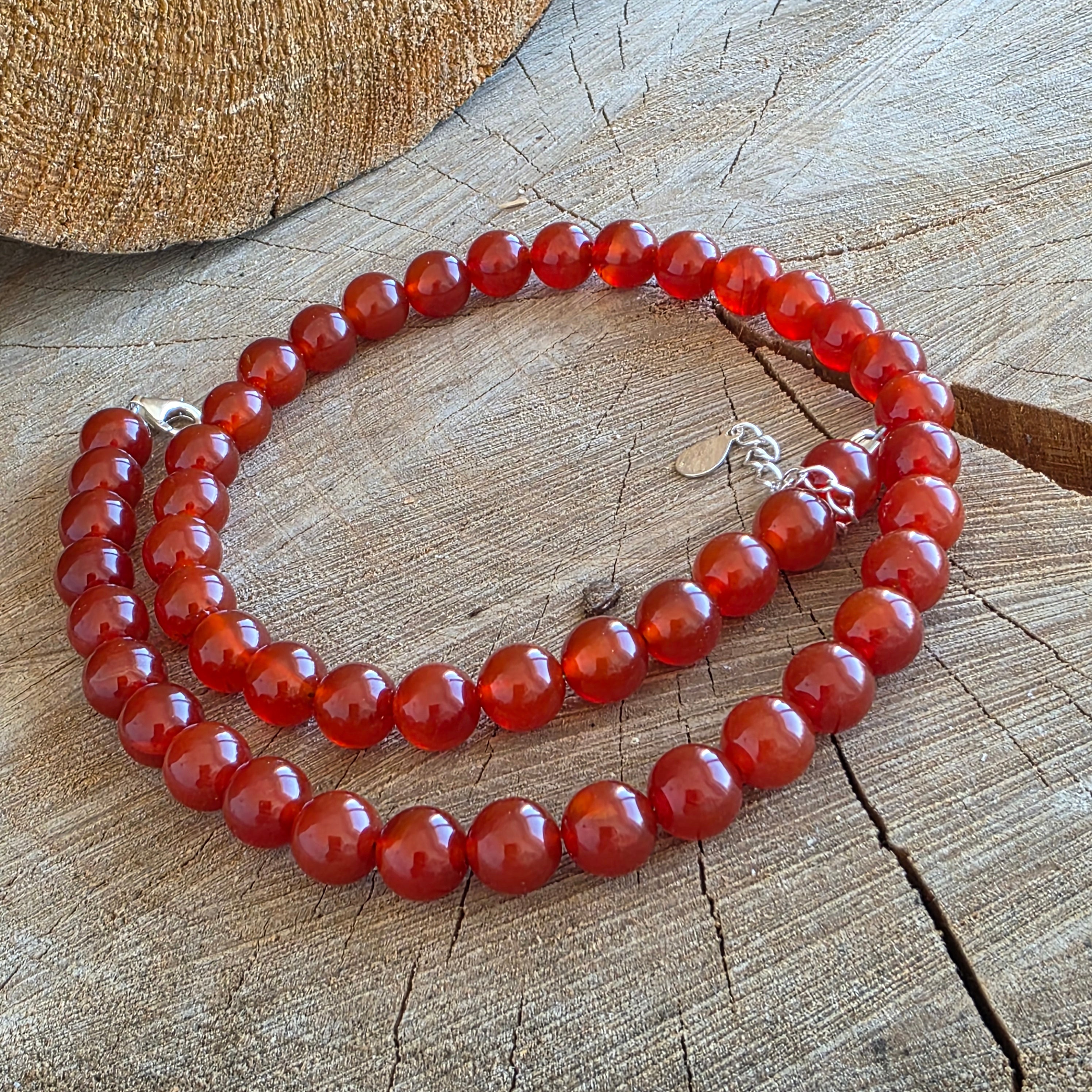 Un colier cu prezență caldă și vibrantă, realizat din sfere de carneol de 8 mm, care se așază armonios în jurul gâtului, formând o linie rotundă și echilibrată. Nuanțele bogate de portocaliu și roșu ars, uneori cu variații translucide, evidențiază caracterul viu al pietrei, iar forma sferică accentuează senzația de continuitate și fluiditate vizuală. Designul este curat și atemporal, lăsând culoarea și textura naturală a carneolului să fie în prim-plan.