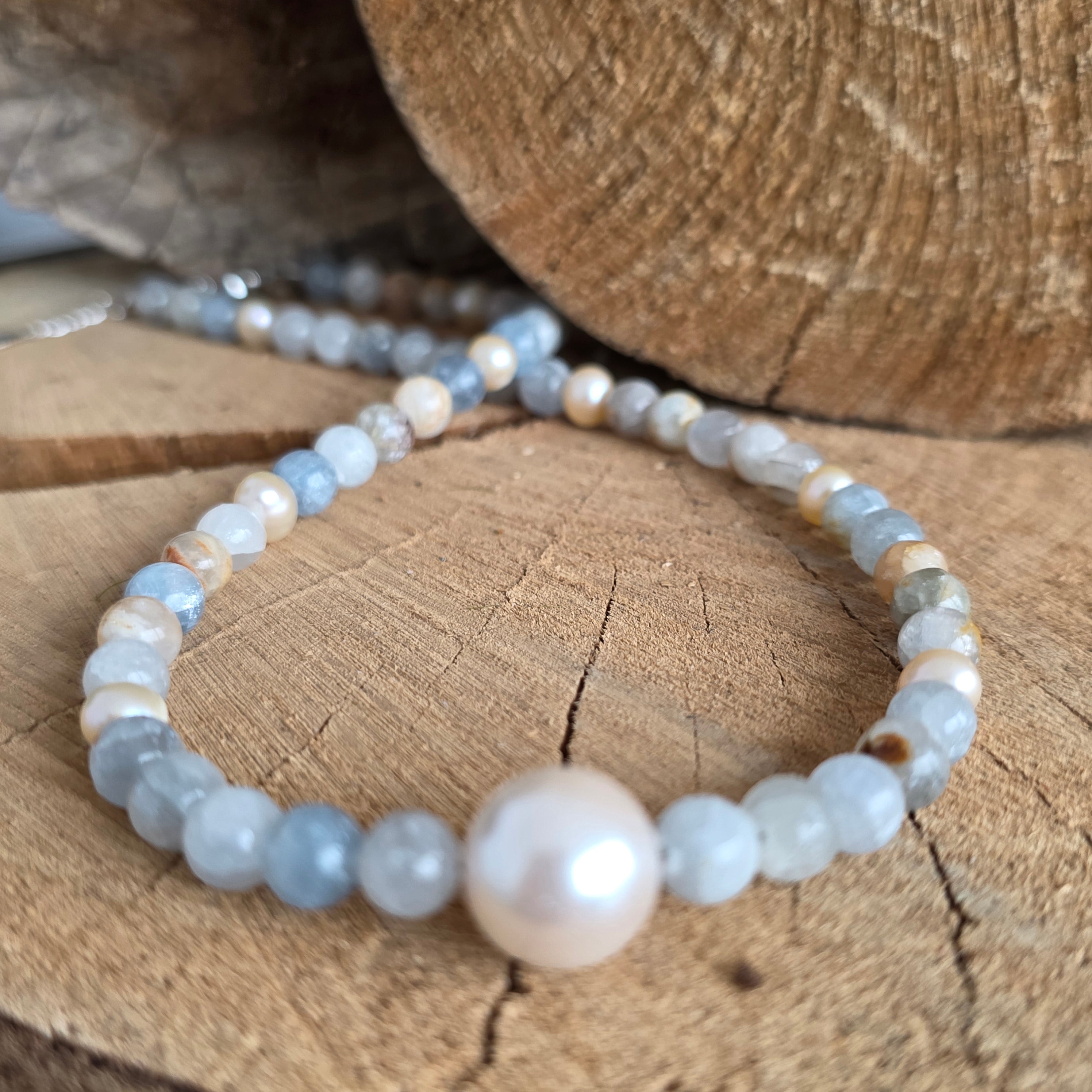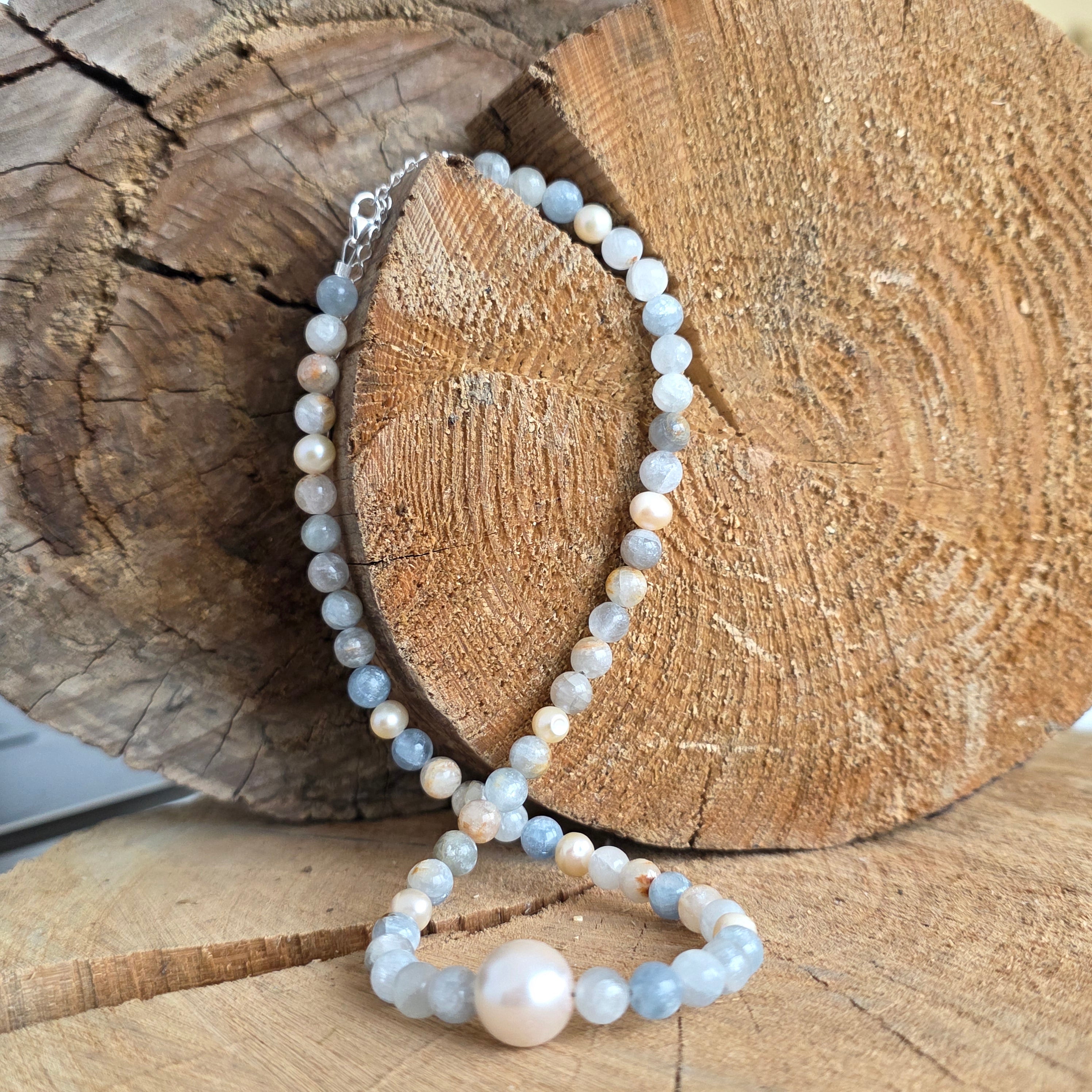 Elementul central este o perlă naturală cu diametrul de aproximativ 1 cm, care adaugă un accent elegant și luminos, creând un contrast armonios cu tonurile reci și liniștitoare ale celestitului. Împreună, aceste elemente formează o bijuterie echilibrată, cu un design rafinat, potrivit atât pentru purtarea zilnică, cât și pentru momente speciale.
