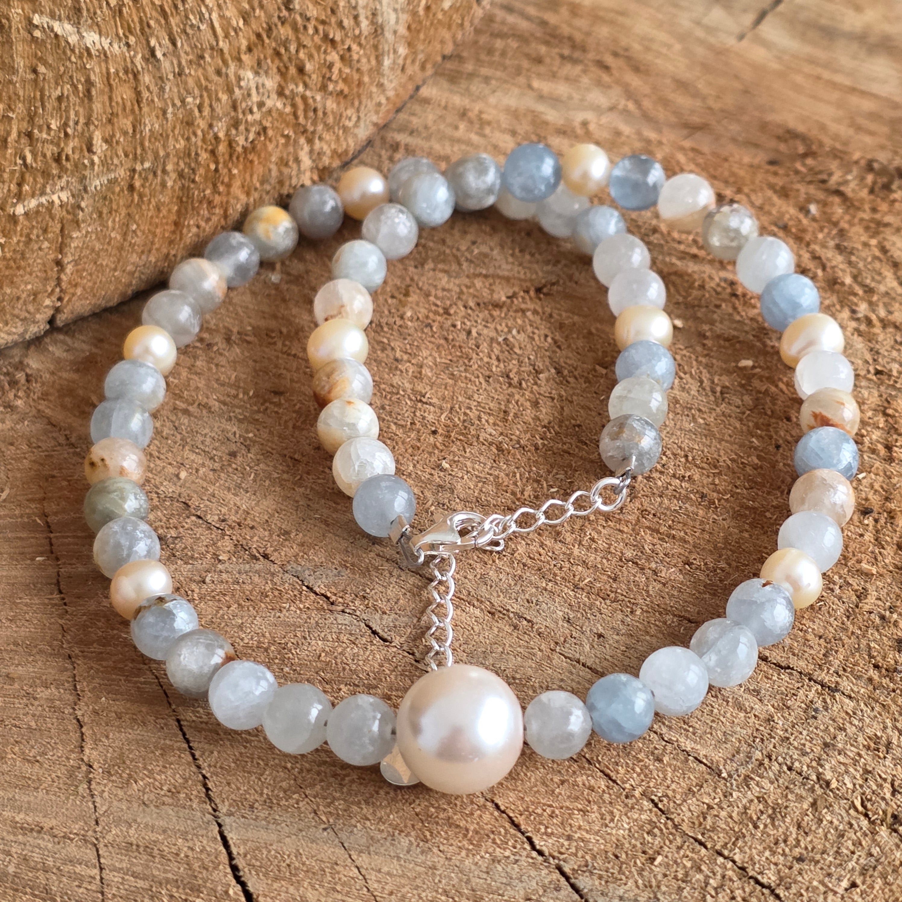 Materiale: sfere naturale celestit 6 mm, argint 925, perla 1 cm