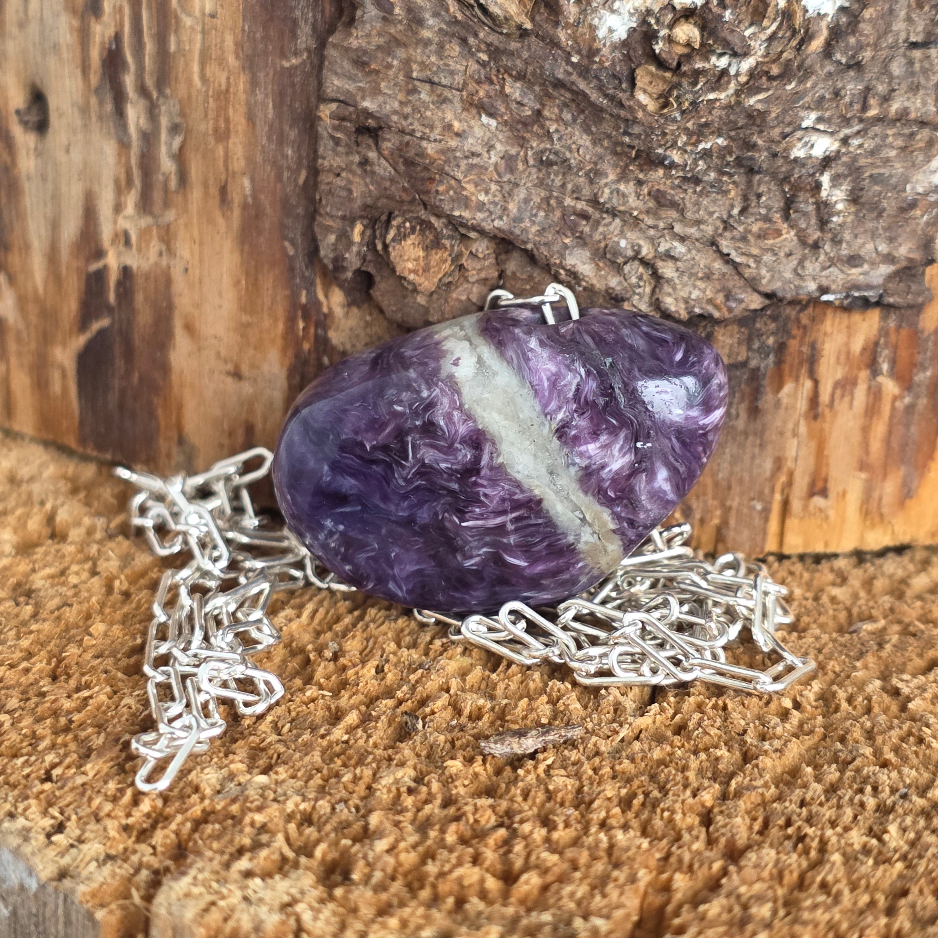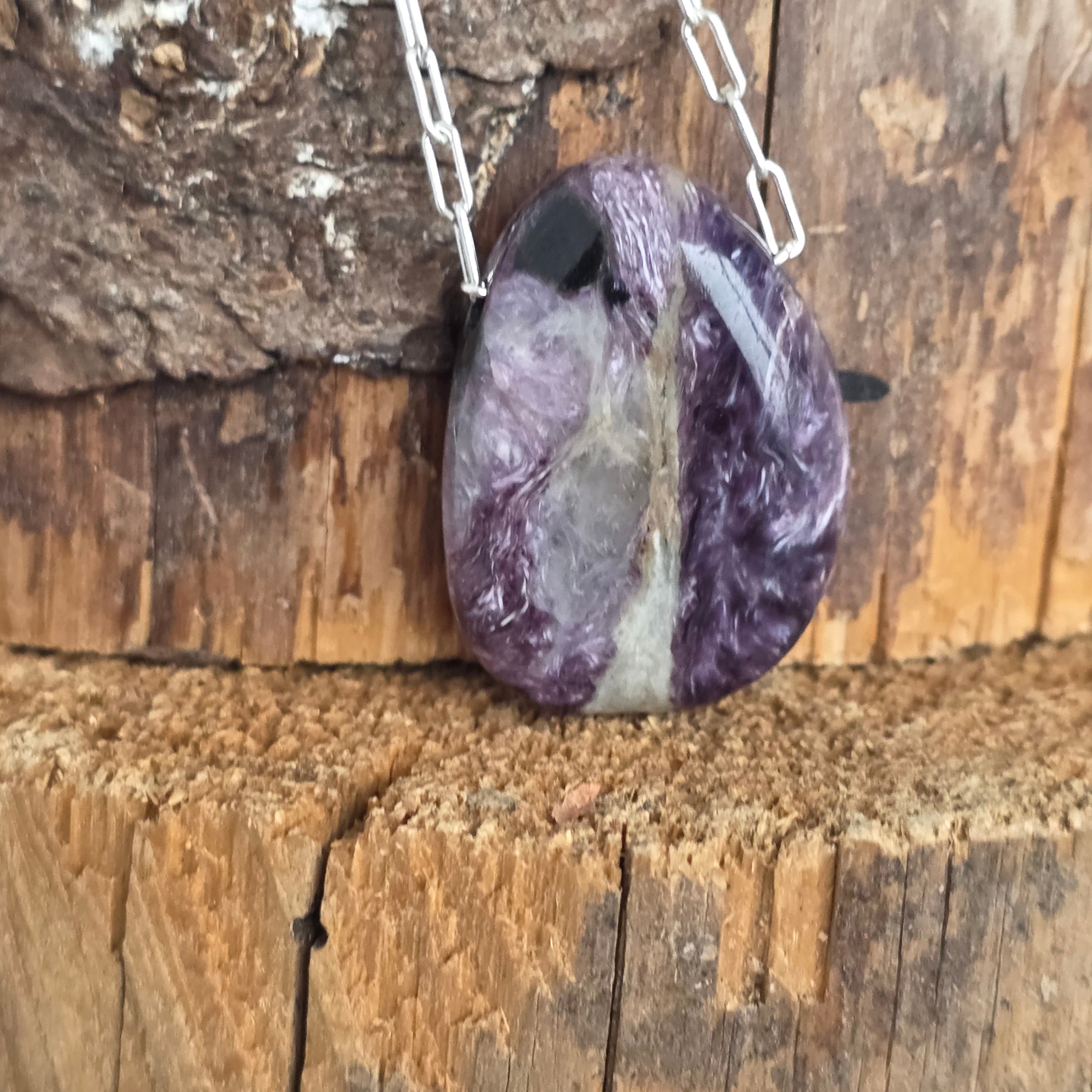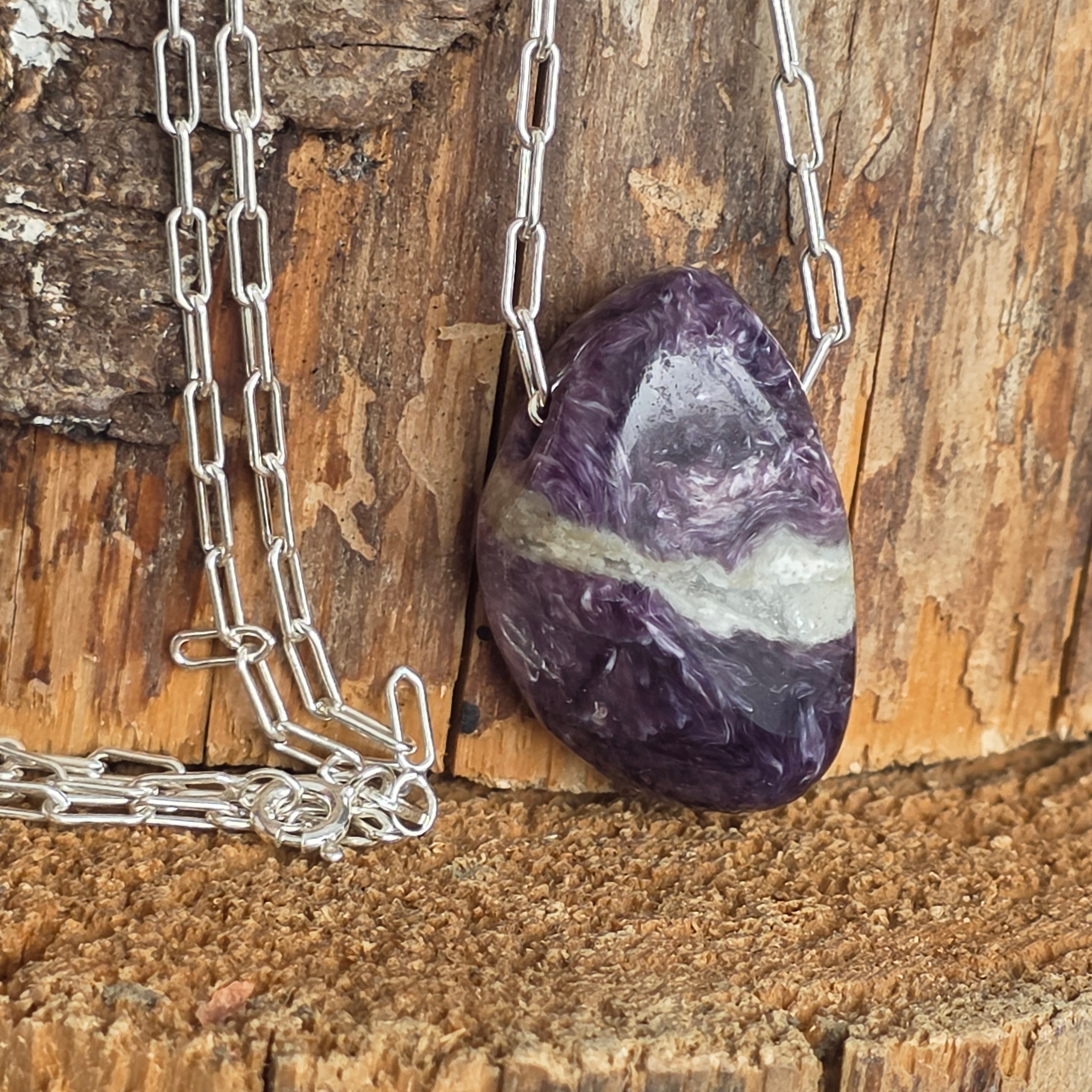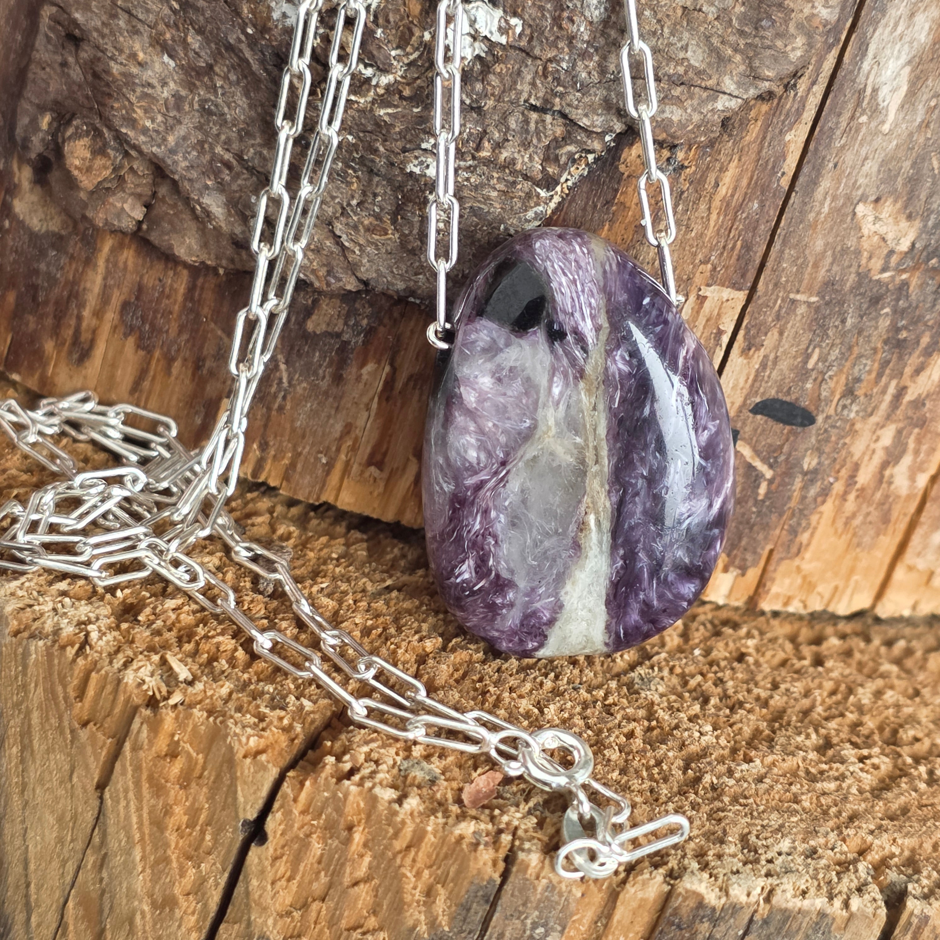 Materiale: charoit natural, pandantiv tip DROP 2,5–2,7 cm, lanț din argint 925 - dimensiune aprox 55-60 cm.