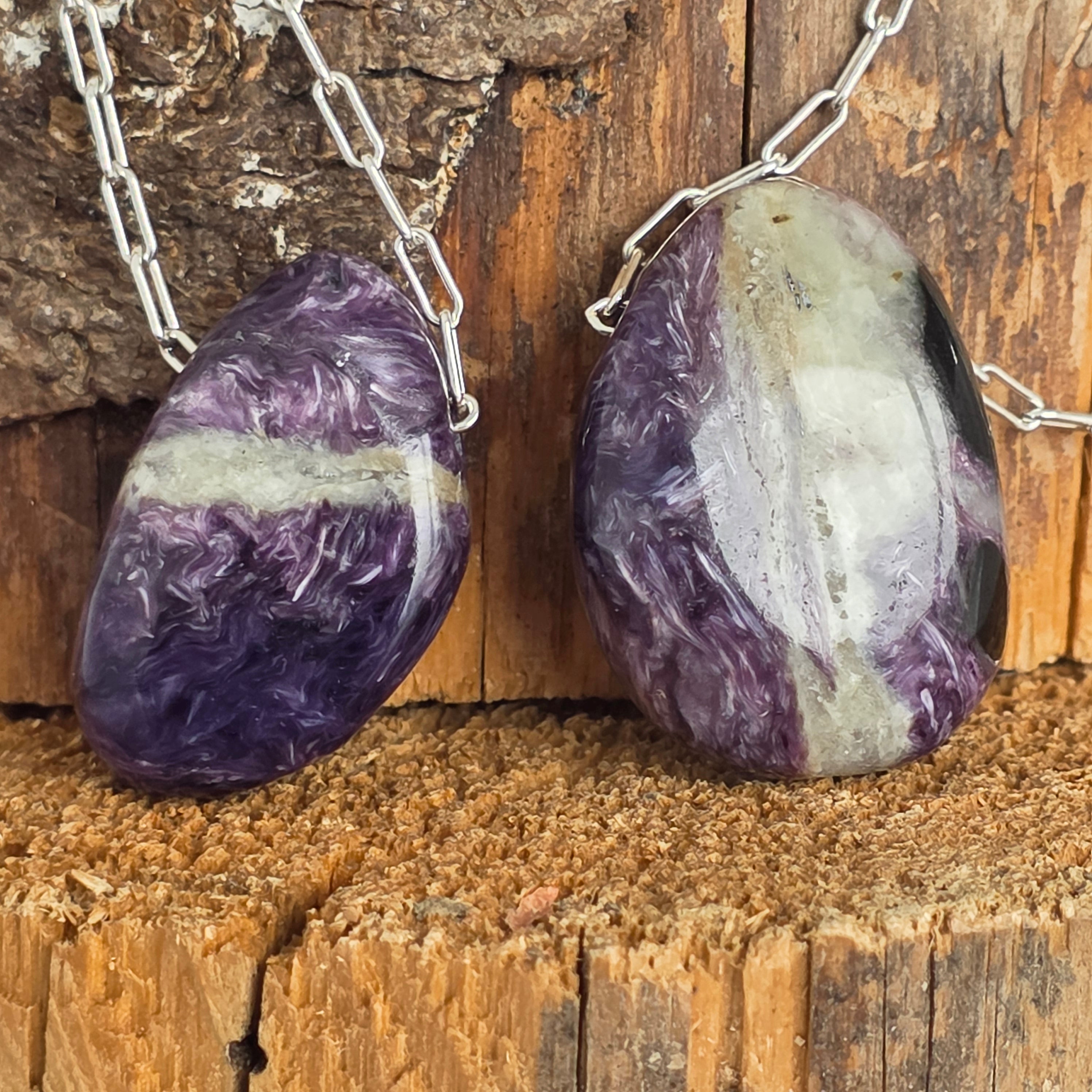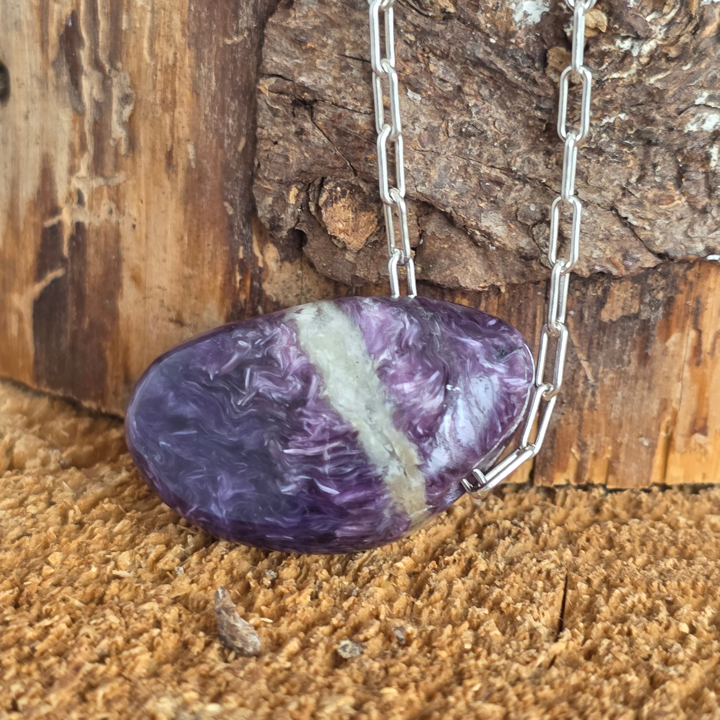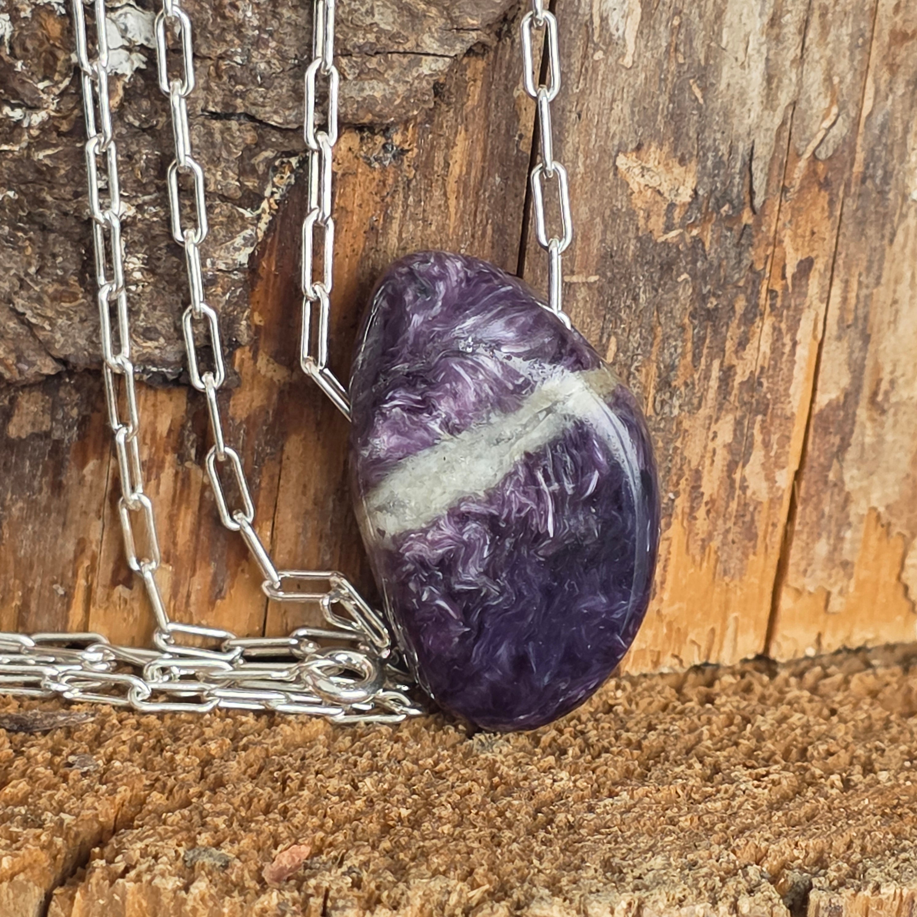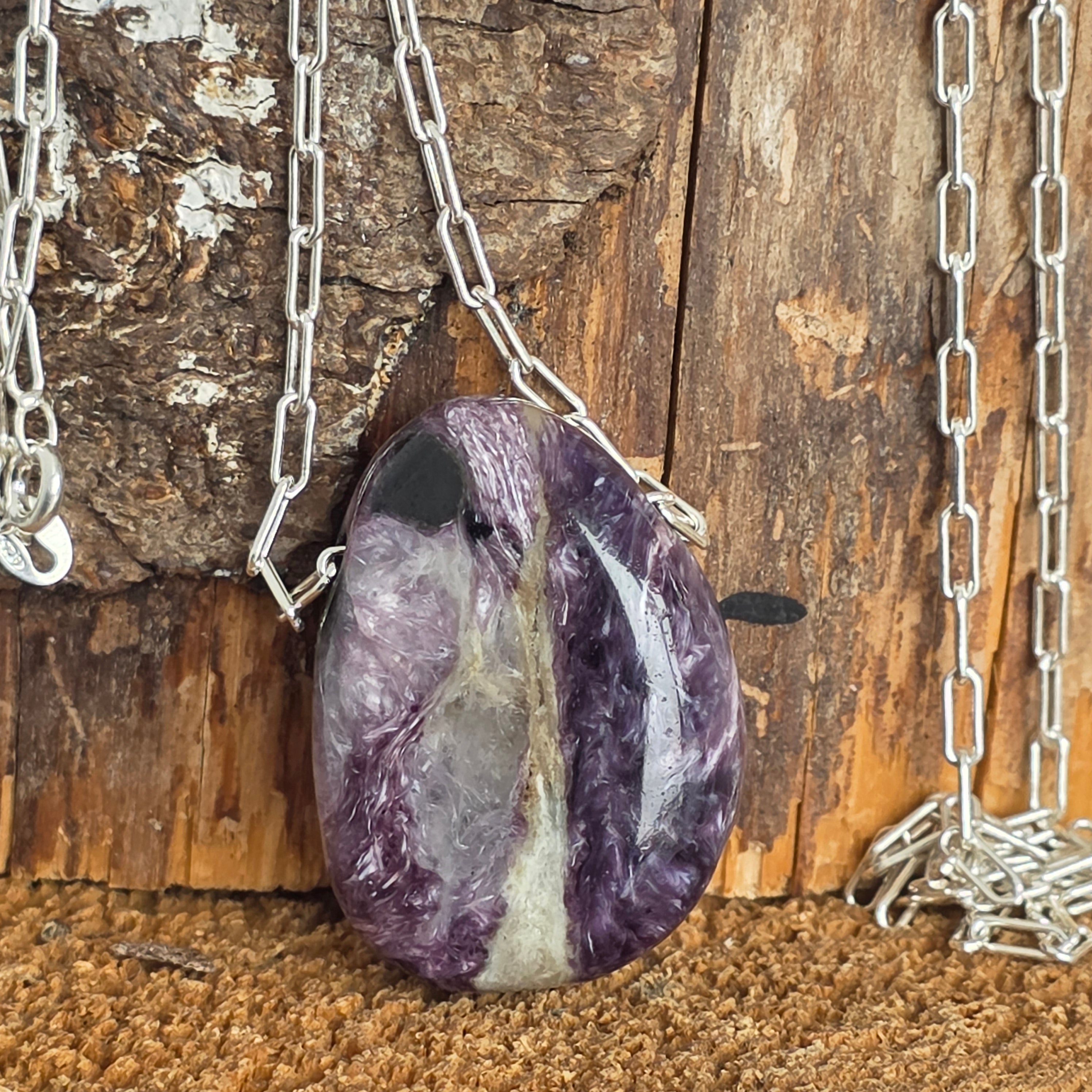 Materiale: charoit natural, pandantiv tip DROP 2,5–2,7 cm, lanț din argint 925 - dimensiune aprox 55-60 cm.
