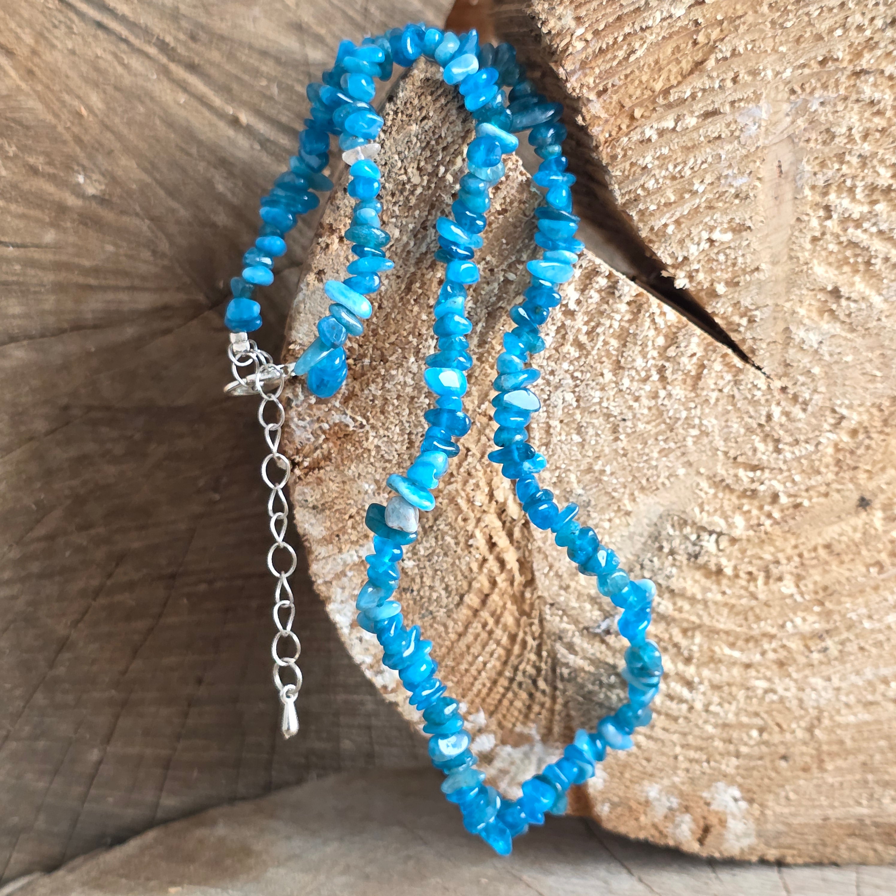 Adaugă un plus de culoare și energie ținutelor tale cu acest colier realizat din chipsuri naturale de apatit de culoare vibranta, montate pe un lanț fin de 40 cm, cu prelungire metalică de 5 cm pentru ajustare perfectă.