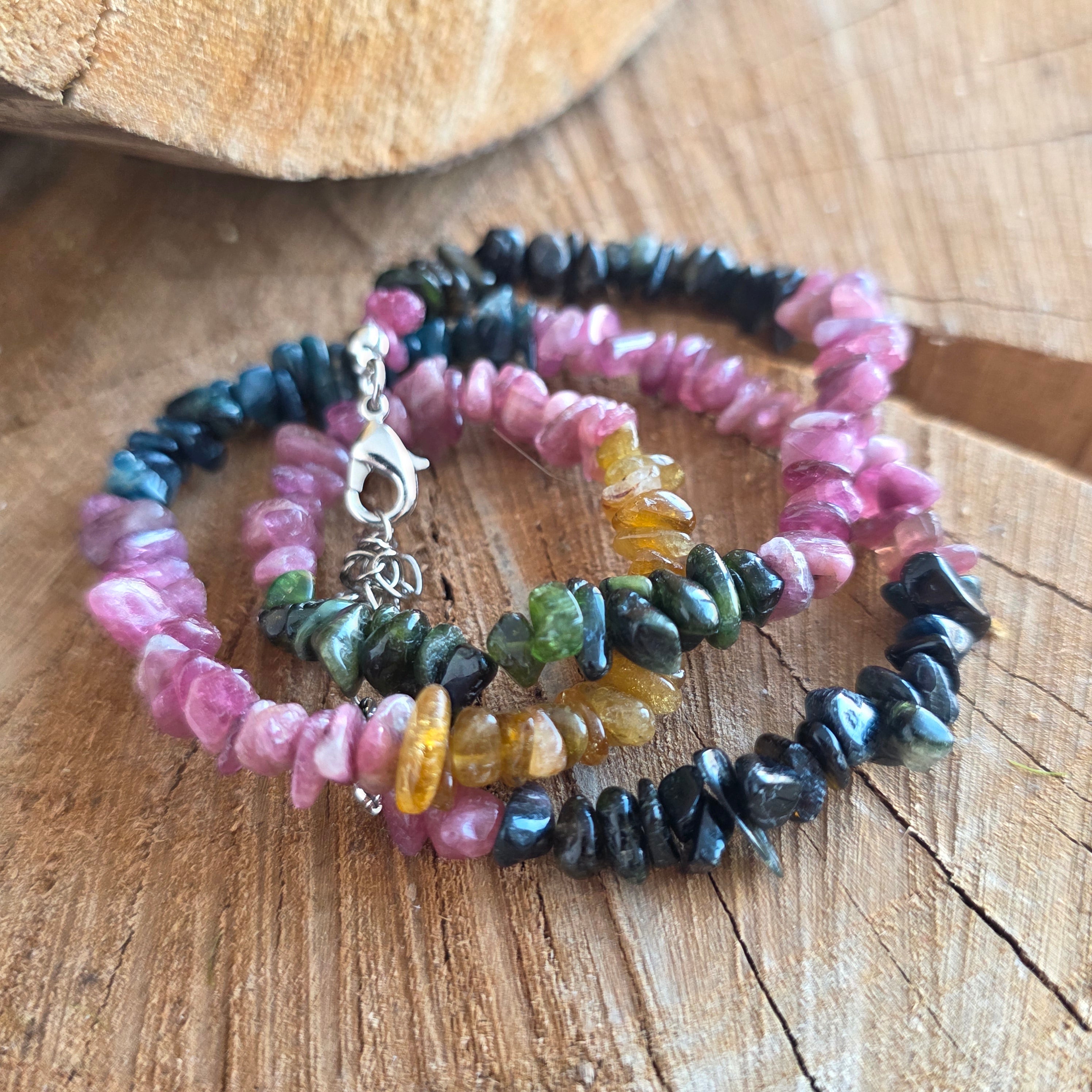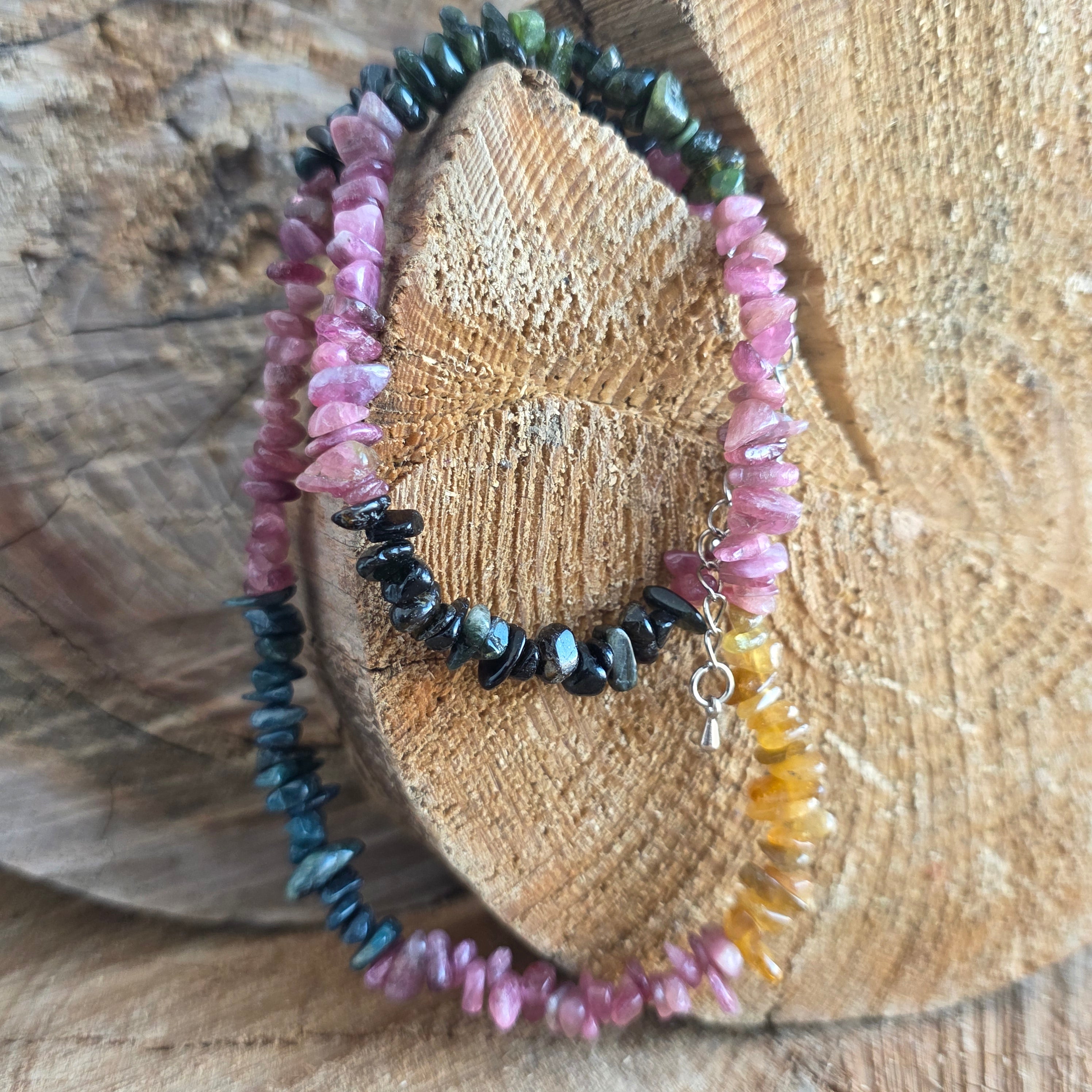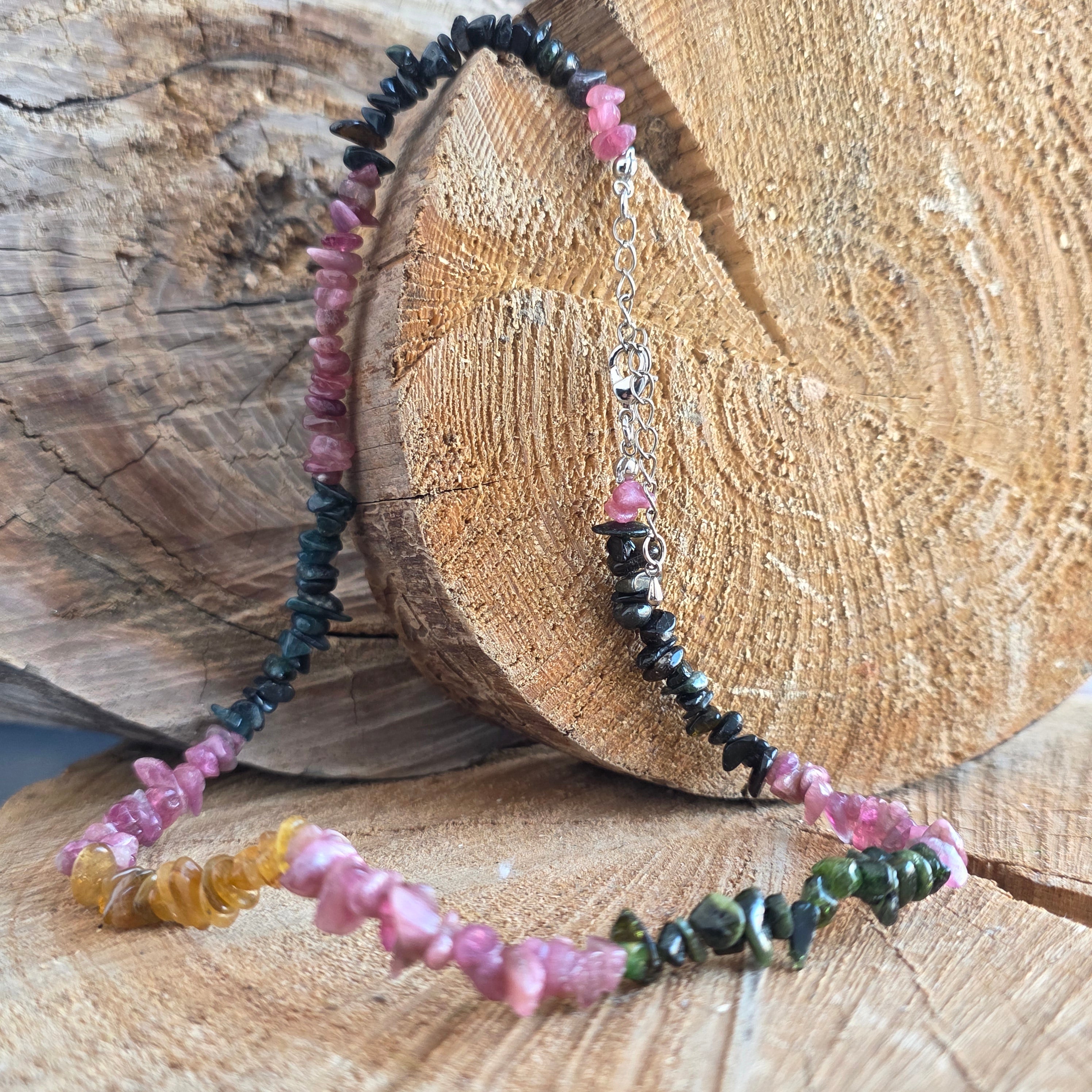 • Piatra: turmalină naturală mix – chipsuri (roz, verde, galben), finisaj lustruit