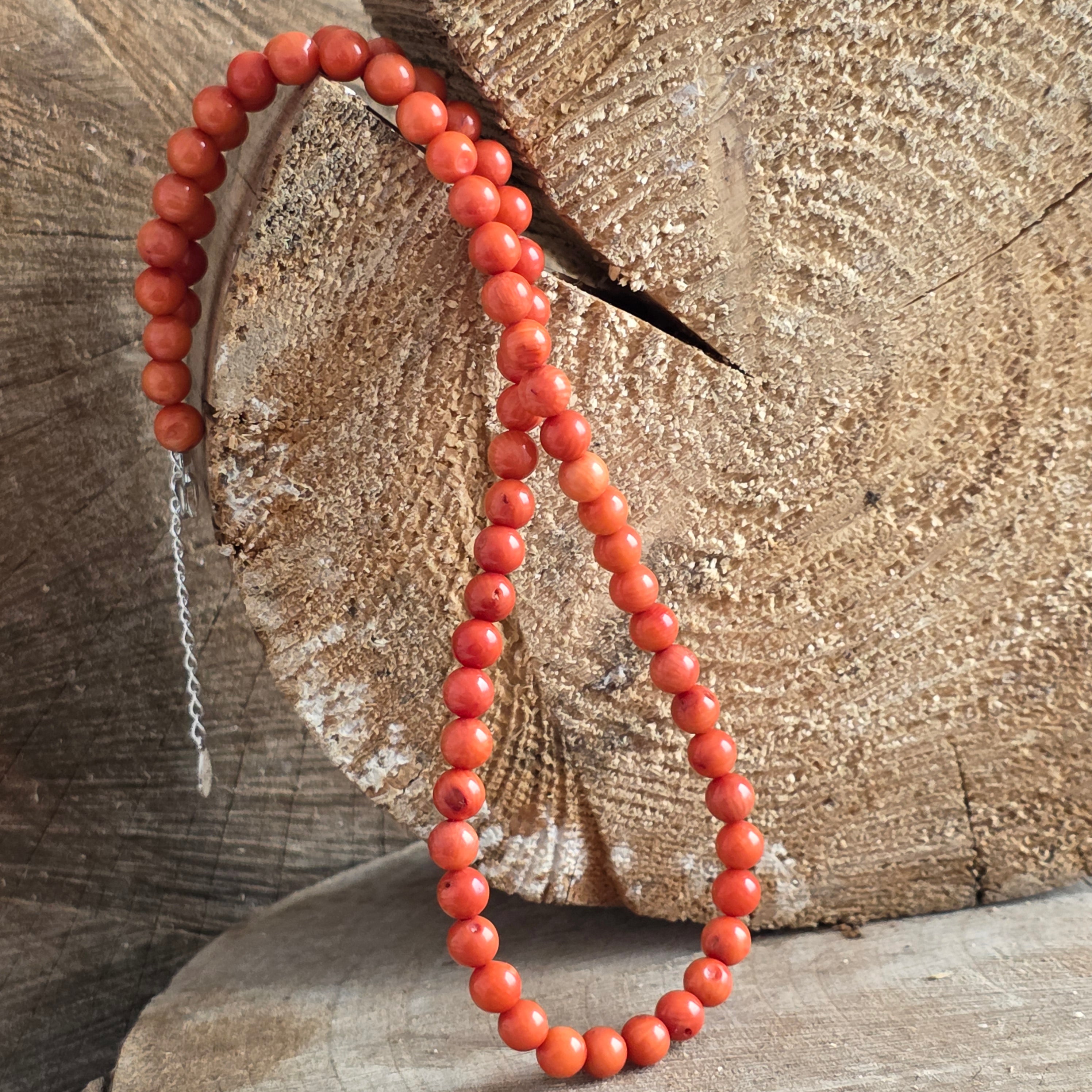 Materiale: coral portocaliu natural, mărgele sferice de 6 mm, argint 925