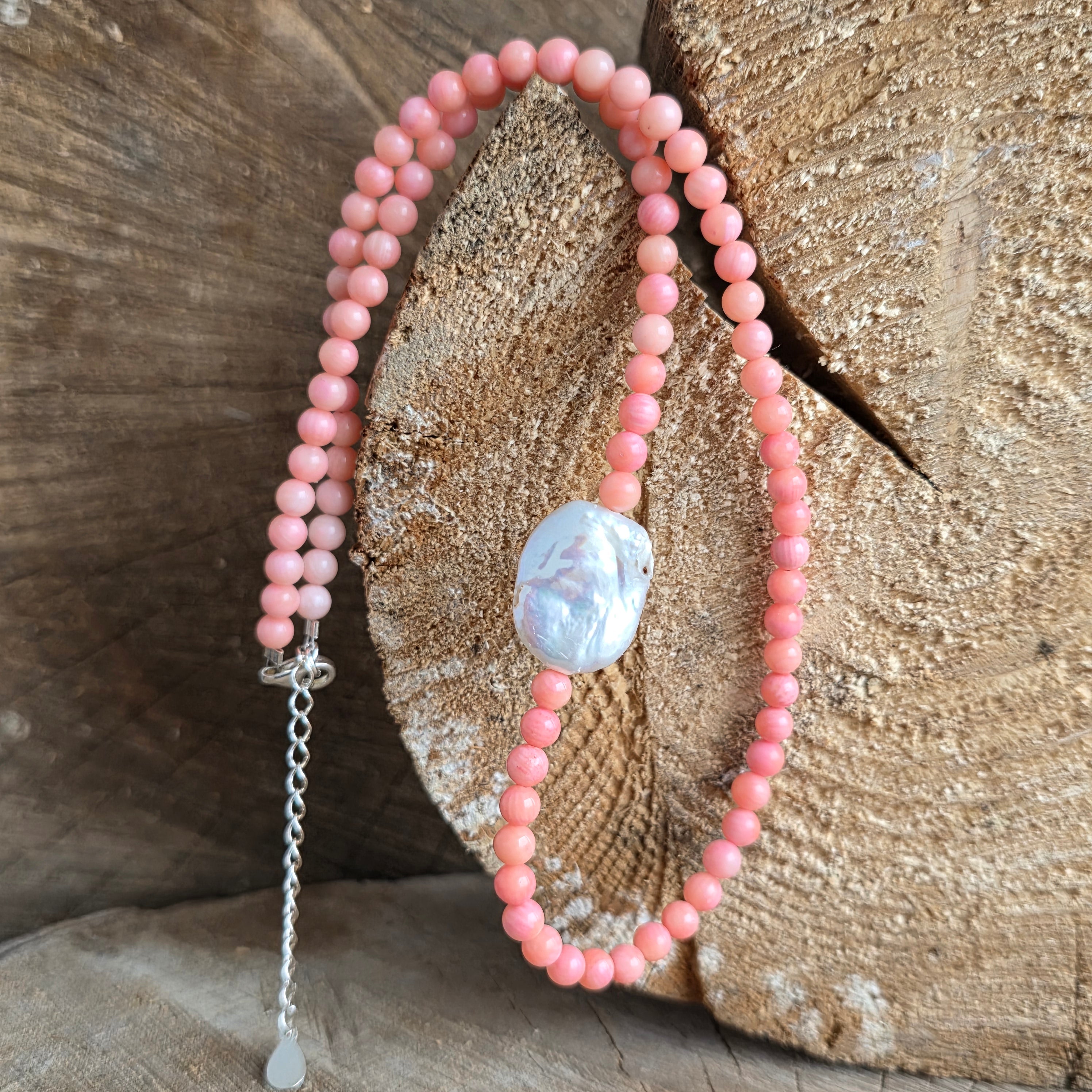 Materiale: coral roz natural (sfere de 4 mm), perlă naturală dreptunghiulară (aprox. 2 cm), argint 925