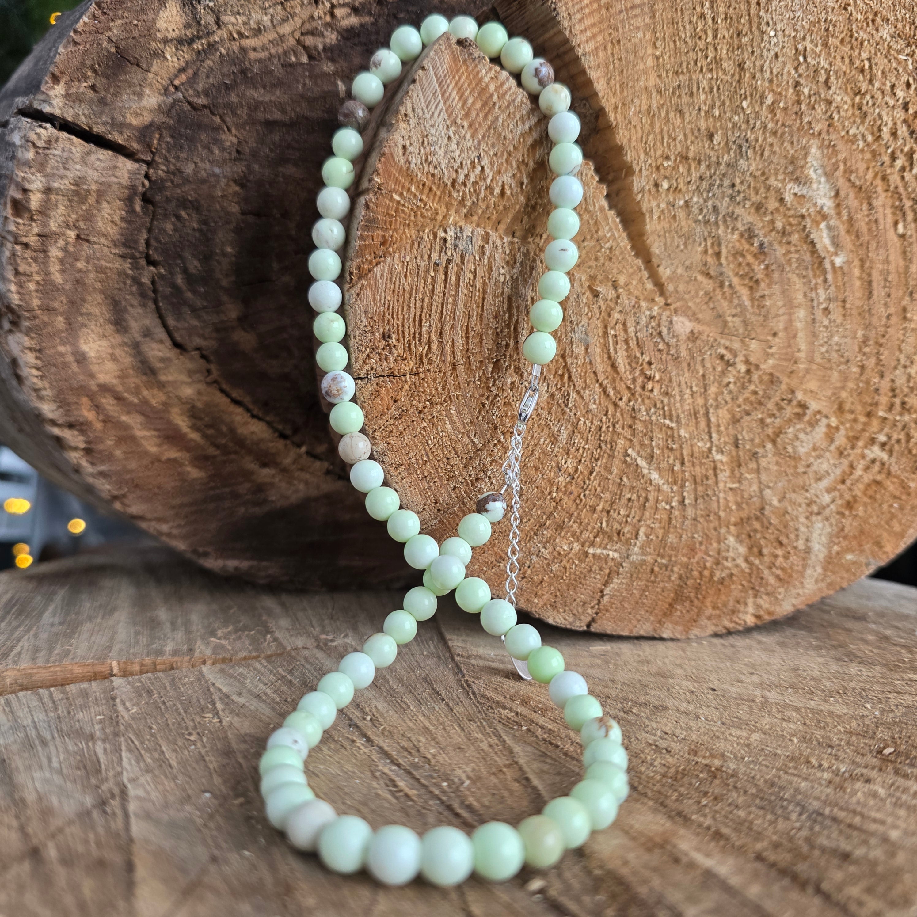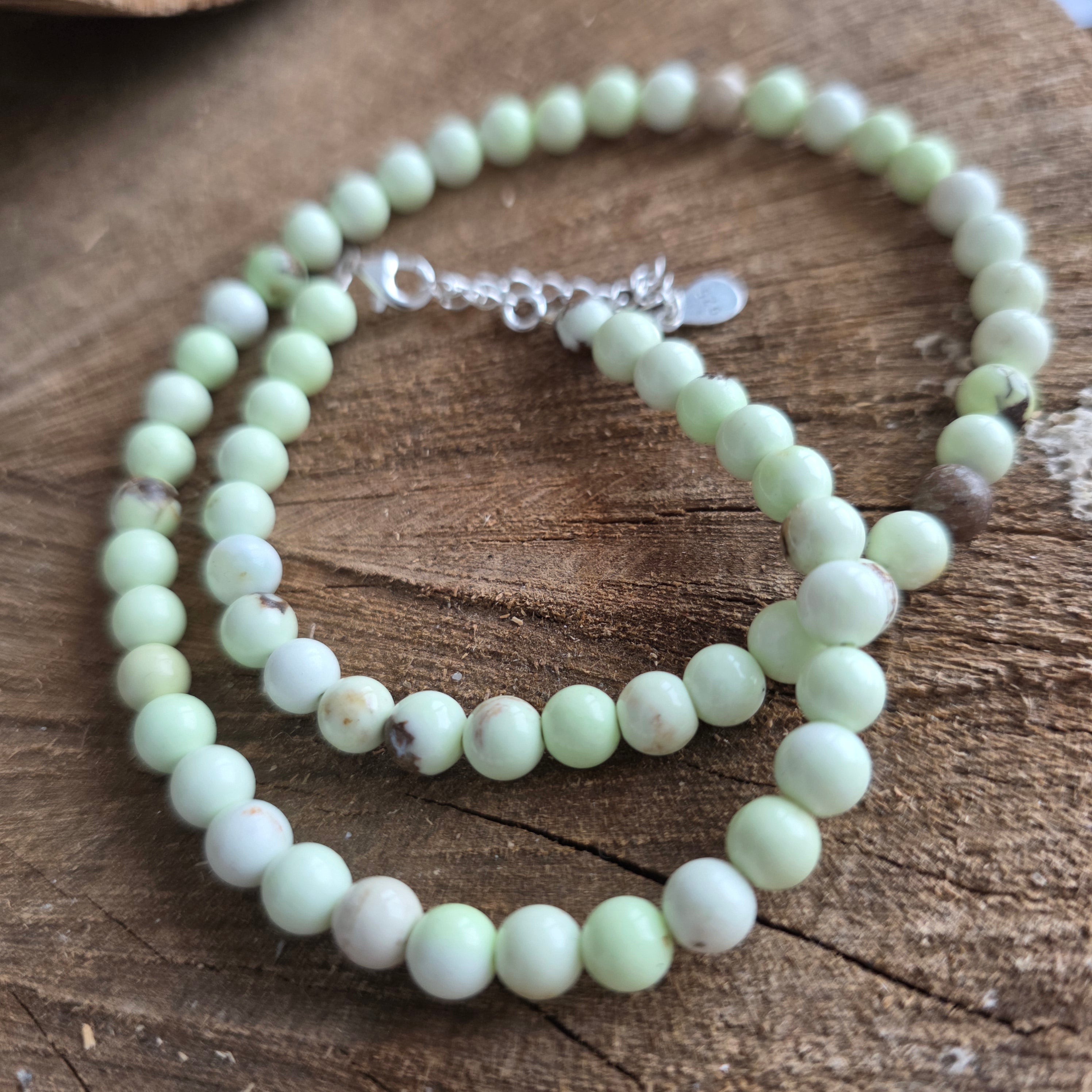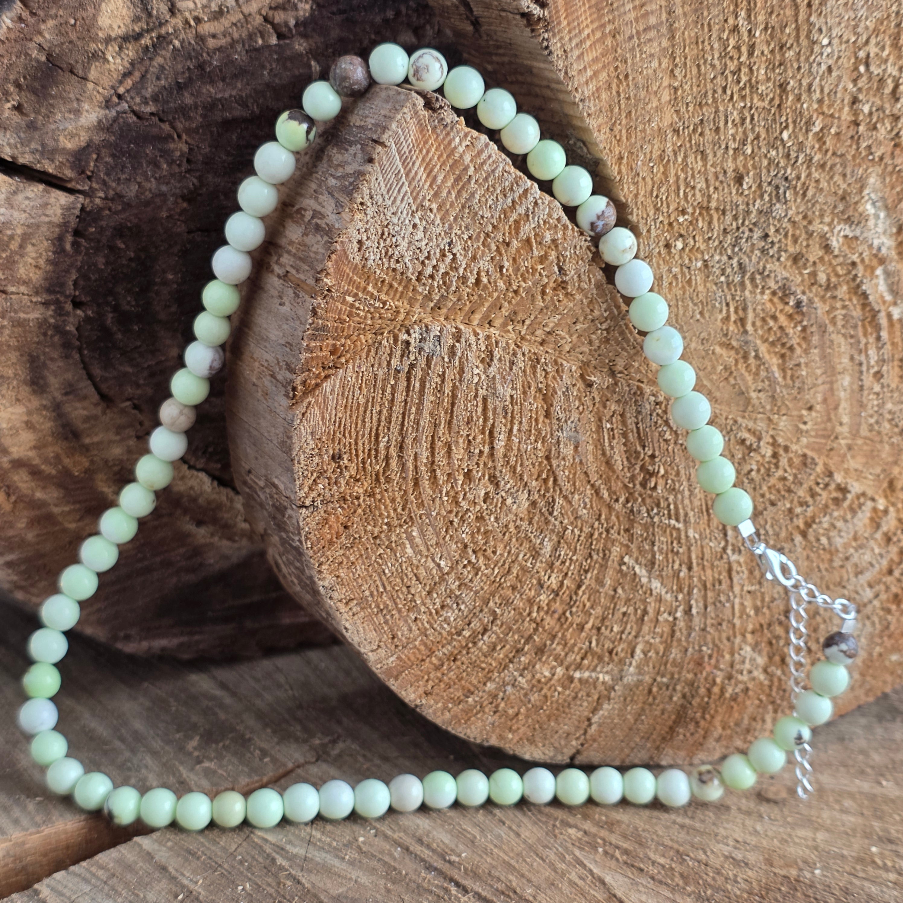 Un colier luminos și proaspăt, inspirat de nuanțele fragede ale primăverii. Sferele de crisopraz natural de 6 mm aduc o tentă delicată de verde-gălbui pal, cu o transparență fină care captează subtil lumina. Tonul său suav oferă bijuteriei un aer natural, optimist și elegant, ușor de integrat atât în ținute minimaliste, cât și în combinații mai sofisticate.