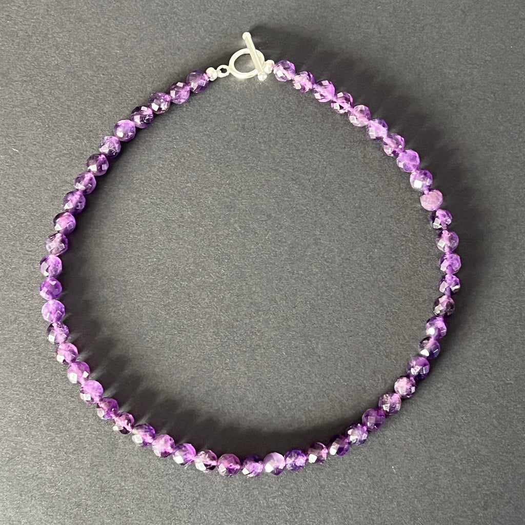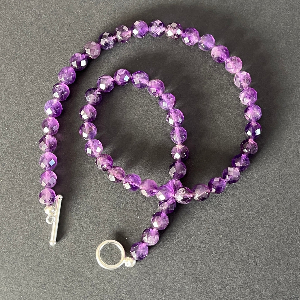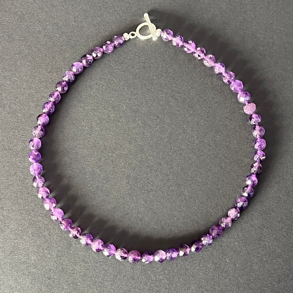 Un colier ce îmbină eleganța cu profunzimea, asemenea unei lumini care se frânge în cristalele violet ale amurgului. Fiecare sferă fațetată de ametist natural de 8 mm captează și reflectă lumina, dând naștere unui dans subtil de străluciri, ca o amintire a misterului și nobleței interioare.