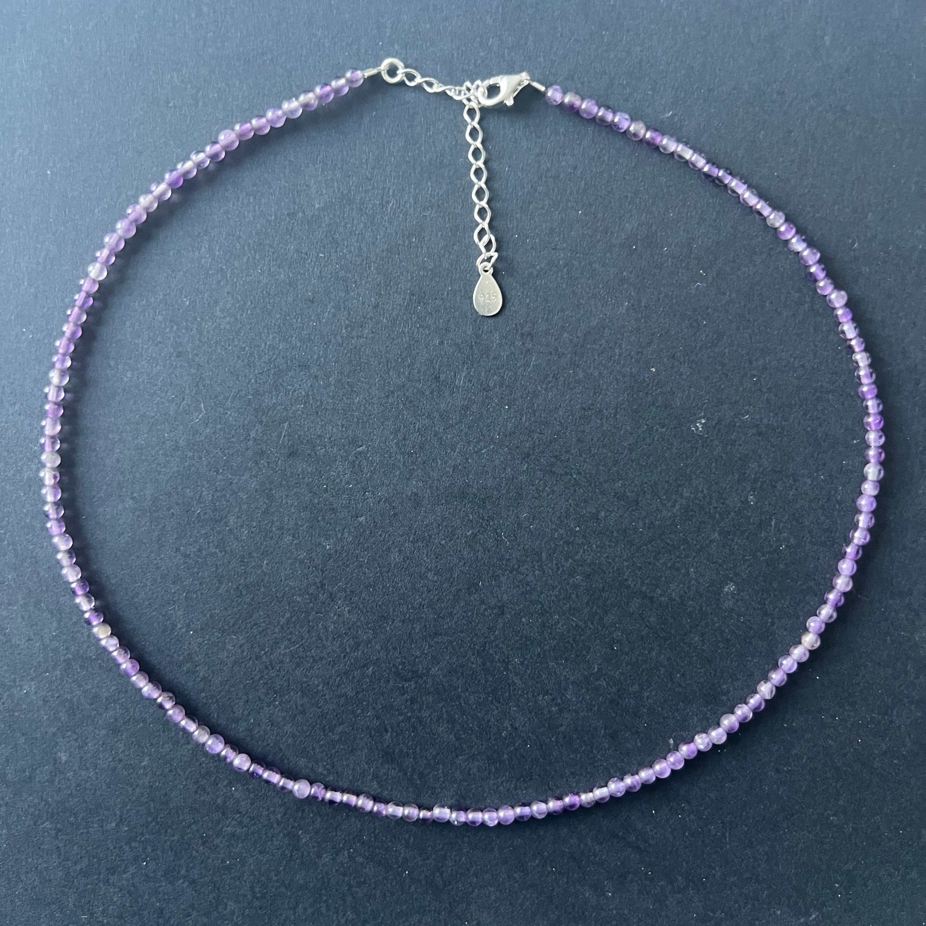 Un colier delicat, cu vibrația calmă a purității și eleganței naturale. Mărgelele fine de ametist natural de 3 mm se așază armonios pe linia gâtului, reflectând lumina într-o strălucire blândă, aproape eterică.