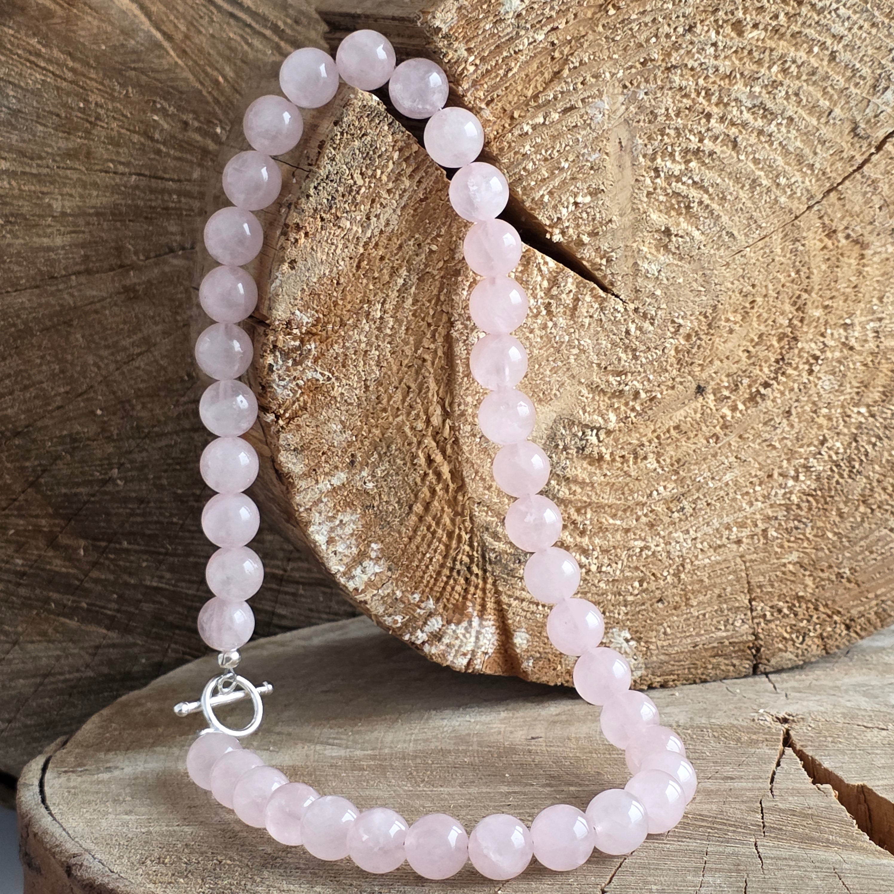 Materiale: cuarț roz natural șlefuit (sfere de 10 mm ), închidere din argint