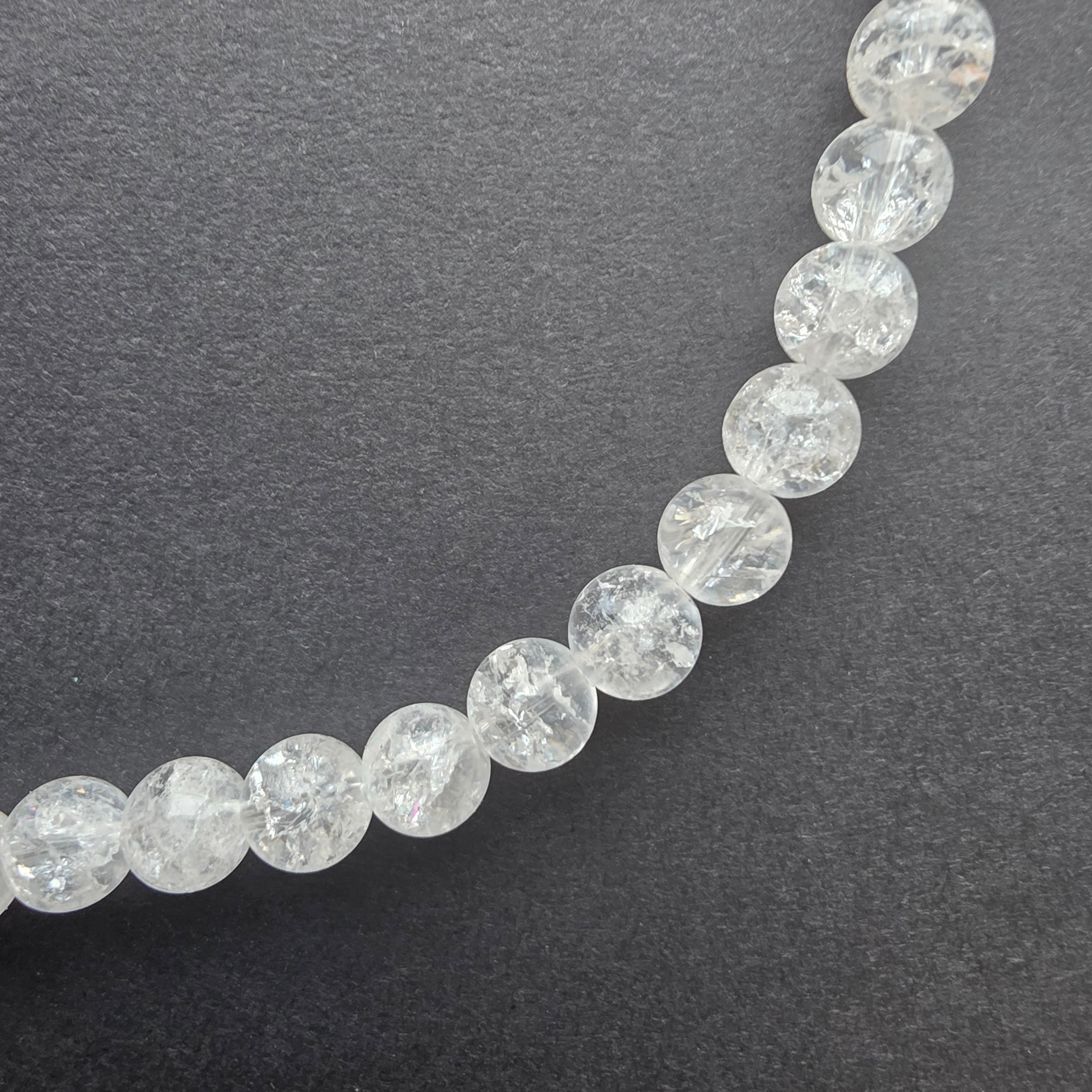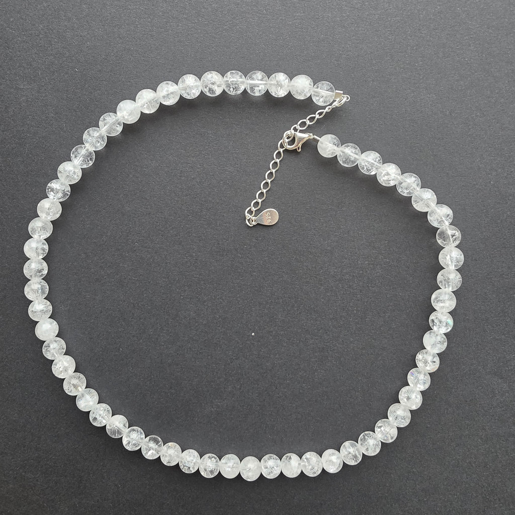 Un colier care surprinde esența liniștii cristaline — un echilibru între fragilitate și forță. Cuartul incolor „crashed”, cu texturile sale interne unice, pare un univers prins în sticlă, în care lumina se multiplică și se transformă. Fiecare sferă de 6 mm este un mic miracol al transparenței, purtând o frumusețe senină, rece și limpede.