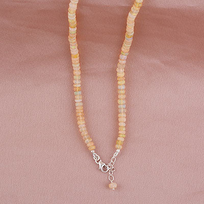Un colier elegant și plin de lumină, realizat din opal etiopian natural, cu reflexe delicate în nuanțe de auriu, verde și albastru. Fiecare mărgea fațetată reflectă lumina într-un mod unic, creând un joc subtil de culori.