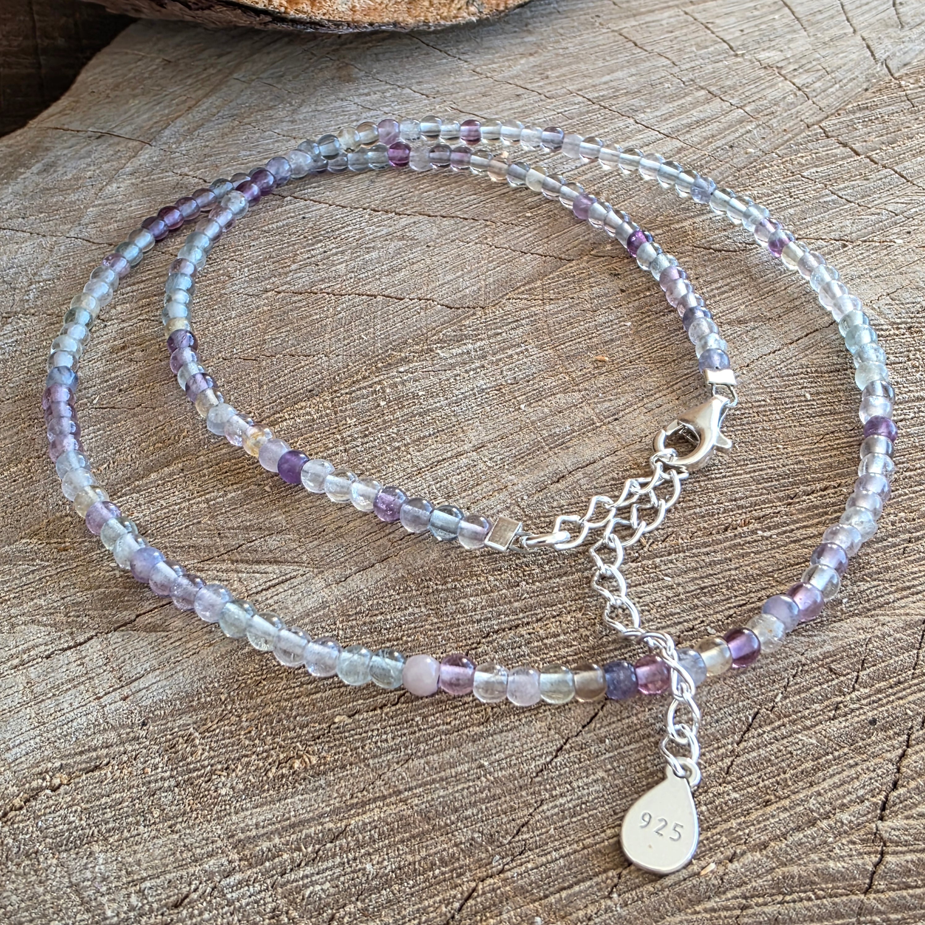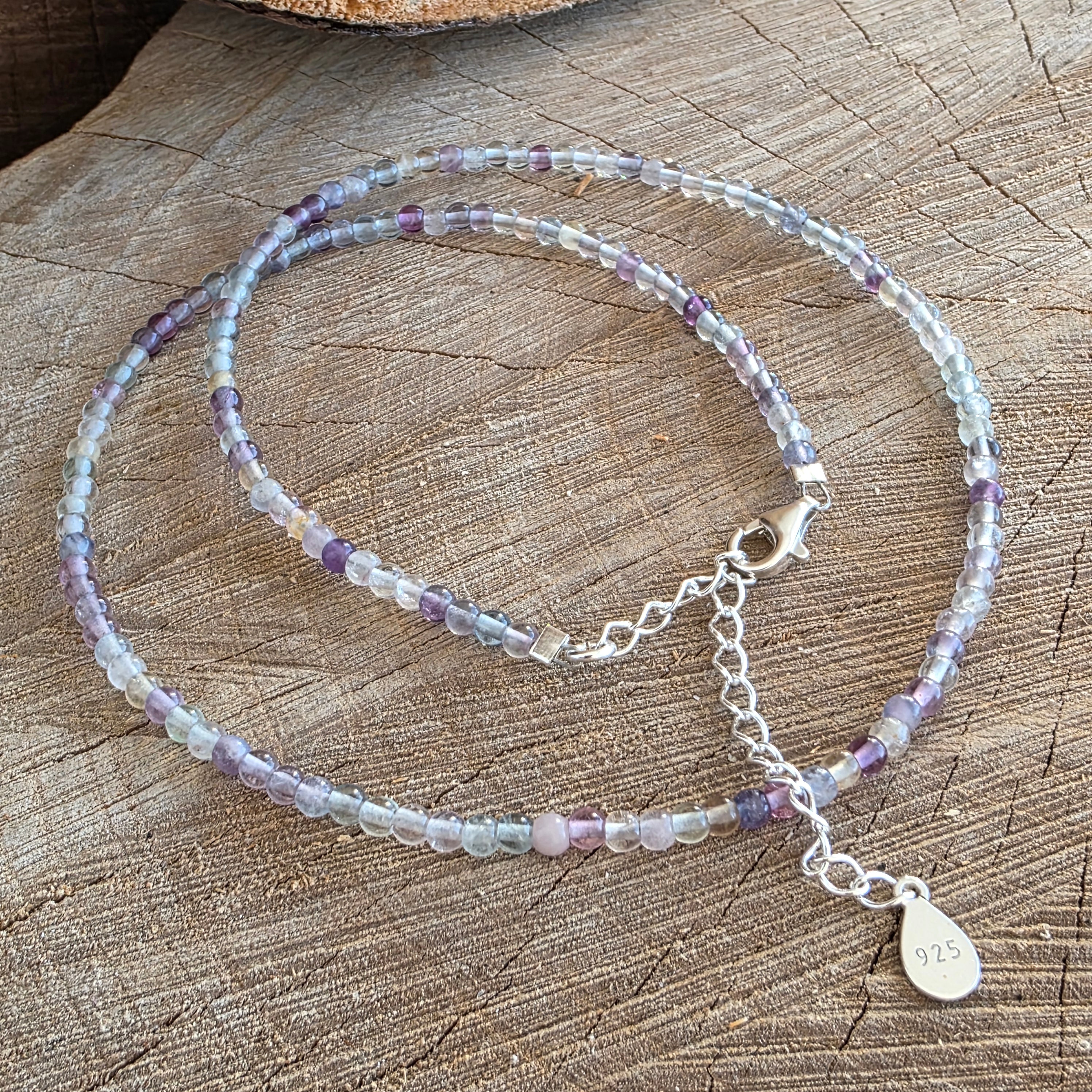 Un colier ca o fereastră deschisă spre lumină – viu, clar, jucăuș și profund în același timp. Mărgelele fațetate de fluorit curcubeu de 3 mm strălucesc în nuanțe care dansează între violet, verde, albastru și roz, ca o punte între emoție și rațiune, între vis și luciditate.