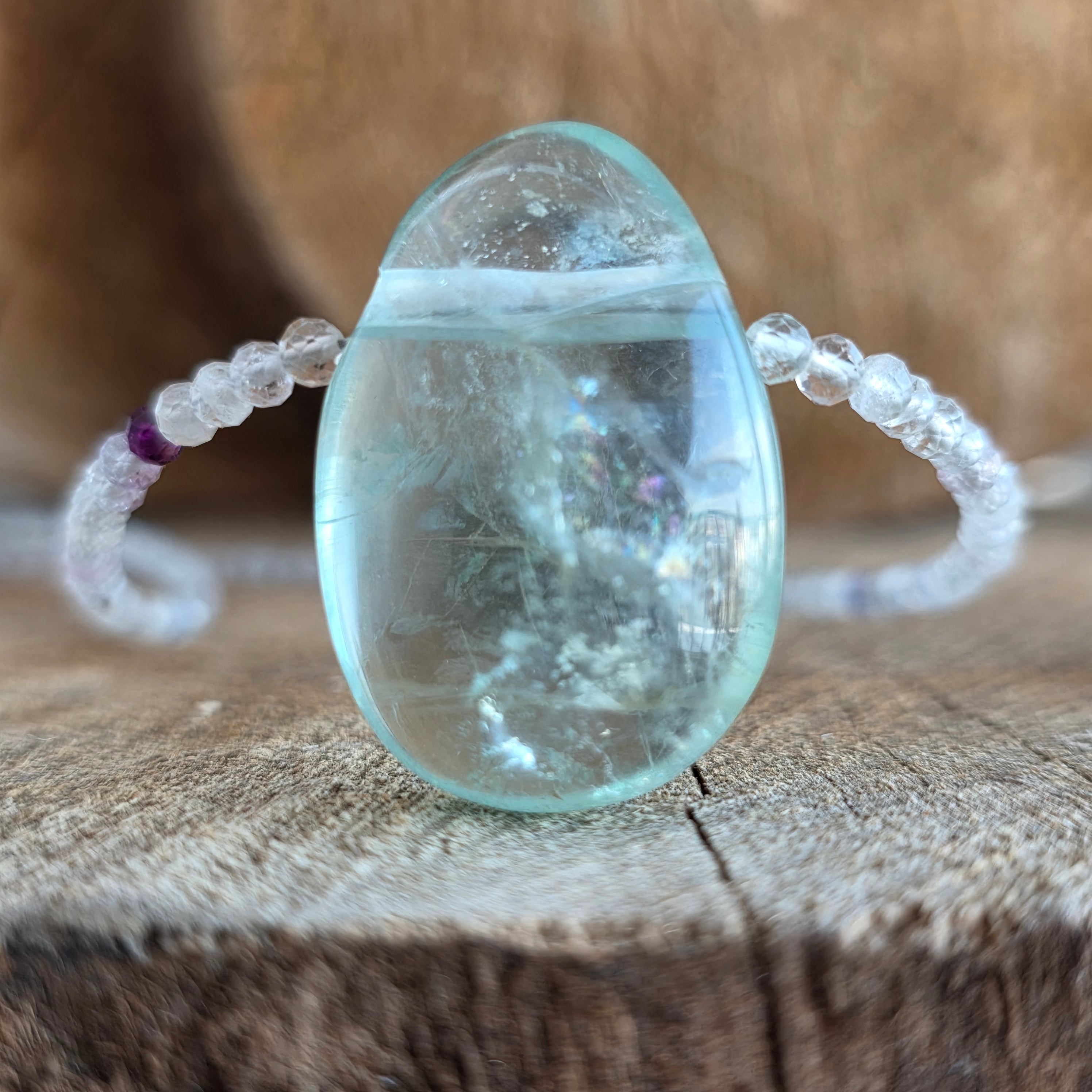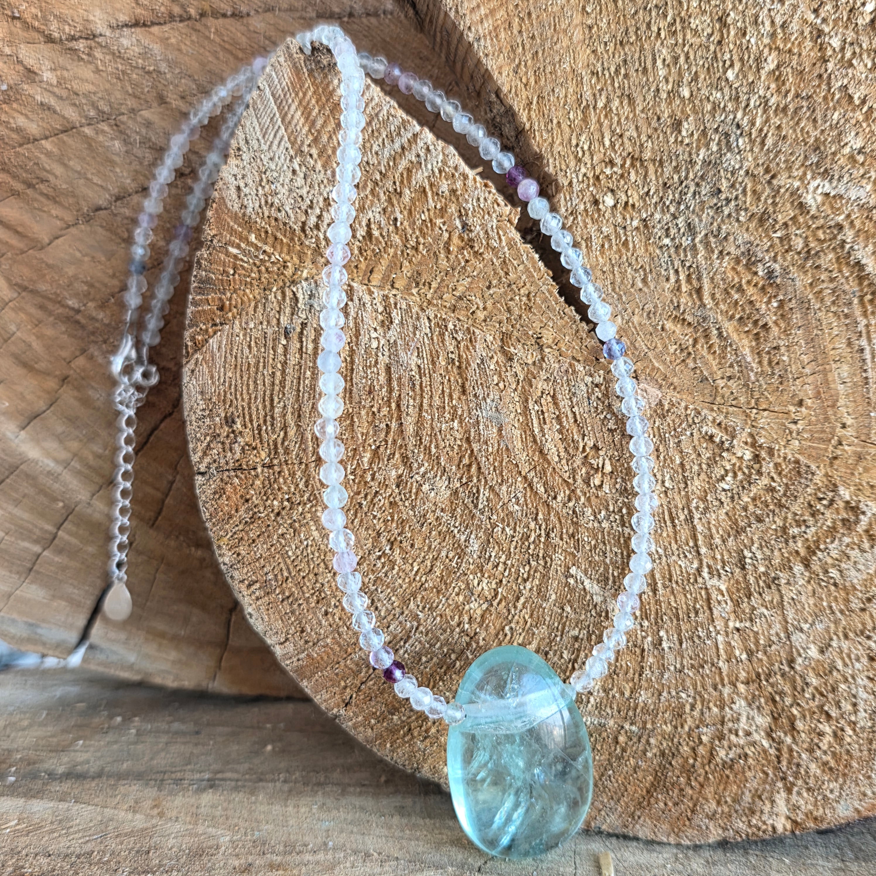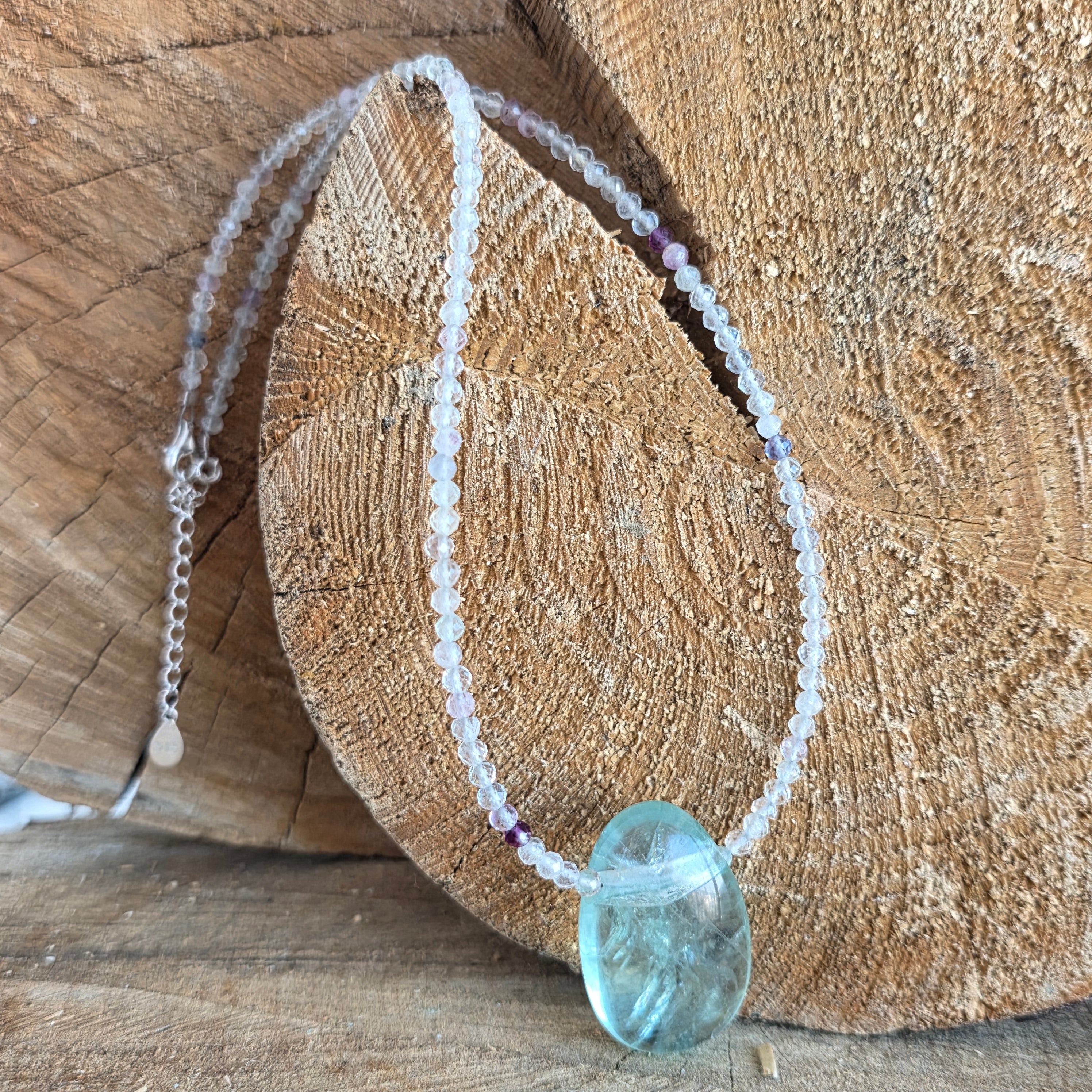 Materiale: fluorit curcubeu fatetat 3 mm, argint 925, pandantiv drop fluorit 3 cm