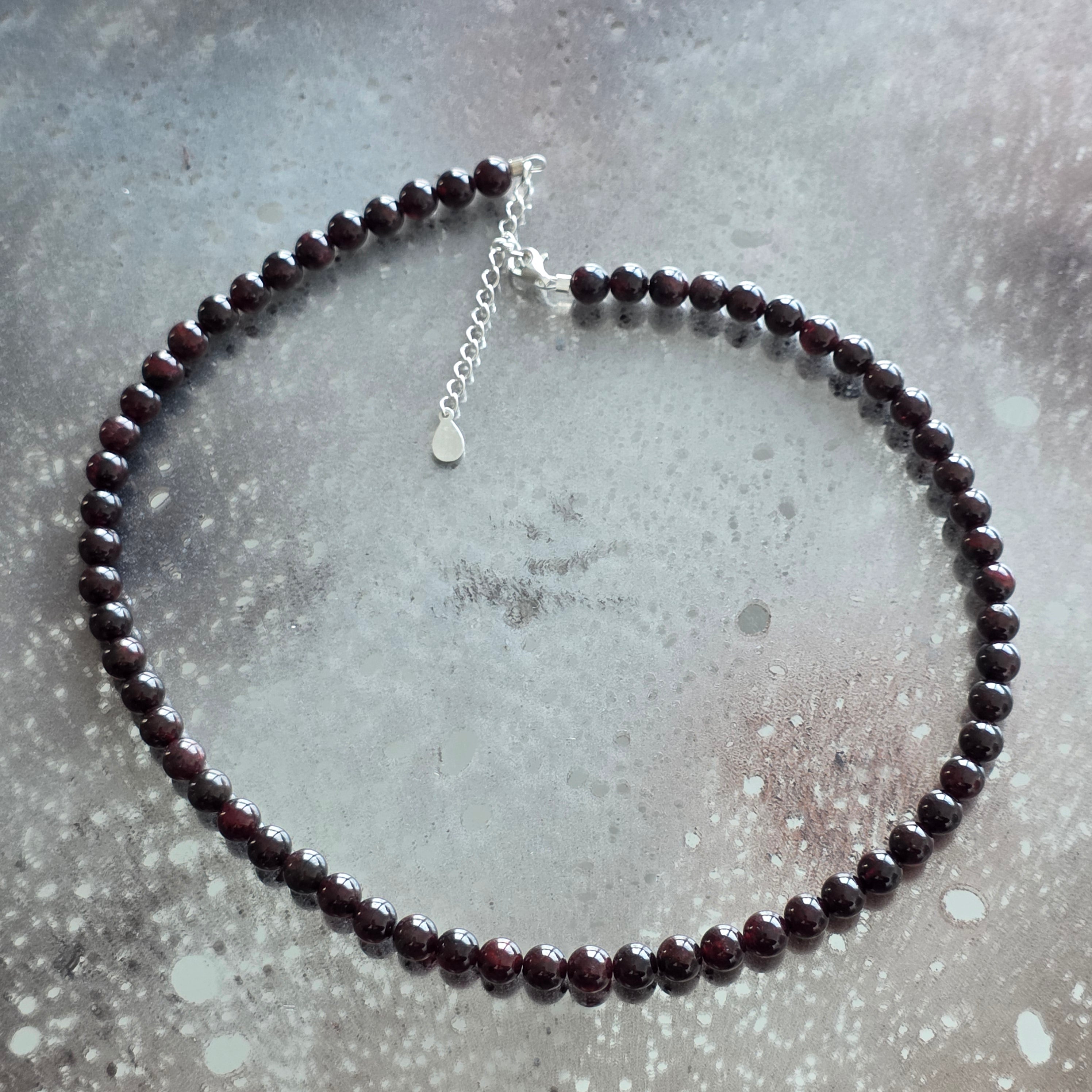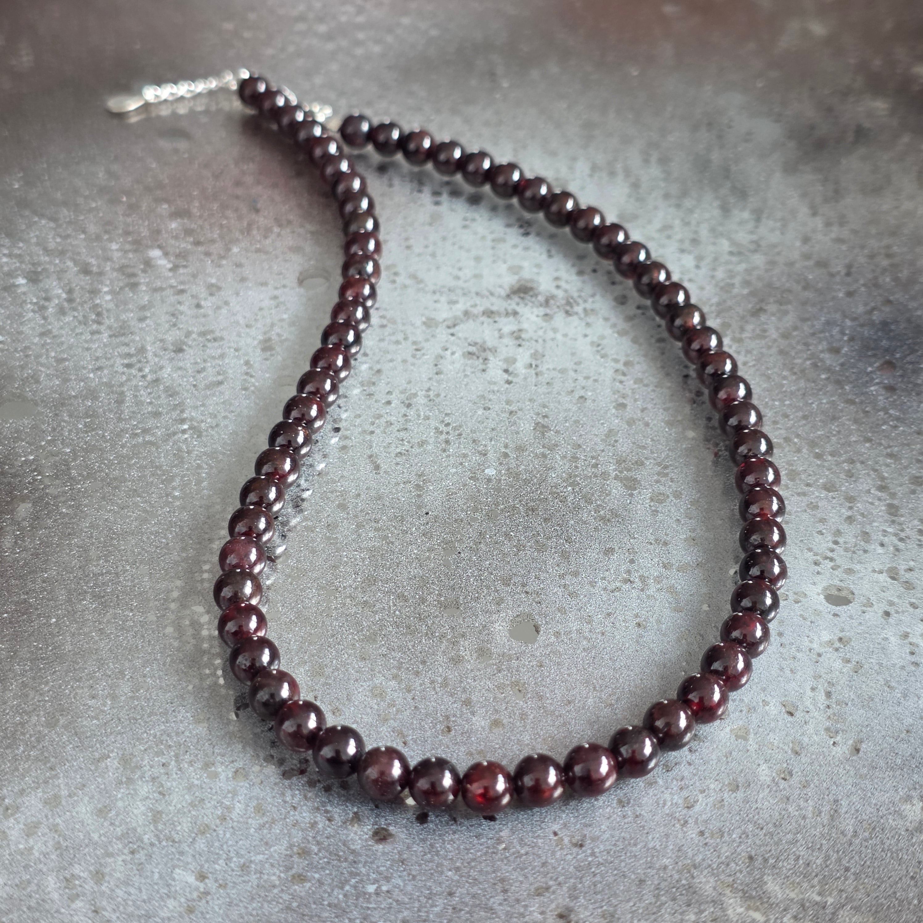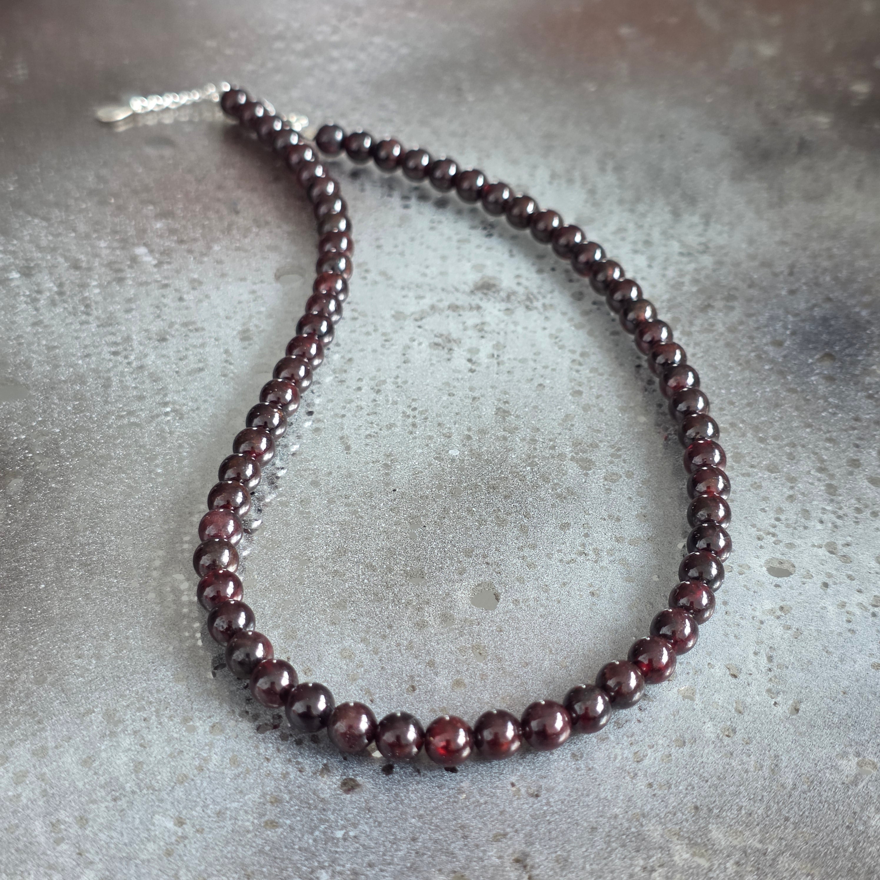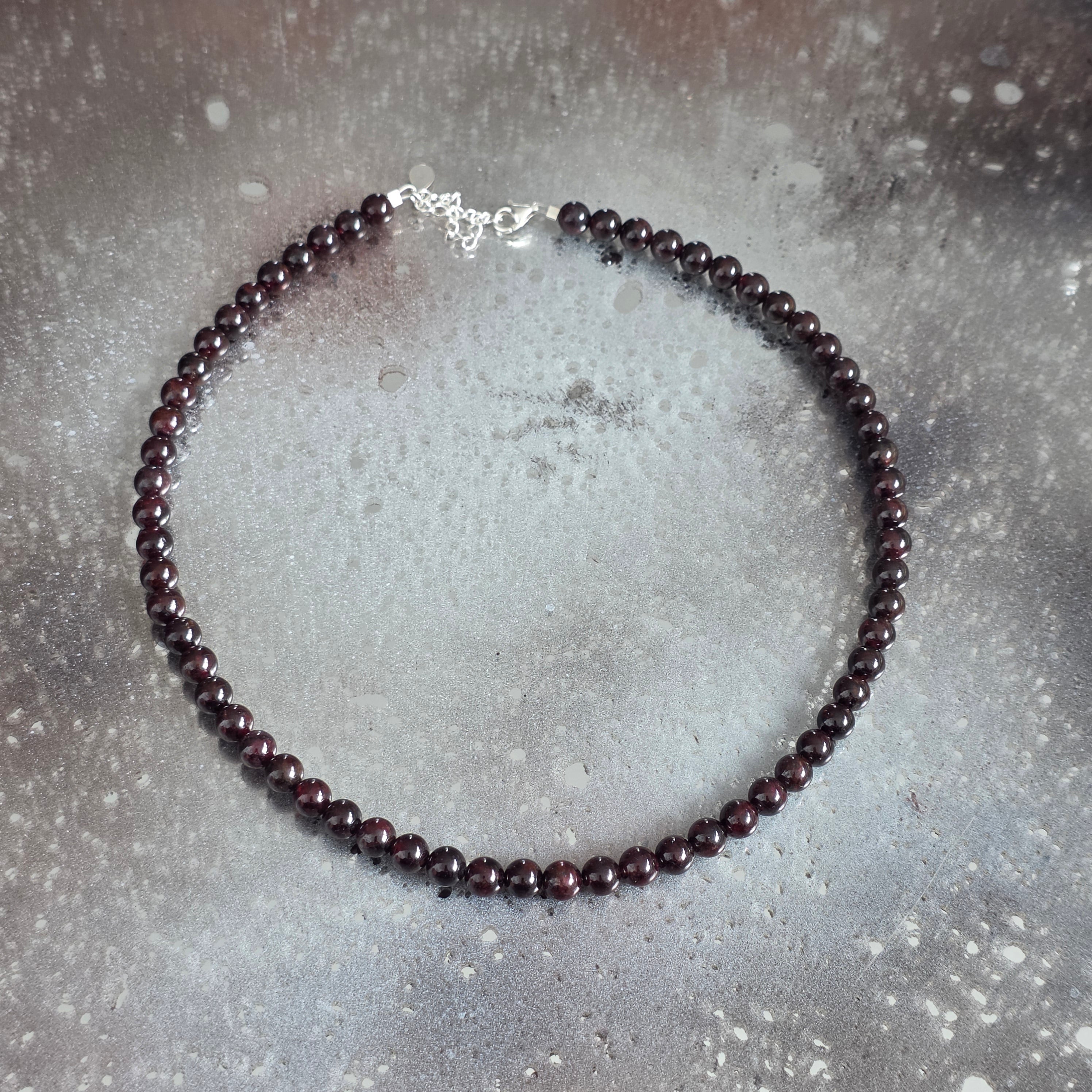 Un colier ce surprinde esența vitalității și a eleganței naturale. Granatul natural de 6 mm, cu nuanțele sale roșu-închis, poartă o strălucire discretă, ca o inimă care bate tăcut în adâncul pământului. Simplitatea sferelor netede oferă un aspect clasic și atemporal, punând în valoare frumusețea autentică a pietrei.