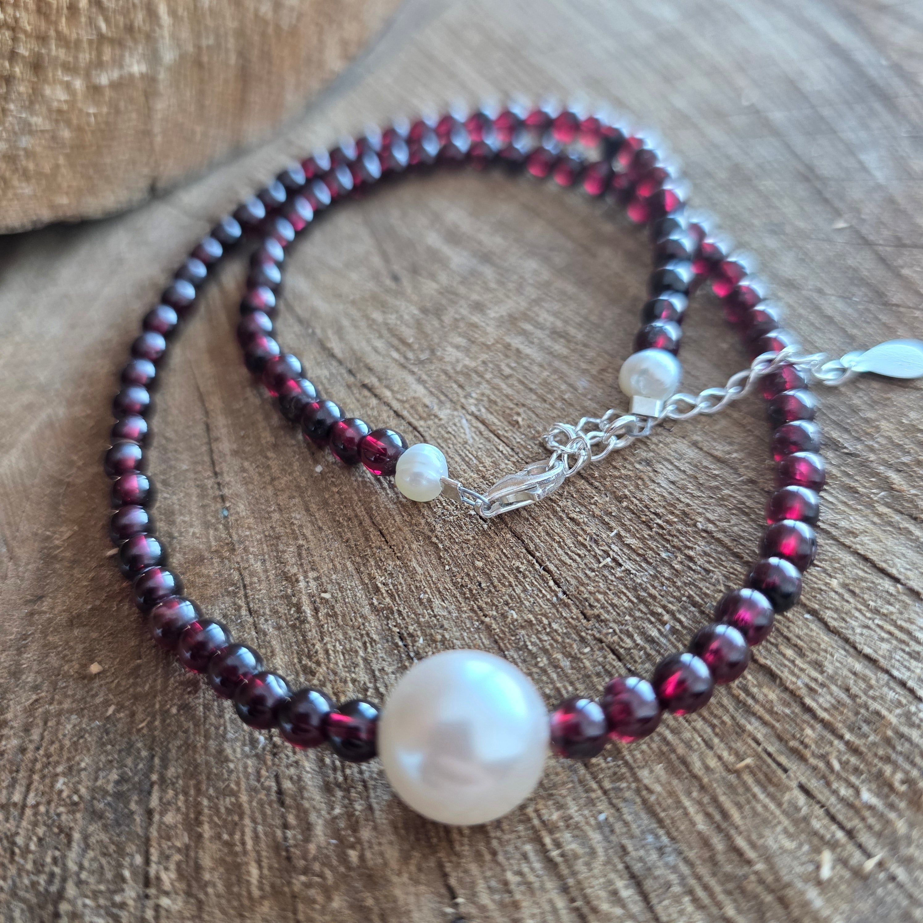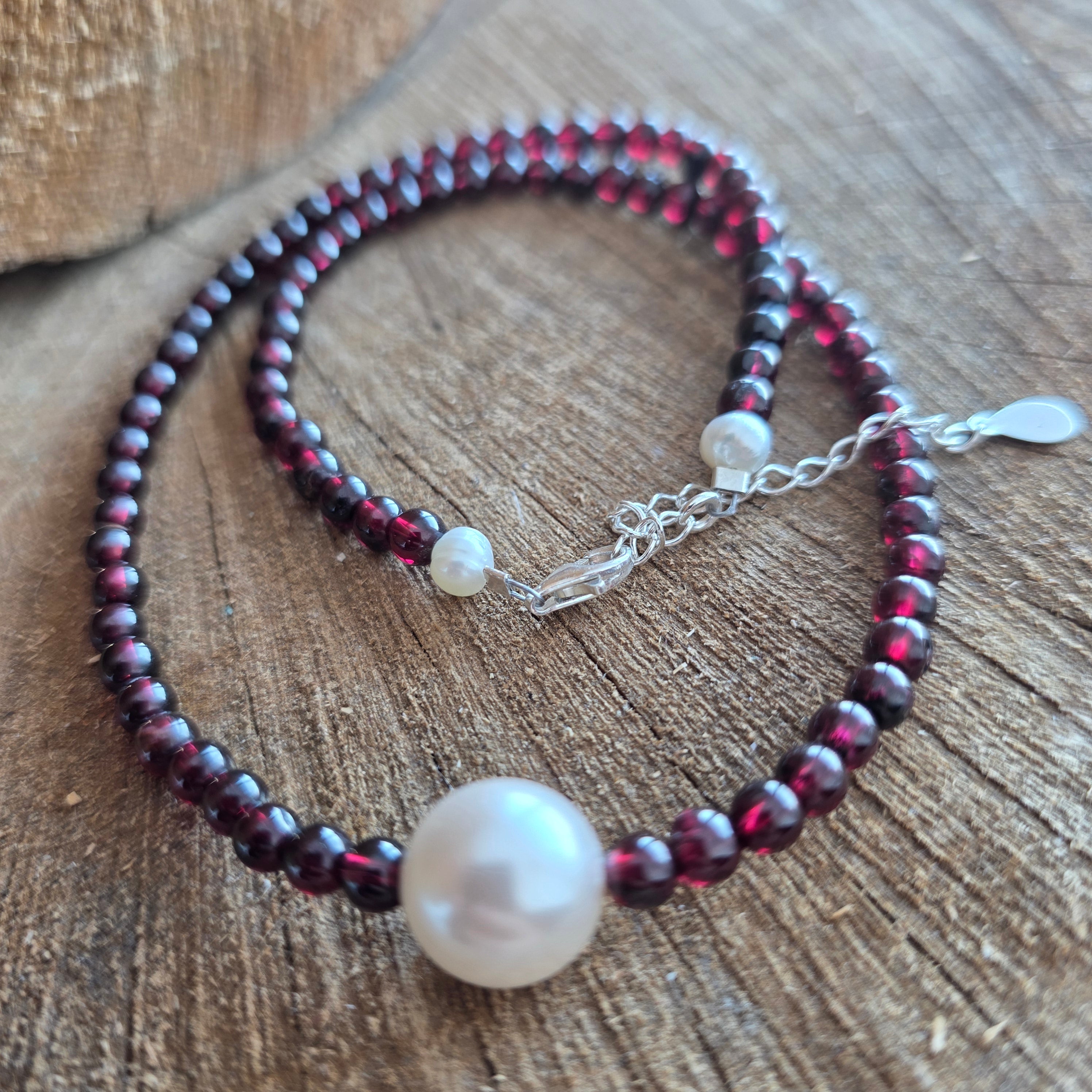 Materiale: granat visiniu închis natural, mărgele 4 mm, argint 925, perla 1 cm