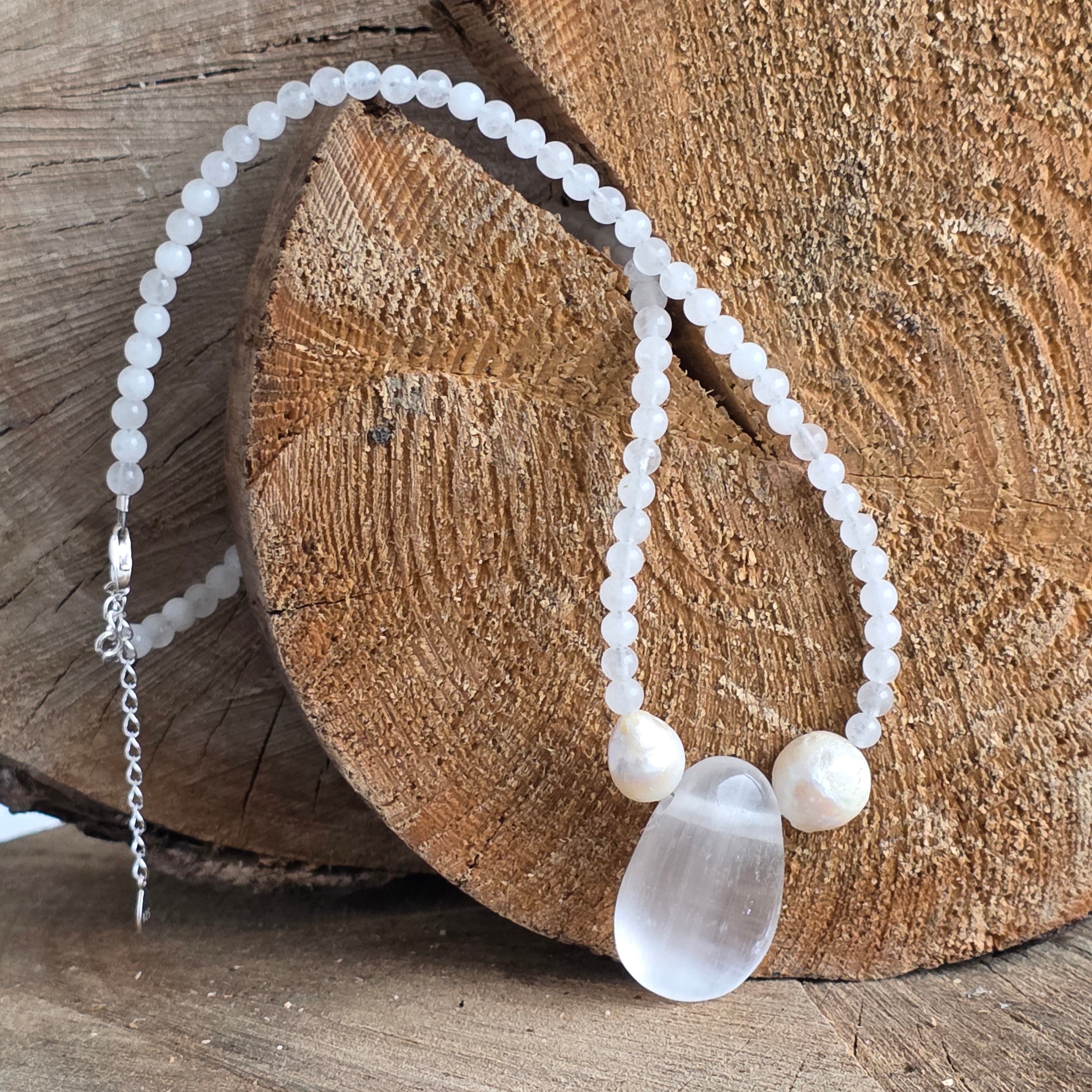 În centrul compoziției, un pandantiv drop din selenit – neted, luminos, aproape eteric – aduce o vibrație angelică, calmă, ca o rază de lună ce mângâie sufletul. Două perle naturale adaugă accente de blândețe și rafinament, împletind energia pământului cu grația apelor tăcute.
