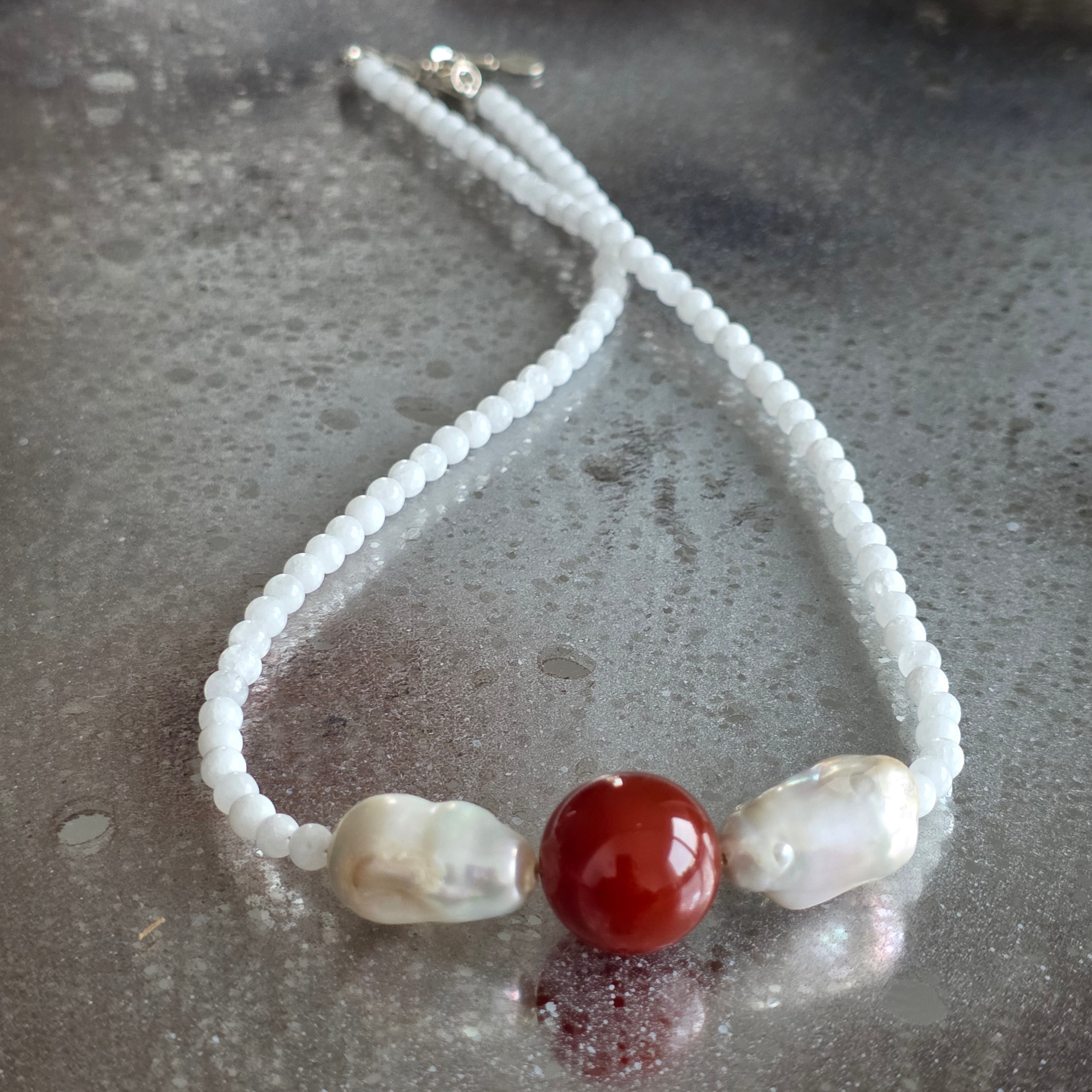 Materiale: jad alb, perle naturale mari, carneol (sferă centrală), argint 925