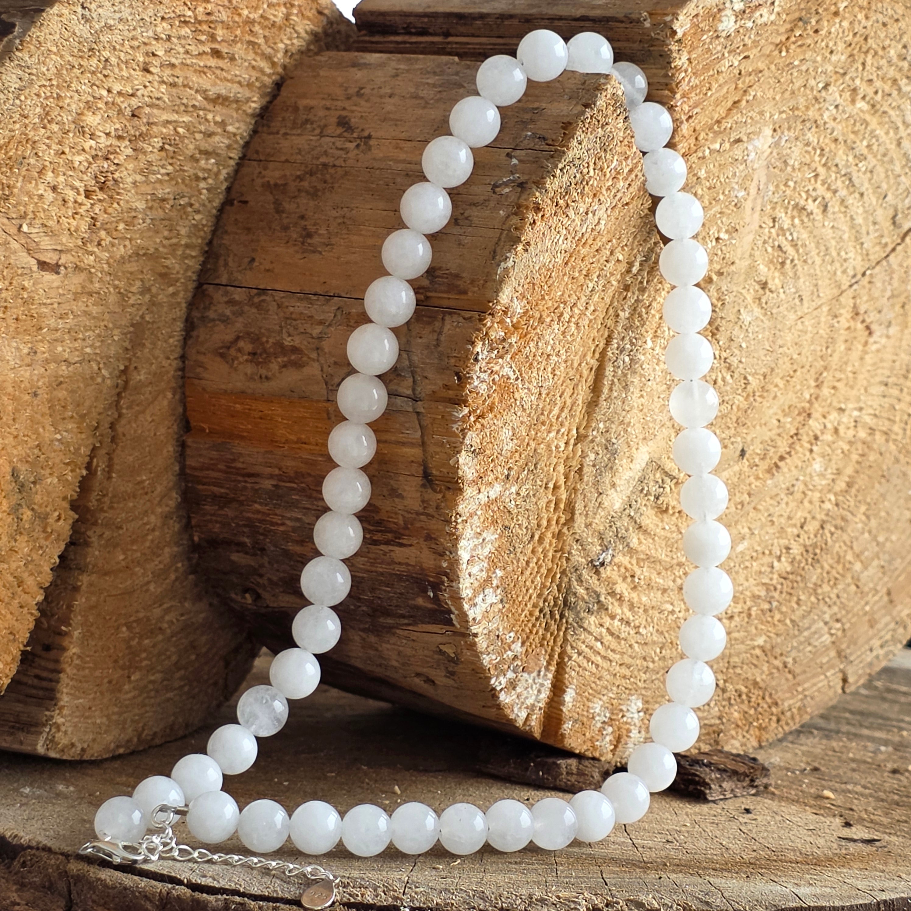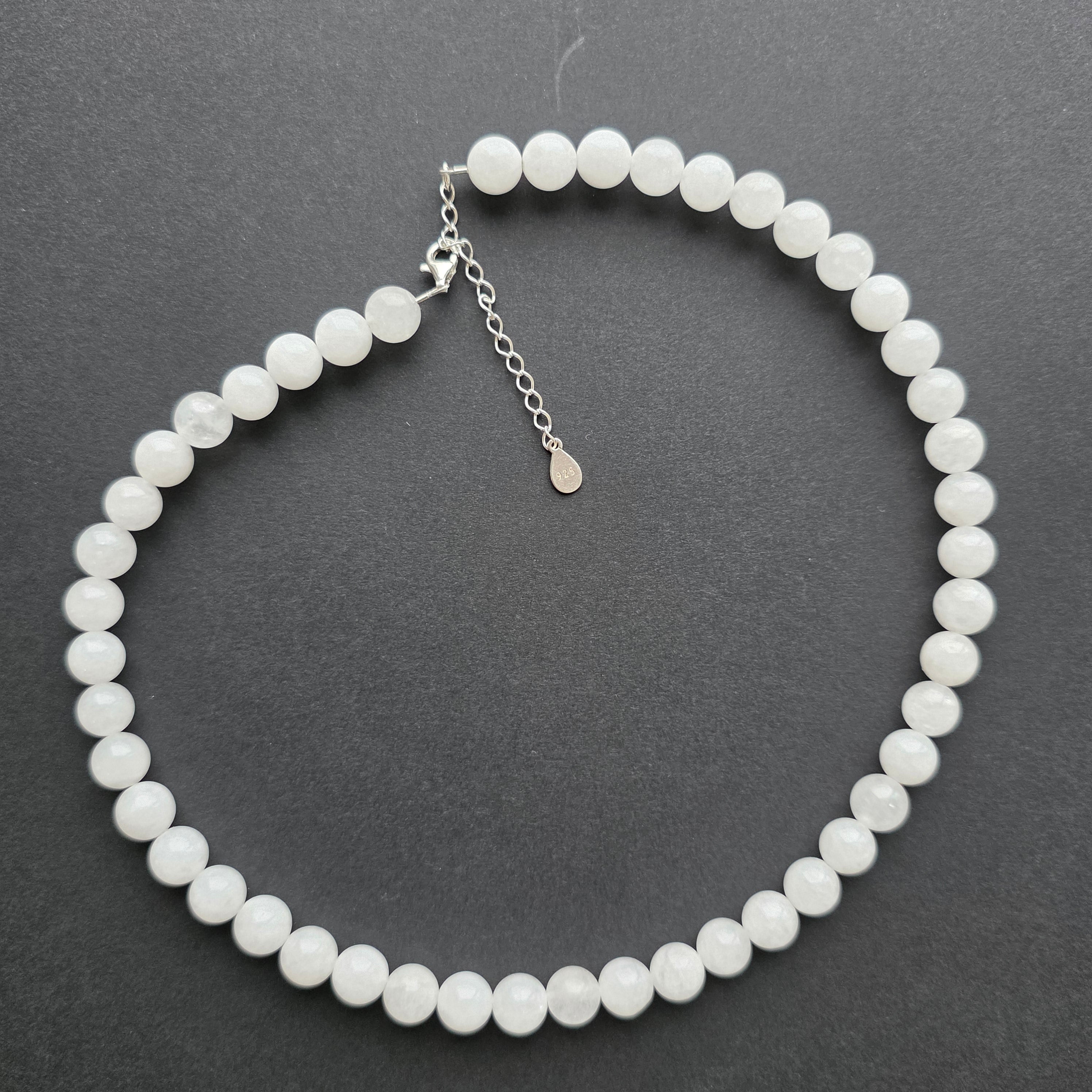Un colier care întruchipează puritatea, simplitatea și eleganța esențială a luminii. Jadul alb, cu reflexele sale mătăsoase și transluciditatea fină, evocă liniștea unui început nou, claritatea gândului și curățenia sufletului. Fiecare sferă de 8 mm poartă o vibrație blândă și armonioasă, ca o promisiune de pace interioară.