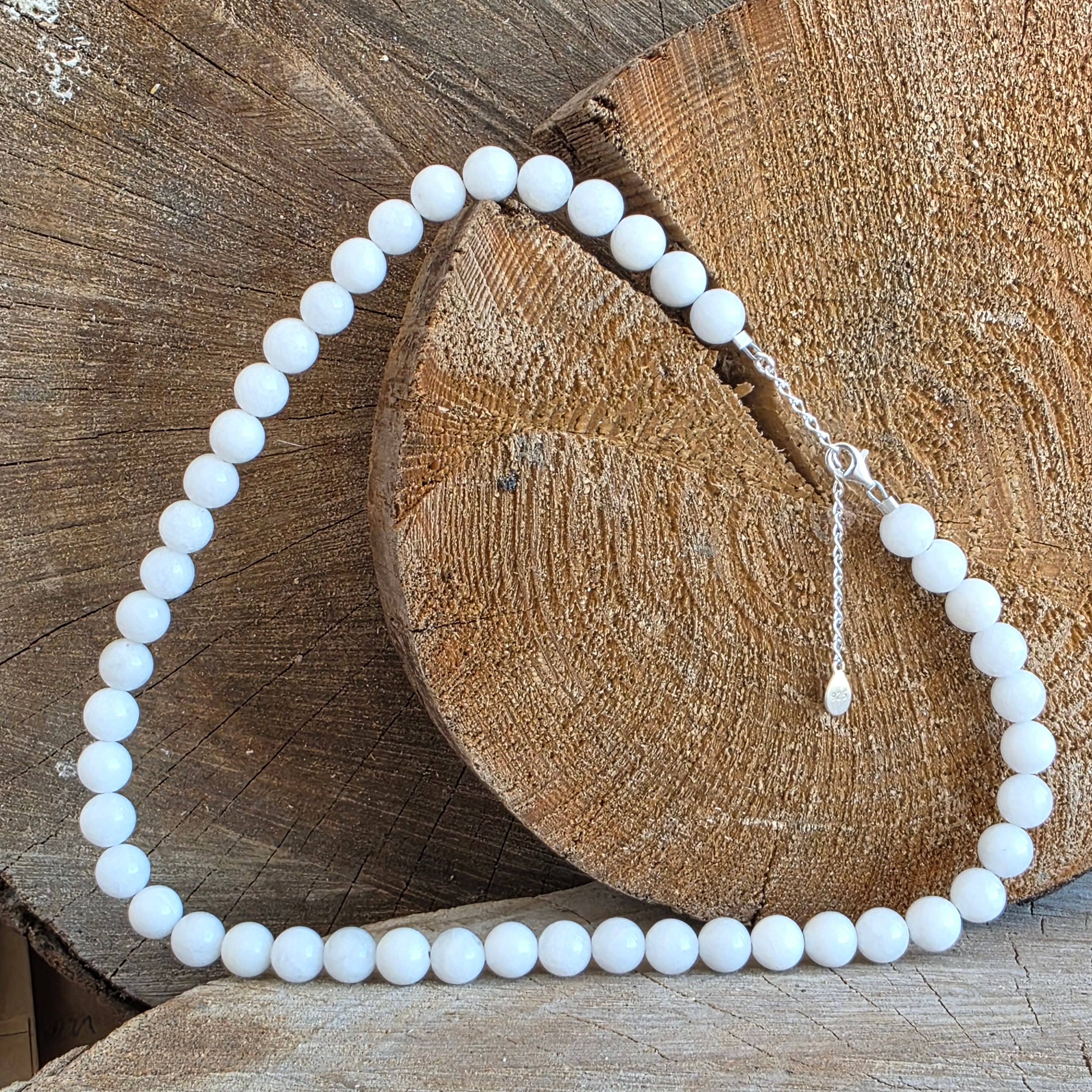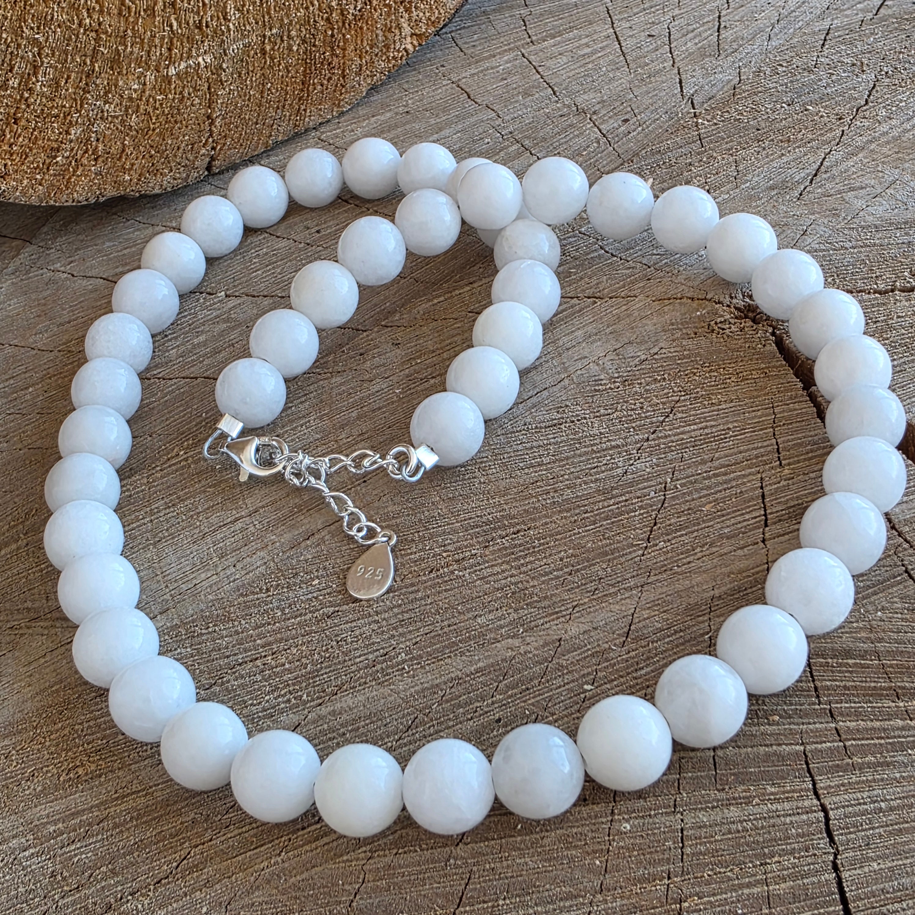 Un colier cu prezență calmă și rafinată, realizat din sfere de jad alb de 8 mm, care se așază armonios în jurul gâtului, formând o linie echilibrată și luminoasă. Albul lăptos, uneori ușor translucid, conferă pietrei o expresie pură și ordonată, iar fațetarea fină adaugă reflexii discrete, care pun în valoare textura naturală fără a încărca vizual bijuteria. Designul este curat și atemporal, potrivit pentru purtare zilnică sau pentru accente elegante.