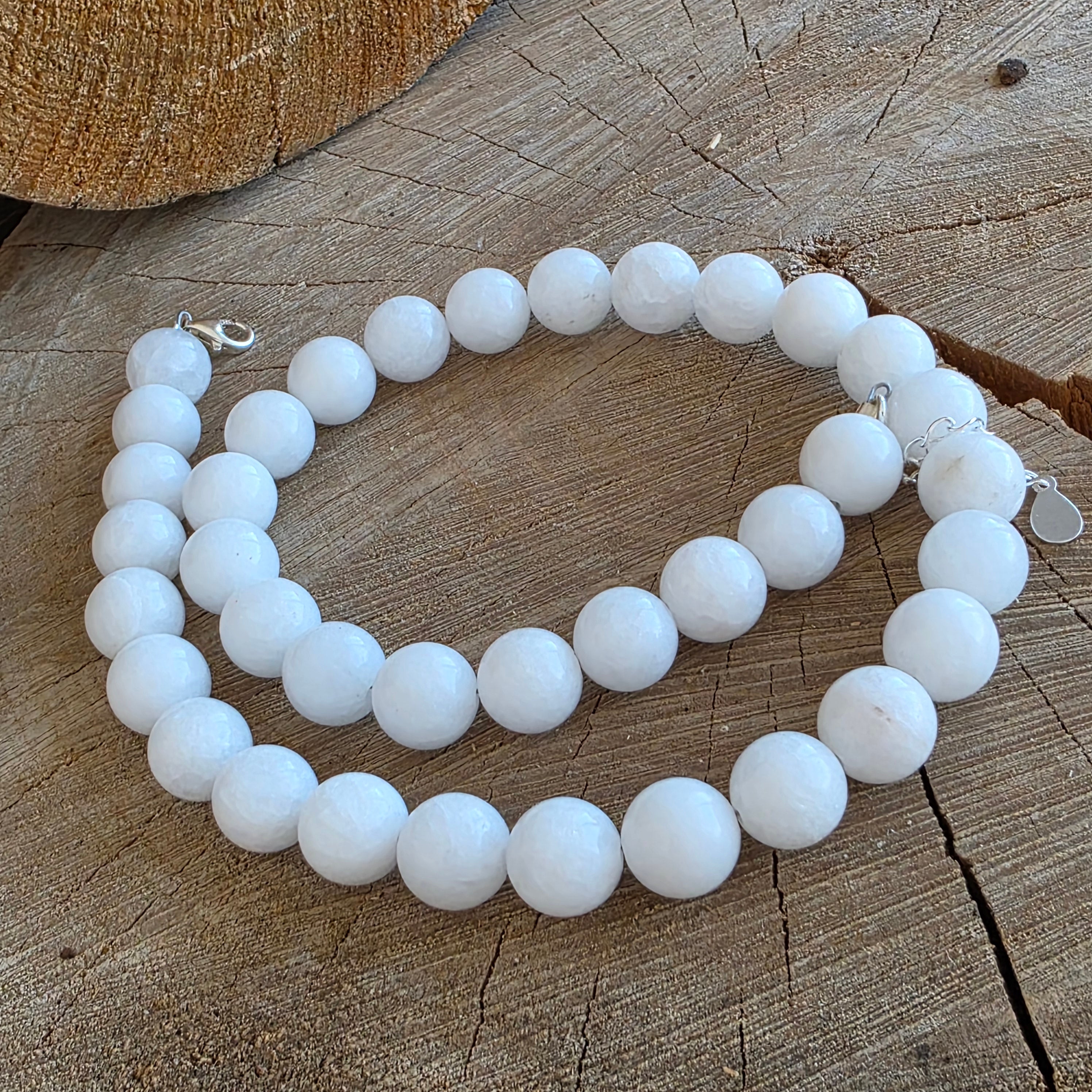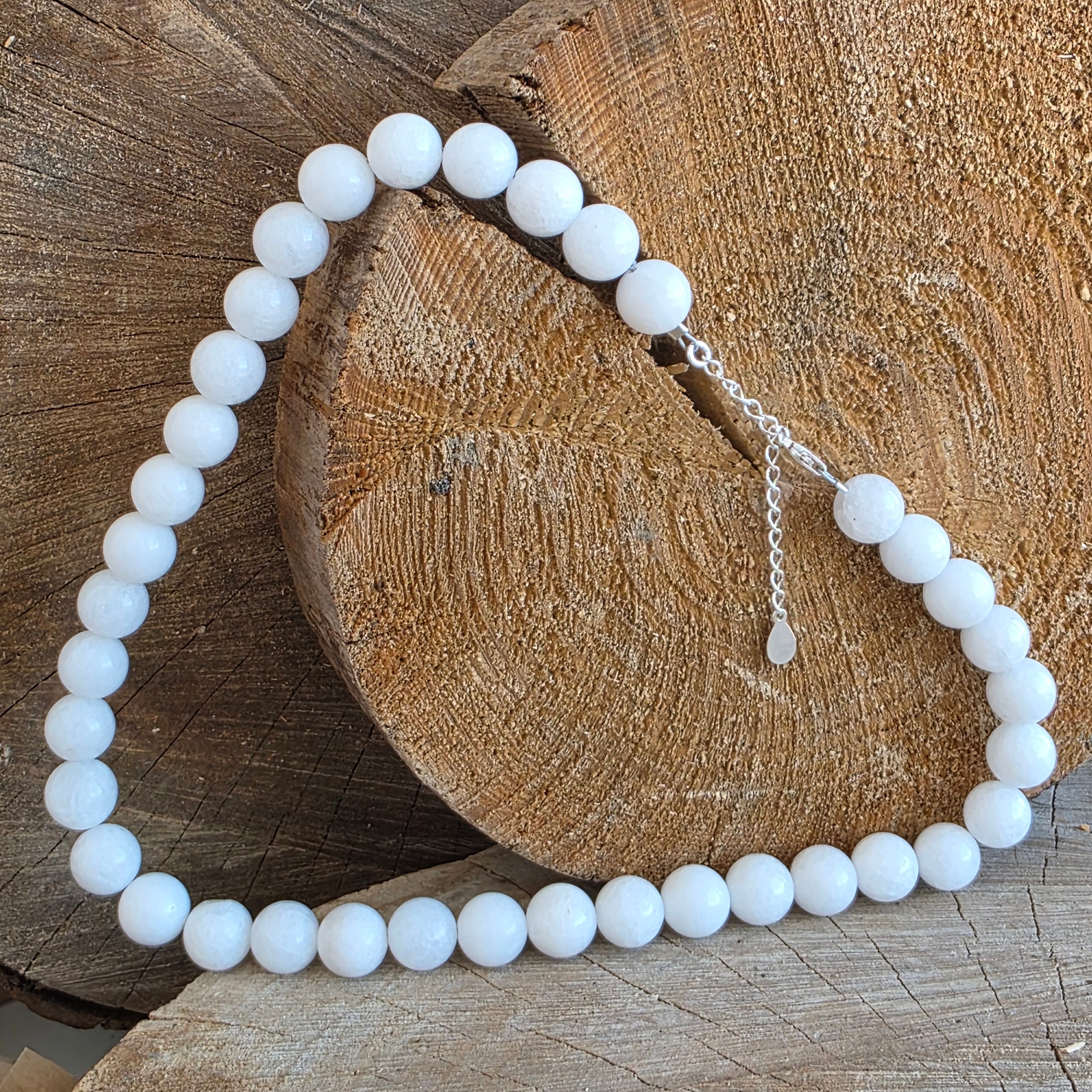 Un colier cu prezență calmă și rafinată, realizat din sfere de jad alb de 10 mm, care se așază armonios în jurul gâtului, formând o linie echilibrată și luminoasă. Albul lăptos, uneori ușor translucid, conferă pietrei o expresie pură și ordonată, iar fațetarea fină adaugă reflexii discrete, care pun în valoare textura naturală fără a încărca vizual bijuteria. Designul este curat și atemporal, potrivit pentru purtare zilnică sau pentru accente elegante.