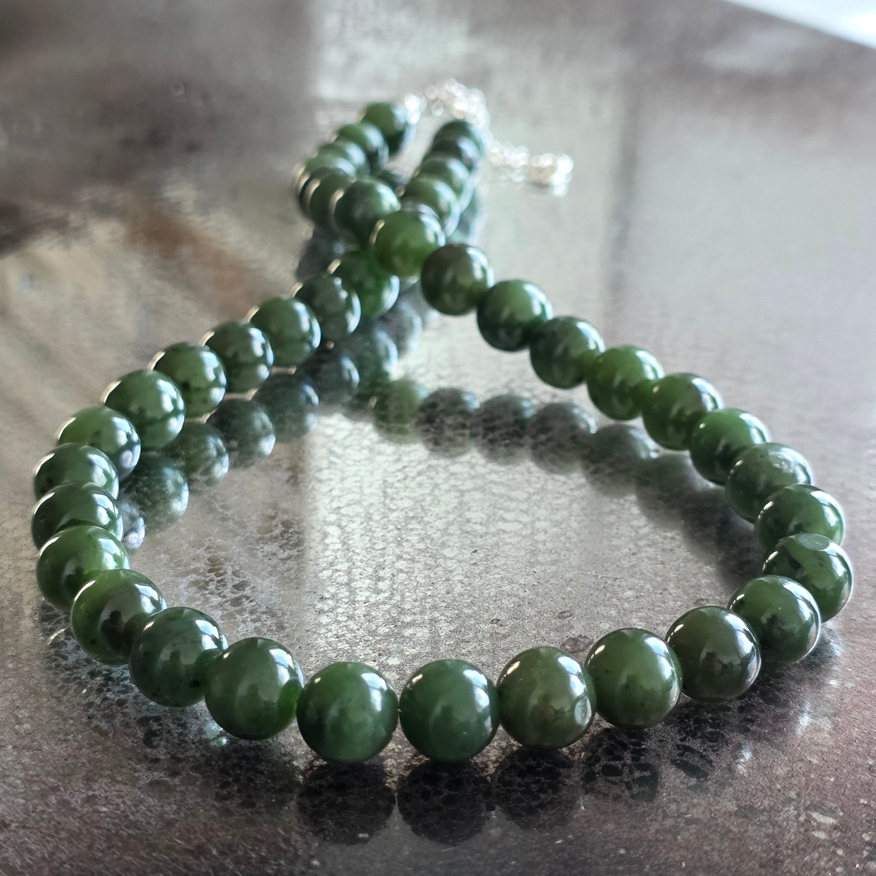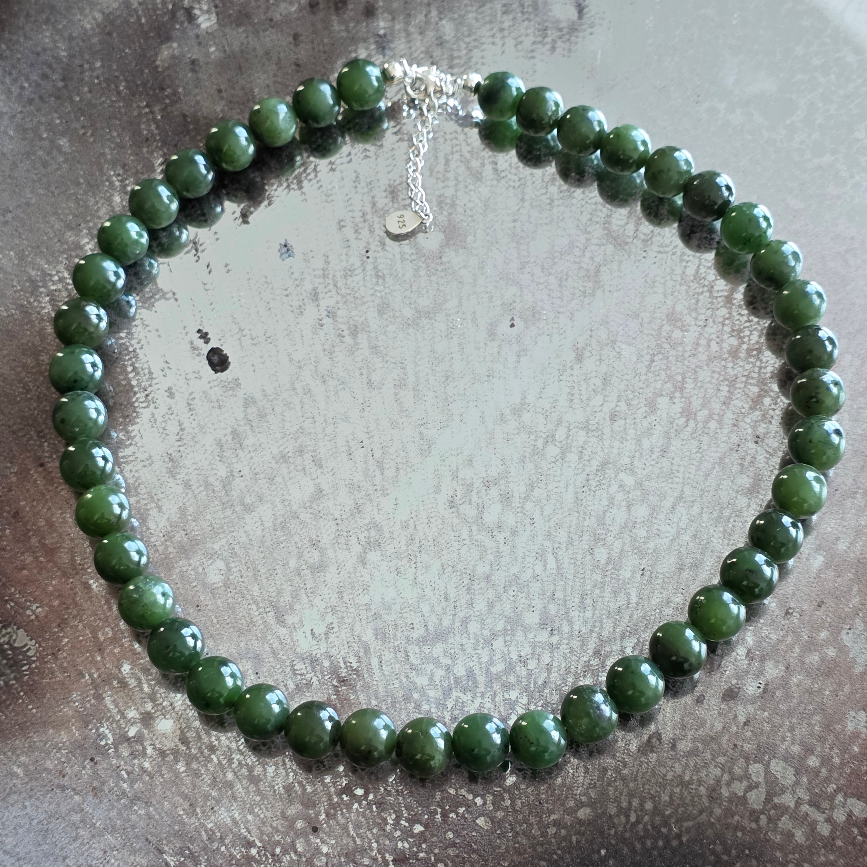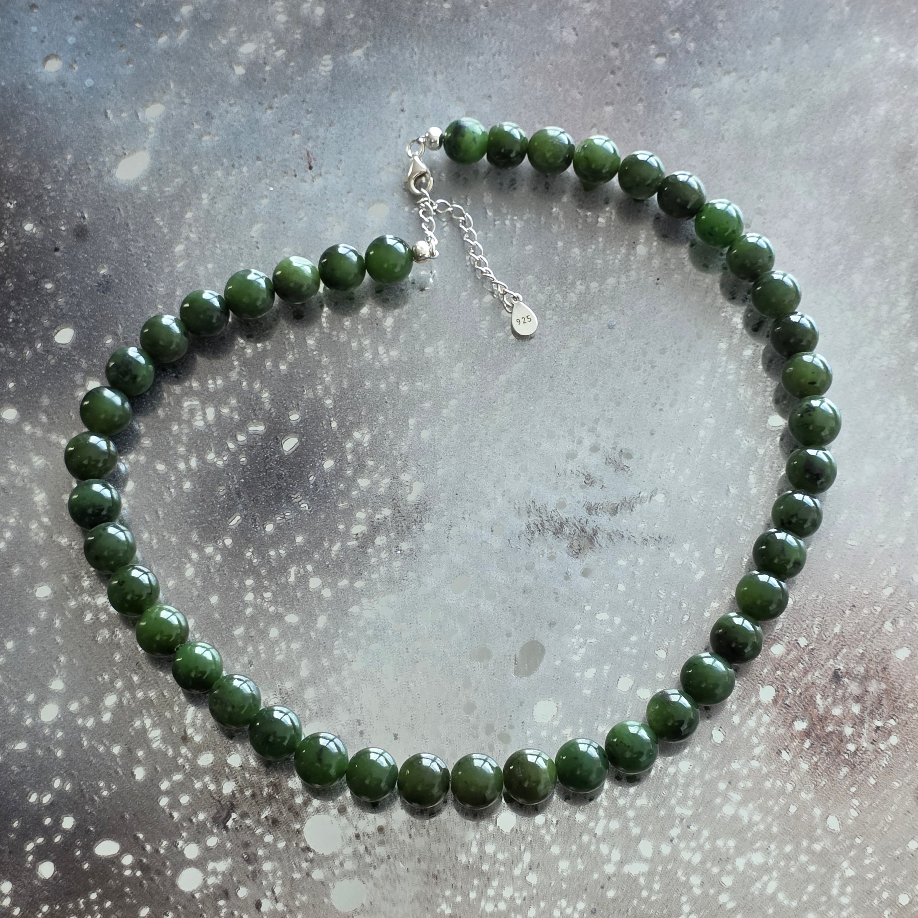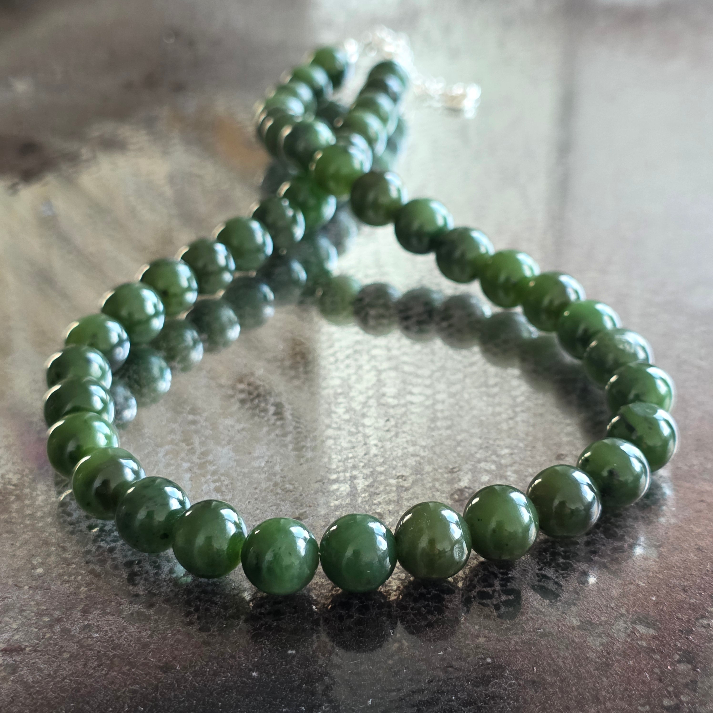 Un colier cu prezență, putere și noblețe tăcută – creat din mărgele rotunde de jad verde nefrit de 10 mm, fiecare purtând în profunzimea sa suflul liniștit al naturii și al tradiției.