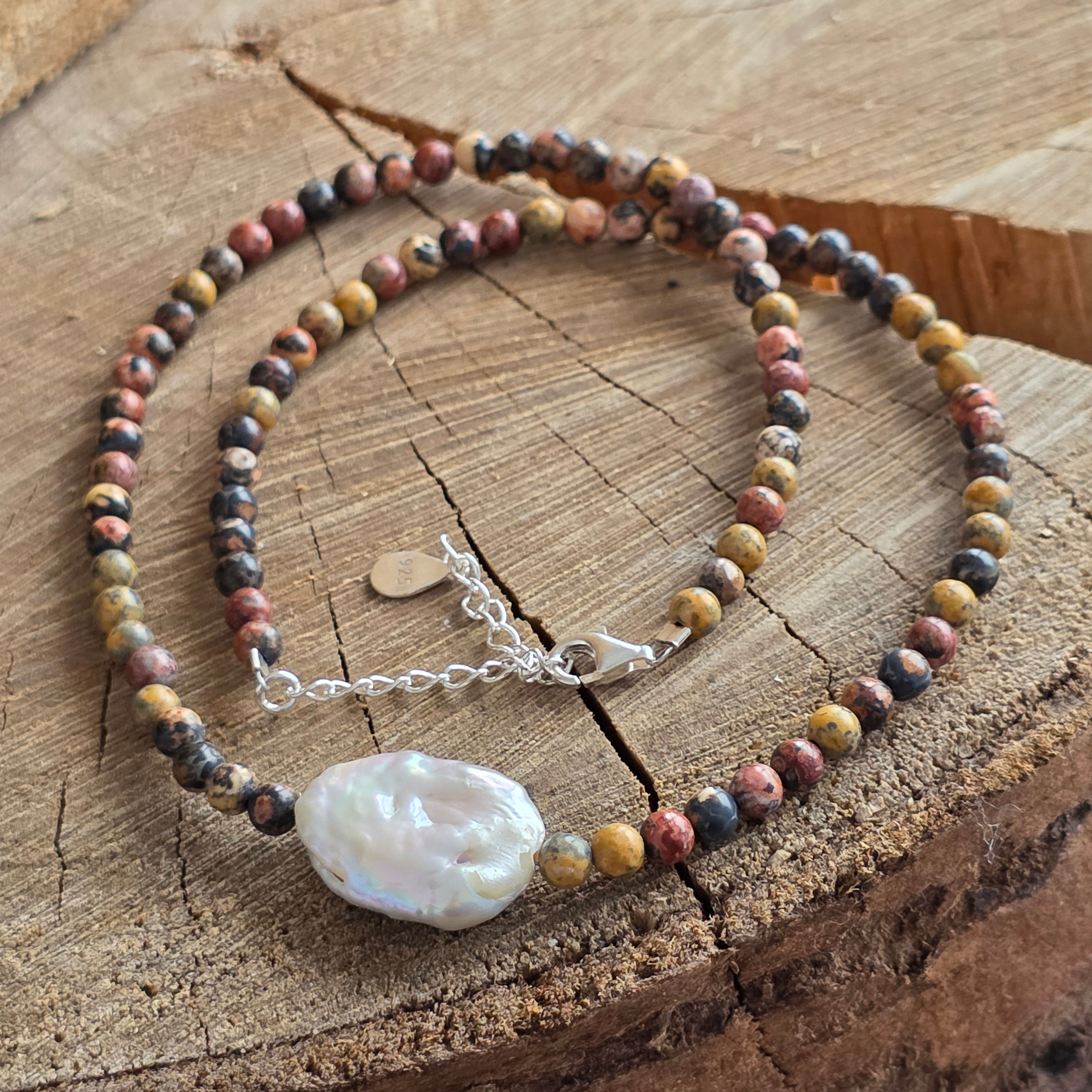 Materiale: jasp leopard natural 4 mm, perlă naturală dreptunghiulară 2 cm, argint 925