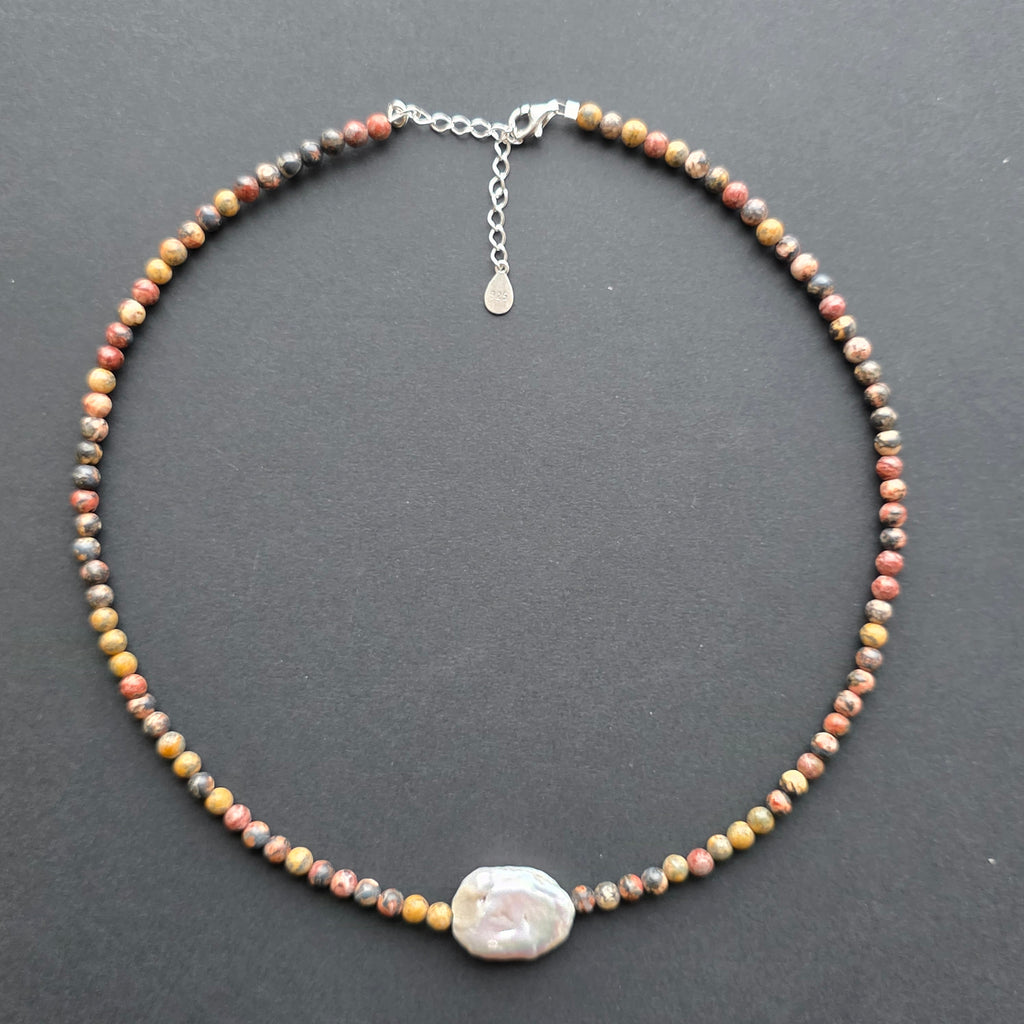 Un colier care poartă amprenta pământului și energia elementară a stabilității. Jaspul leopard natural de 4 mm dezvăluie modele organice, asemenea petelor fine de pe blana unui animal sălbatic, amintind de legătura profundă dintre om și natură. În centrul bijuteriei, o perlă naturală dreptunghiulară de 2 cm aduce o notă de lumină și echilibru, precum o rază albă într-un peisaj de piatră și pământ.