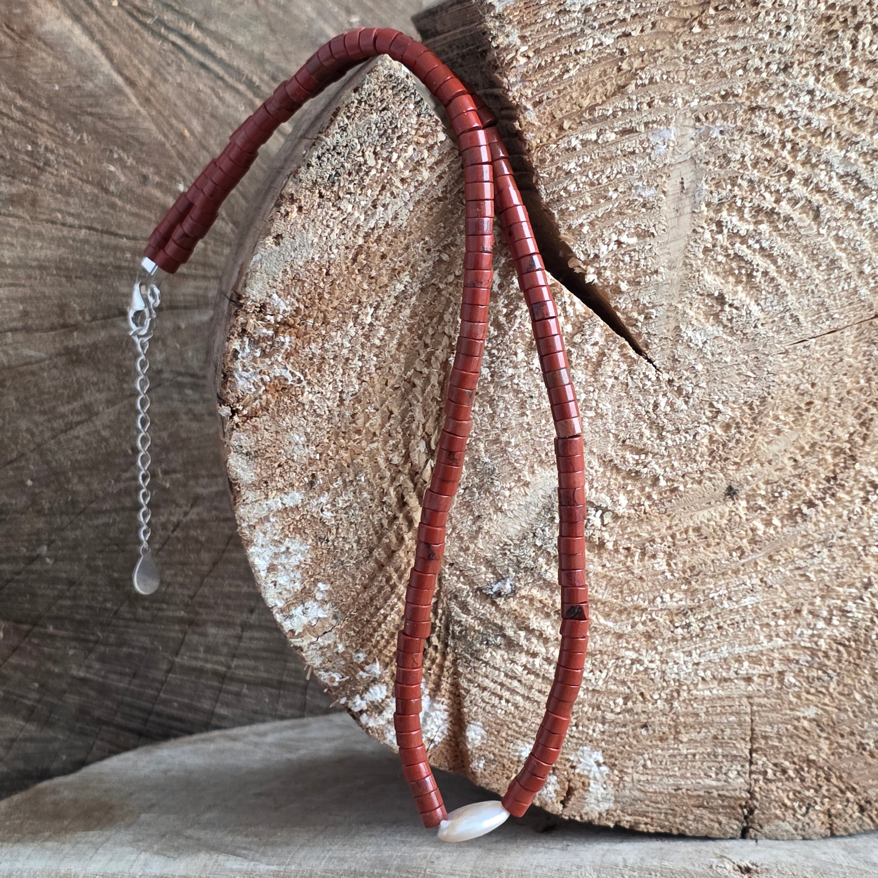 Un colier ce poartă energia pământului și noblețea simplității naturale. Jaspul roșu natural, tăiat în discuri fine de 4,5 × 2 mm, radiază forță și vitalitate, iar perla centrală de 1 cm aduce un accent de lumină, ca o picătură de liniște în mijlocul culorii vii. Împreună, ele creează un echilibru perfect între pasiune și calm, între foc și apă.
