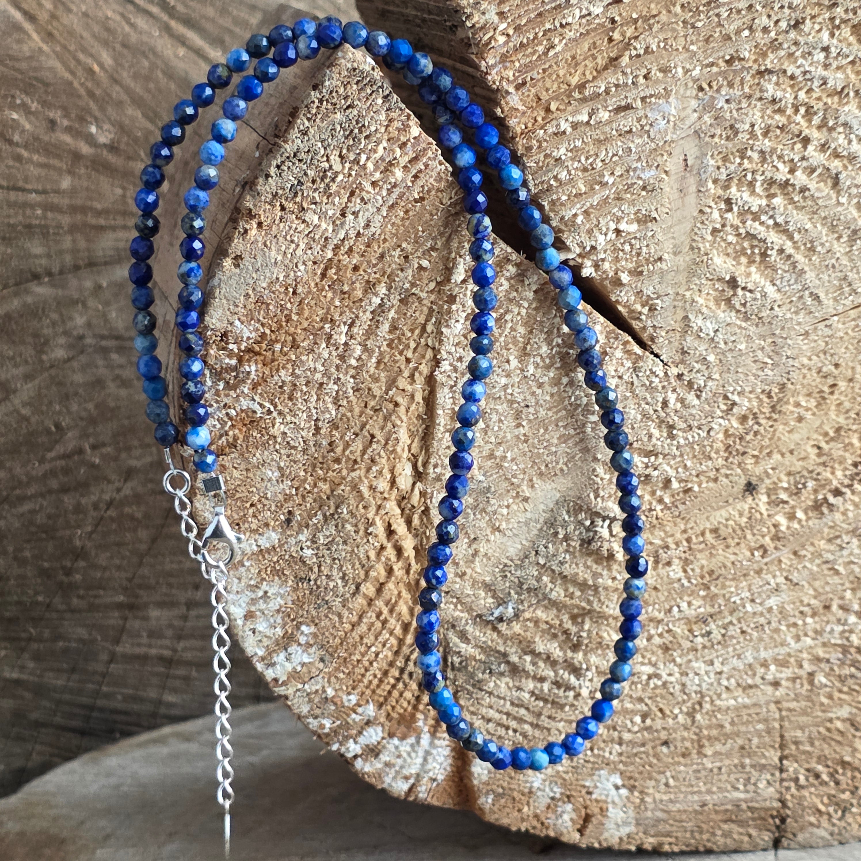 Un colier care poartă noblețea cerului închis presărat cu stele. Lapis lazuli-ul natural fațetat de 3 mm își dezvăluie nuanțele regale de albastru profund, animate de scânteieri aurii de pirită. Fațetele fine reflectă lumina discret, adăugând bijuteriei o eleganță subtilă și rafinată, perfectă atât pentru ocazii speciale, cât și pentru purtarea zilnică.
