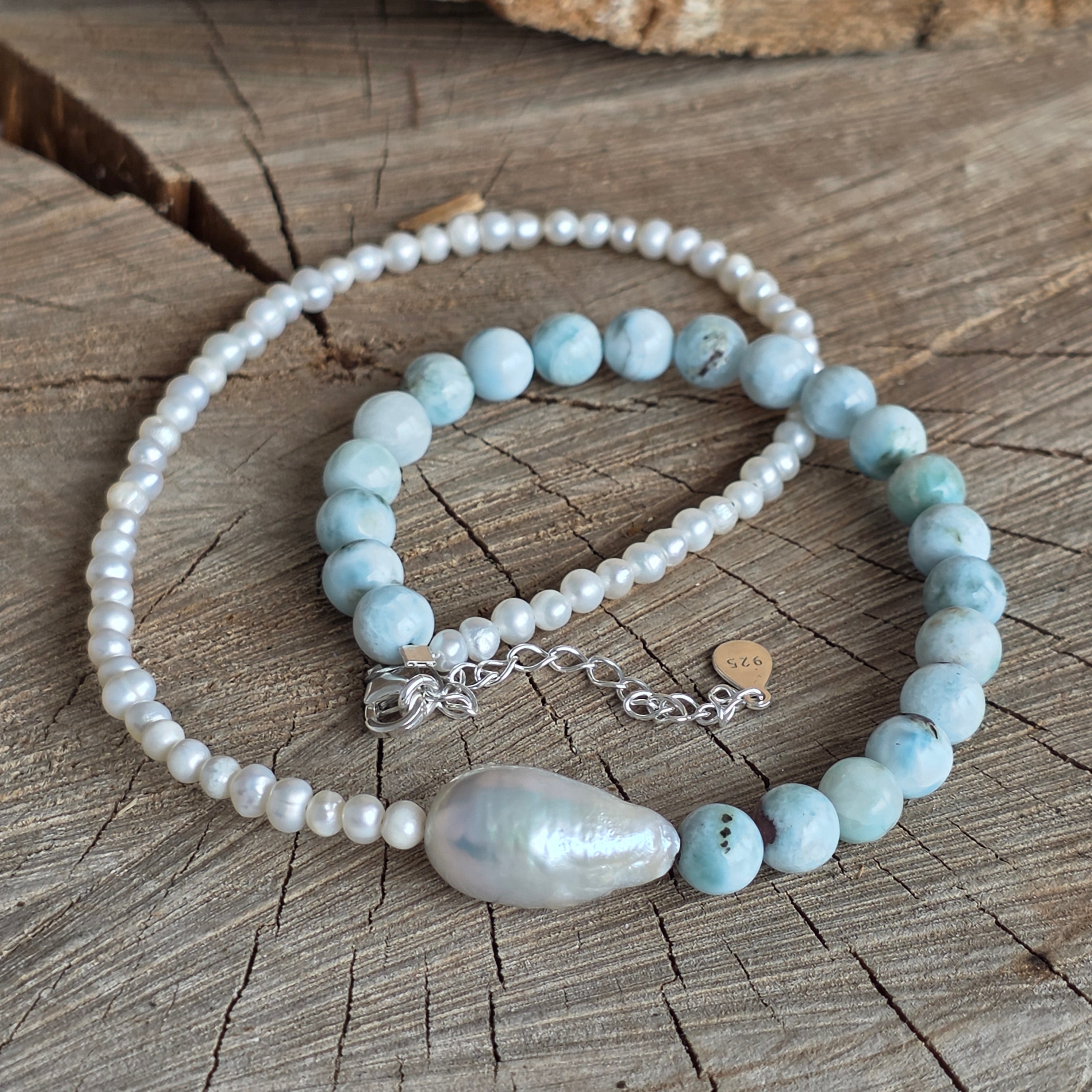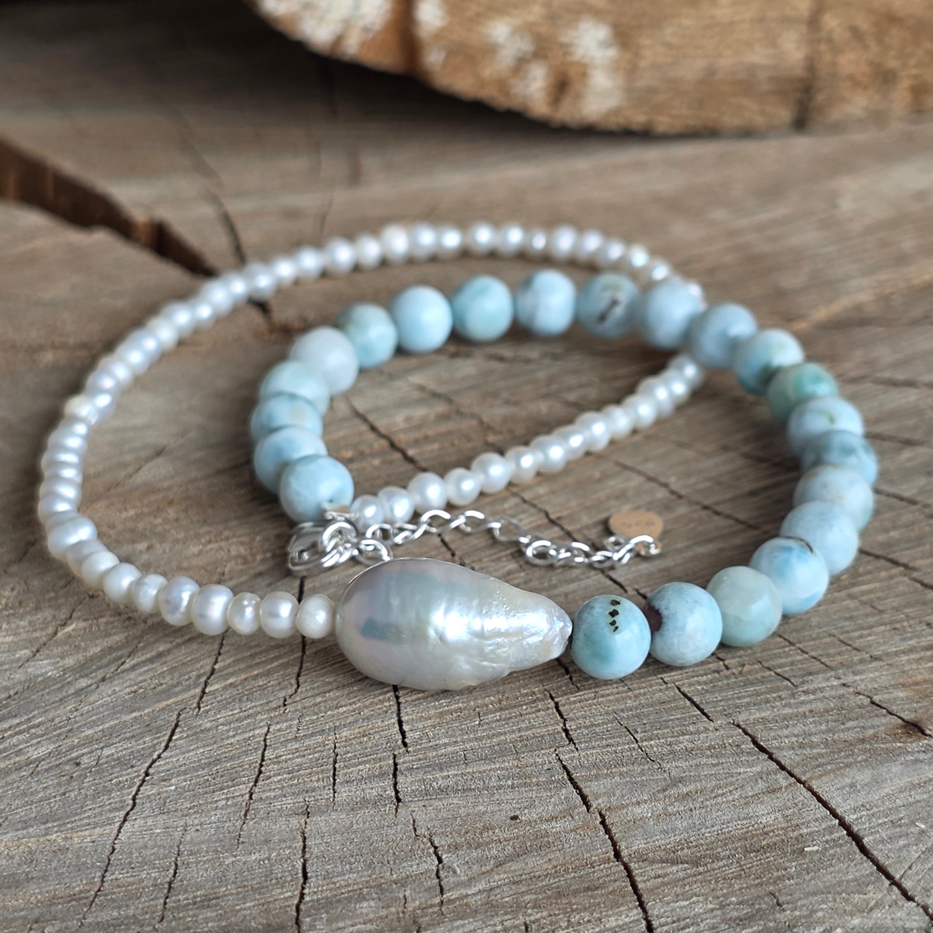 Materiale: larimar natural (sfere de 6 mm), perle de cultură (sfere de 3 mm), perlă baroque, argint 925, închidere lobster din argint