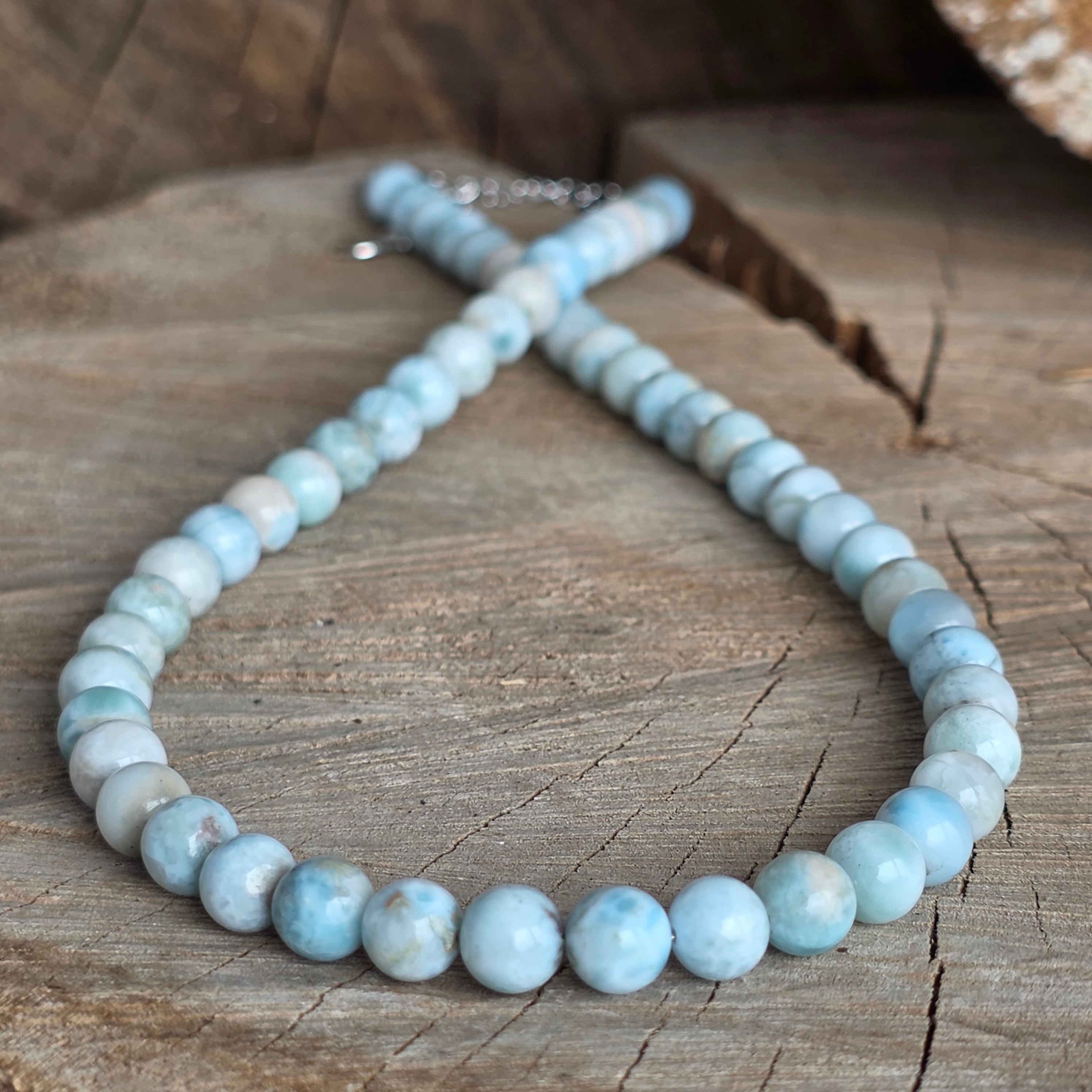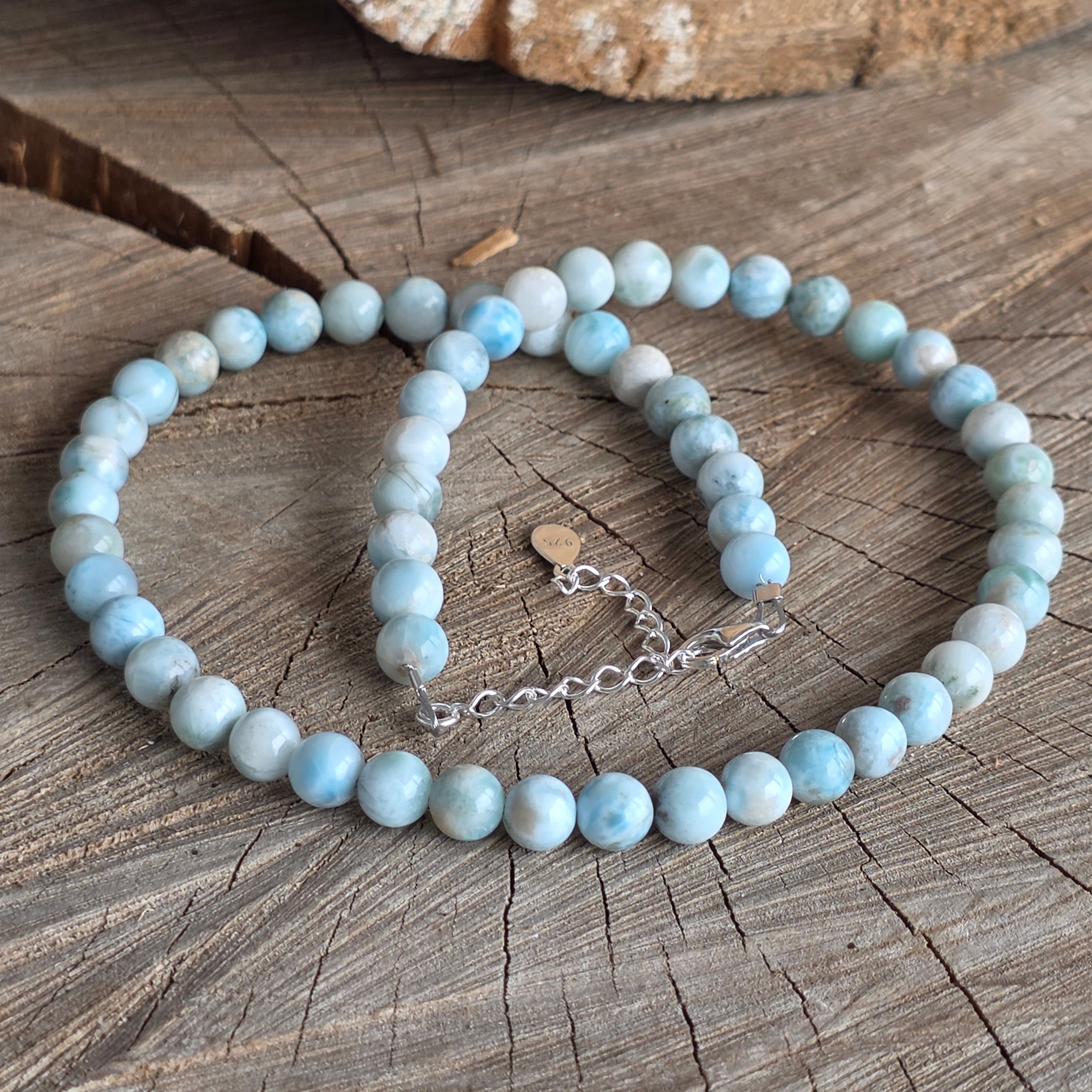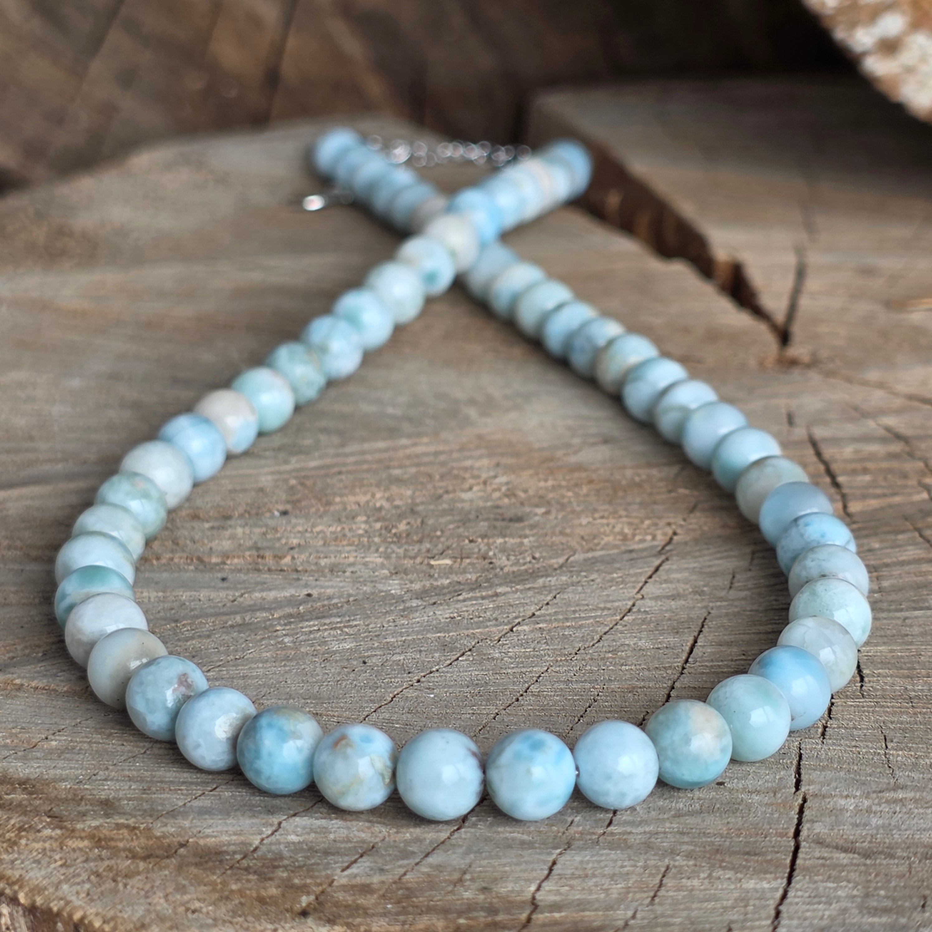 Un colier care pare să păstreze în el liniștea mării – nuanțele sale de albastru deschis, traversate de forme albe, evocă valuri blânde și cer senin. Realizat din larimar natural, cu sfere de 7 mm, această bijuterie aduce o senzație de prospețime și echilibru.