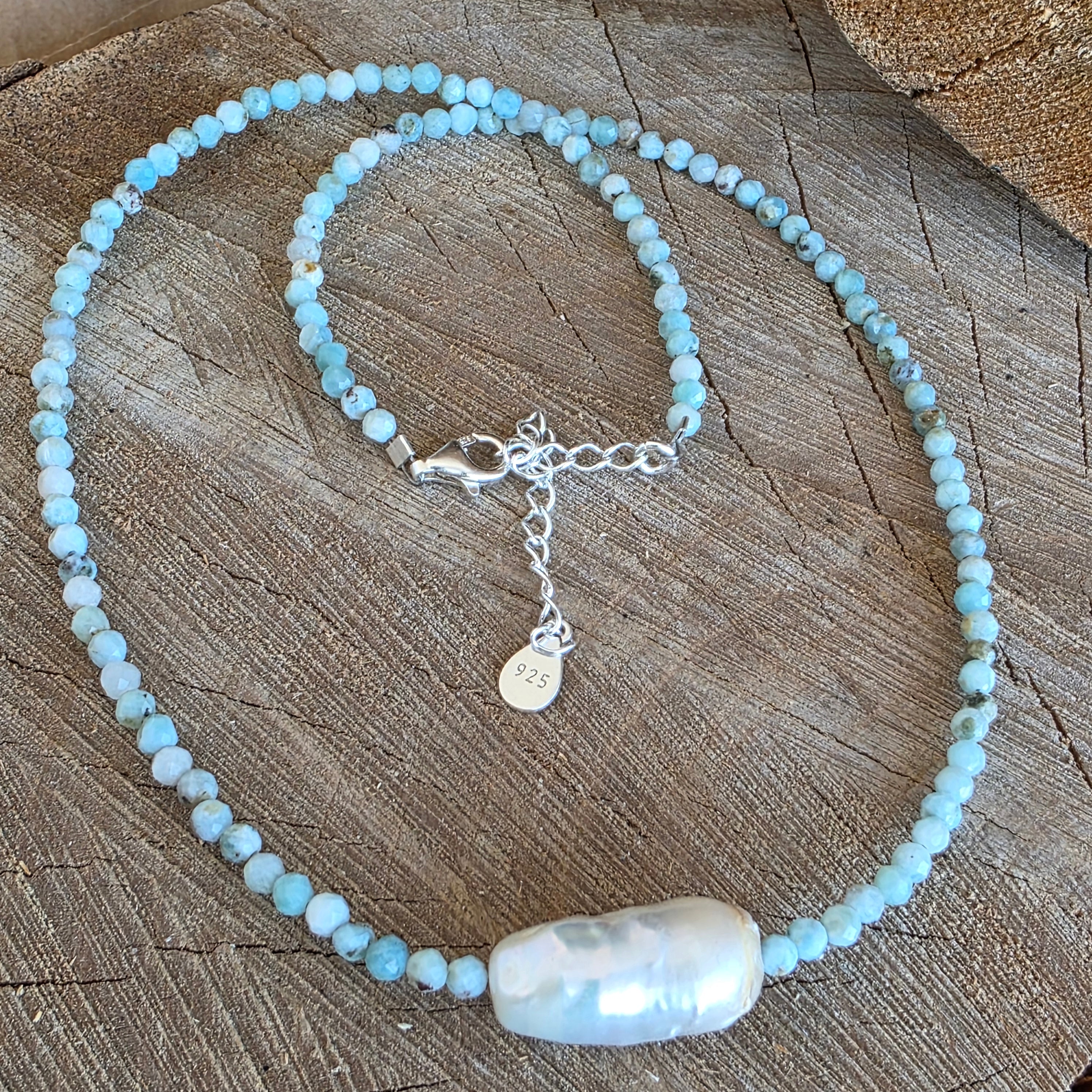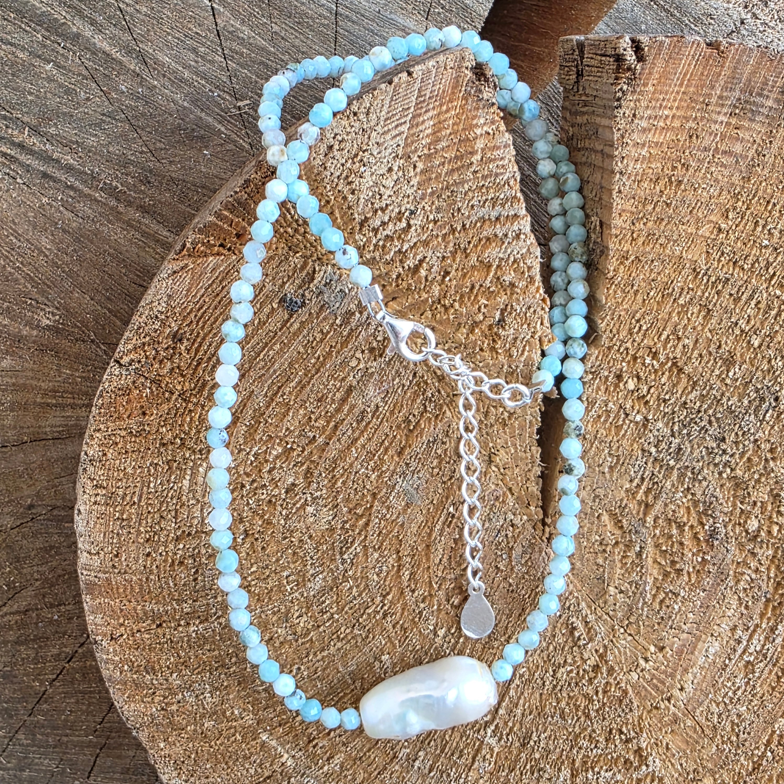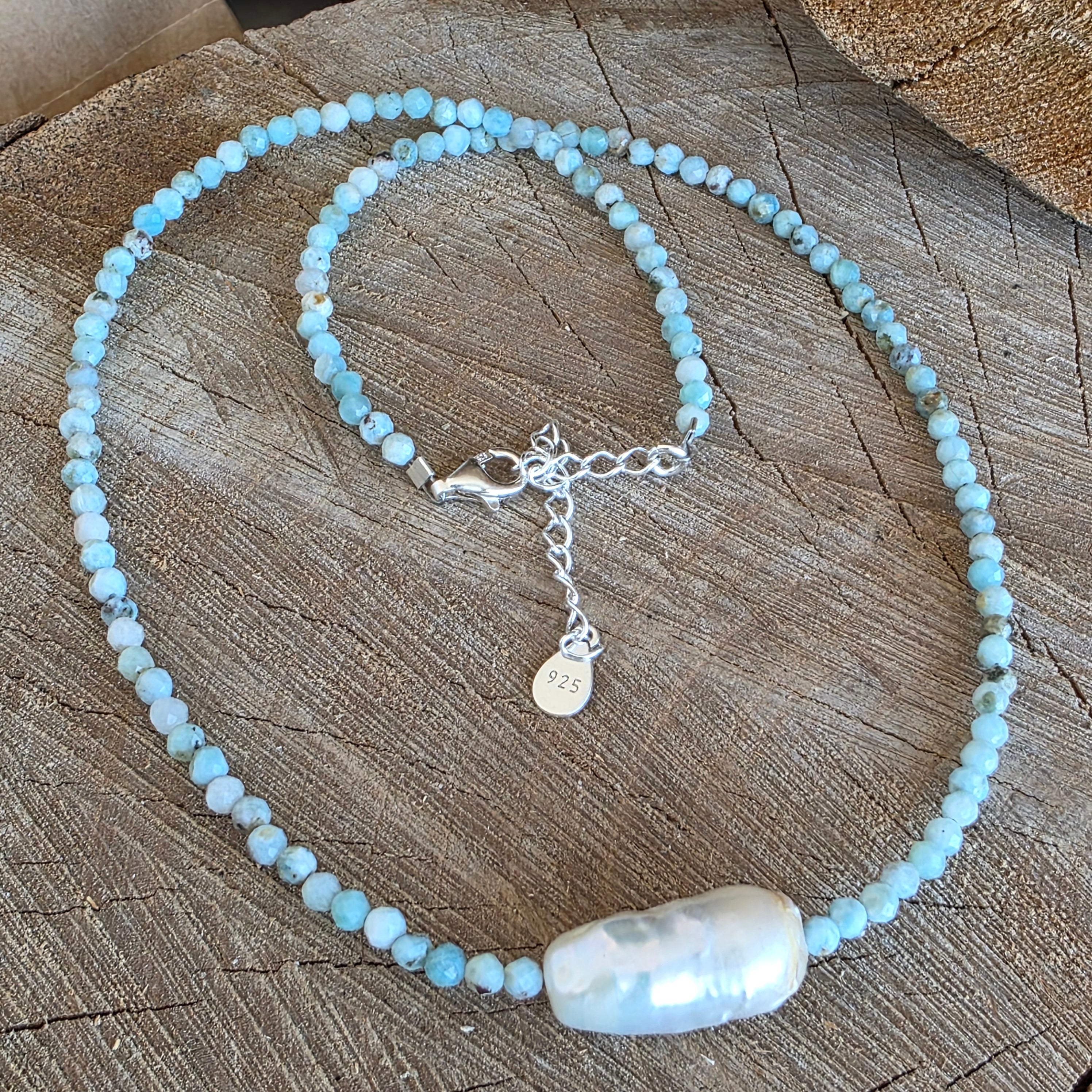 Un colier luminos și rafinat, realizat din mărgele fațetate de larimar de 3 mm, completat de o perla accent de 1.8 cm, dispuse ca accente discrete și echilibrate. Albastrul deschis al larimarului, cu variații lăptoase și ondulații fine, evocă calmul apei și deschiderea spațiului, în timp ce perlele adaugă un contrast delicat, organic, care conferă bijuteriei profunzime și eleganță clasică. Fațetarea fină captează lumina într-un mod subtil, păstrând un aspect aerisit și armonios.