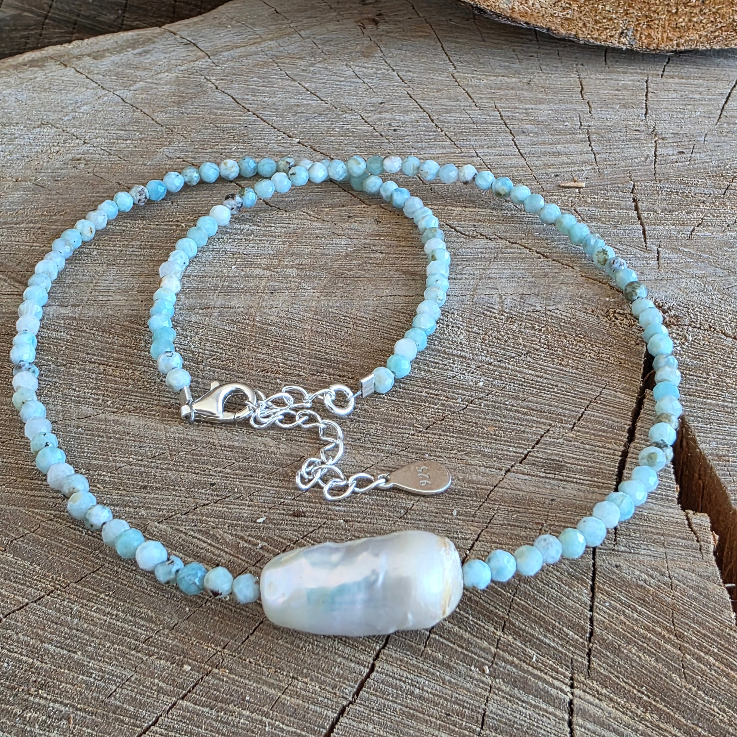 Materiale: larimar natural, mărgele fațetate 3 mm, perla accent de 1.8 cm, argint 925