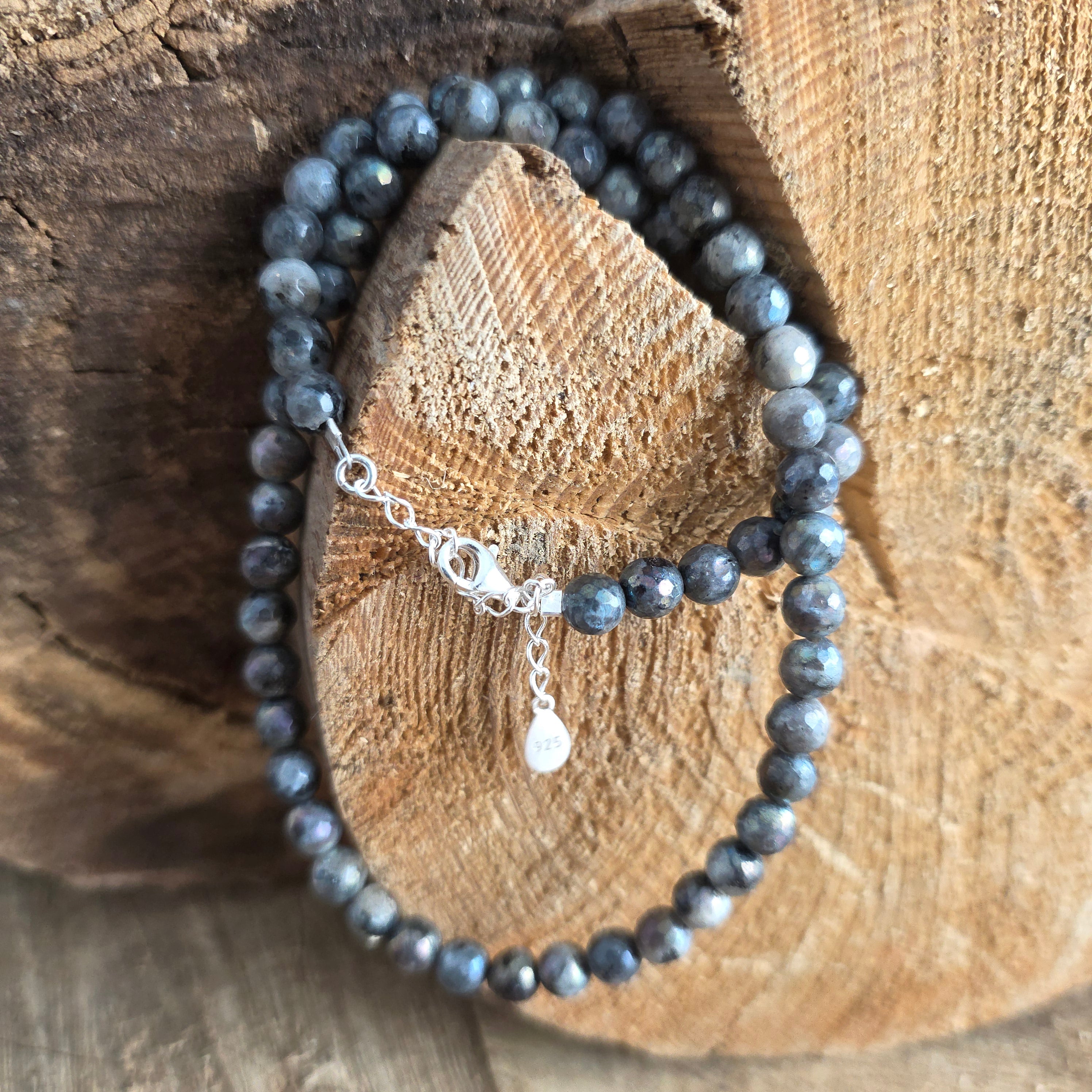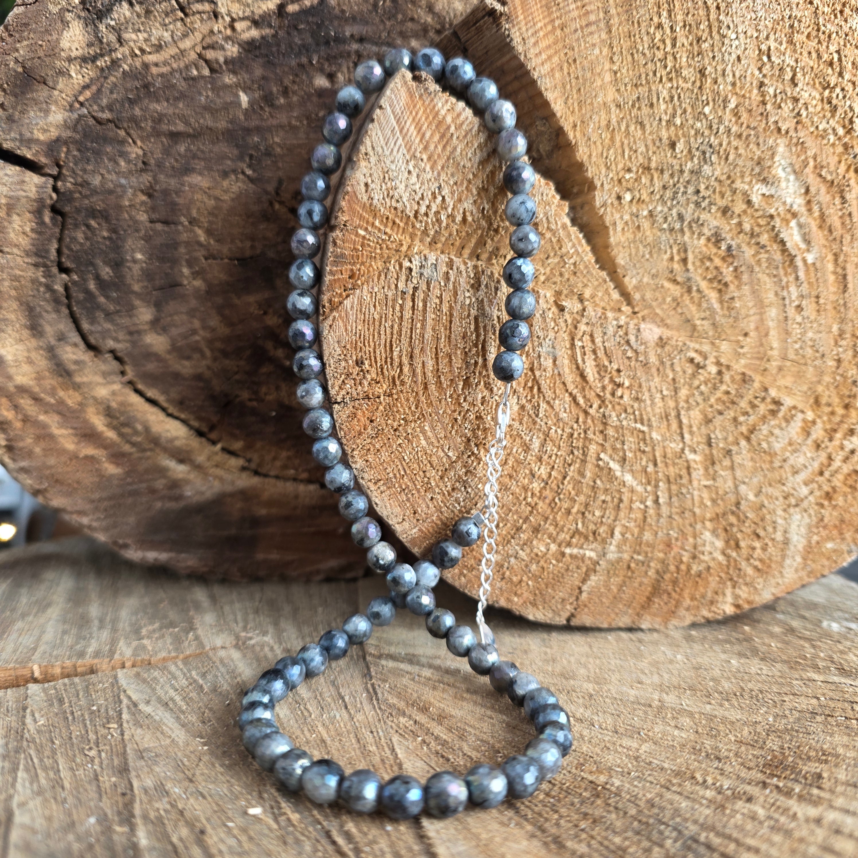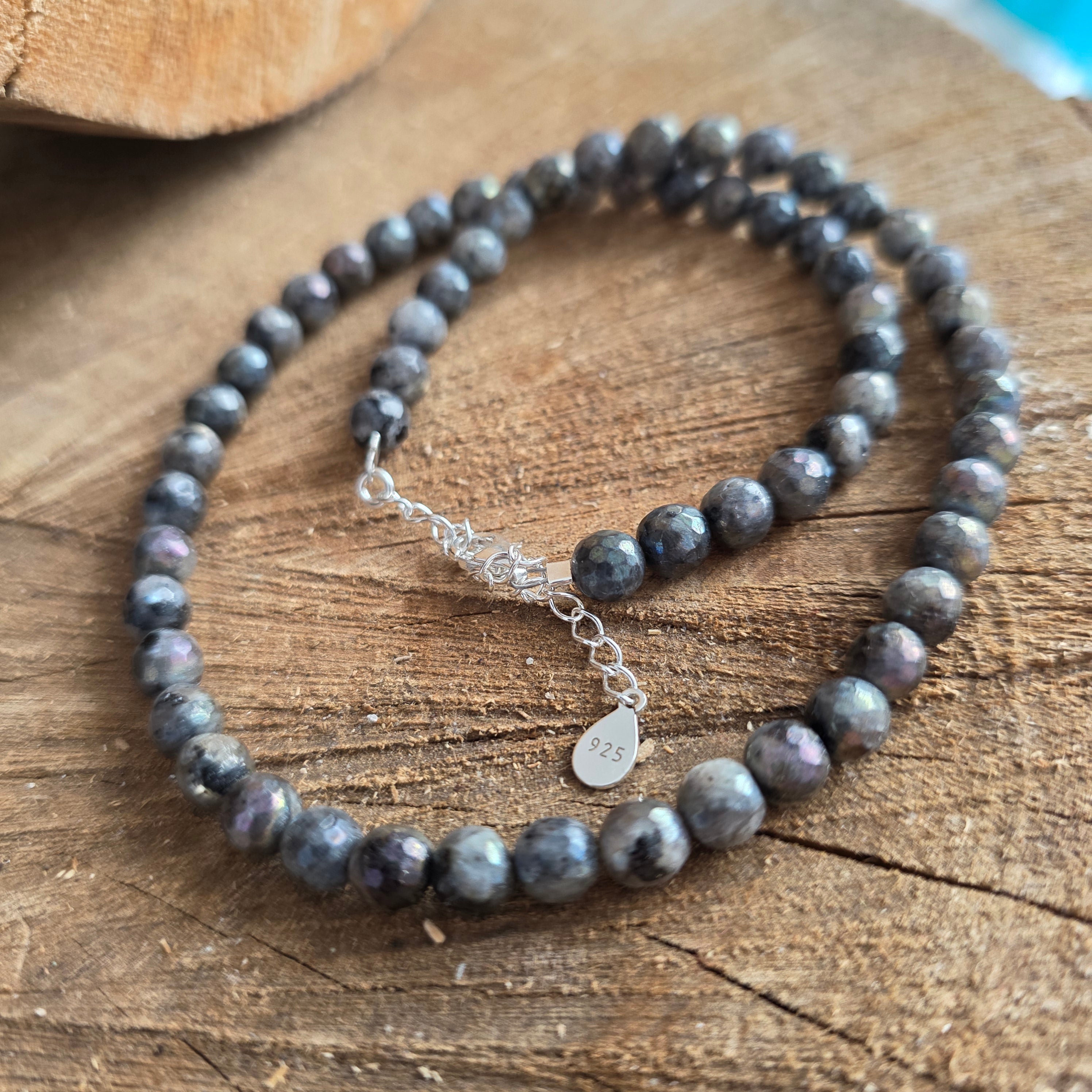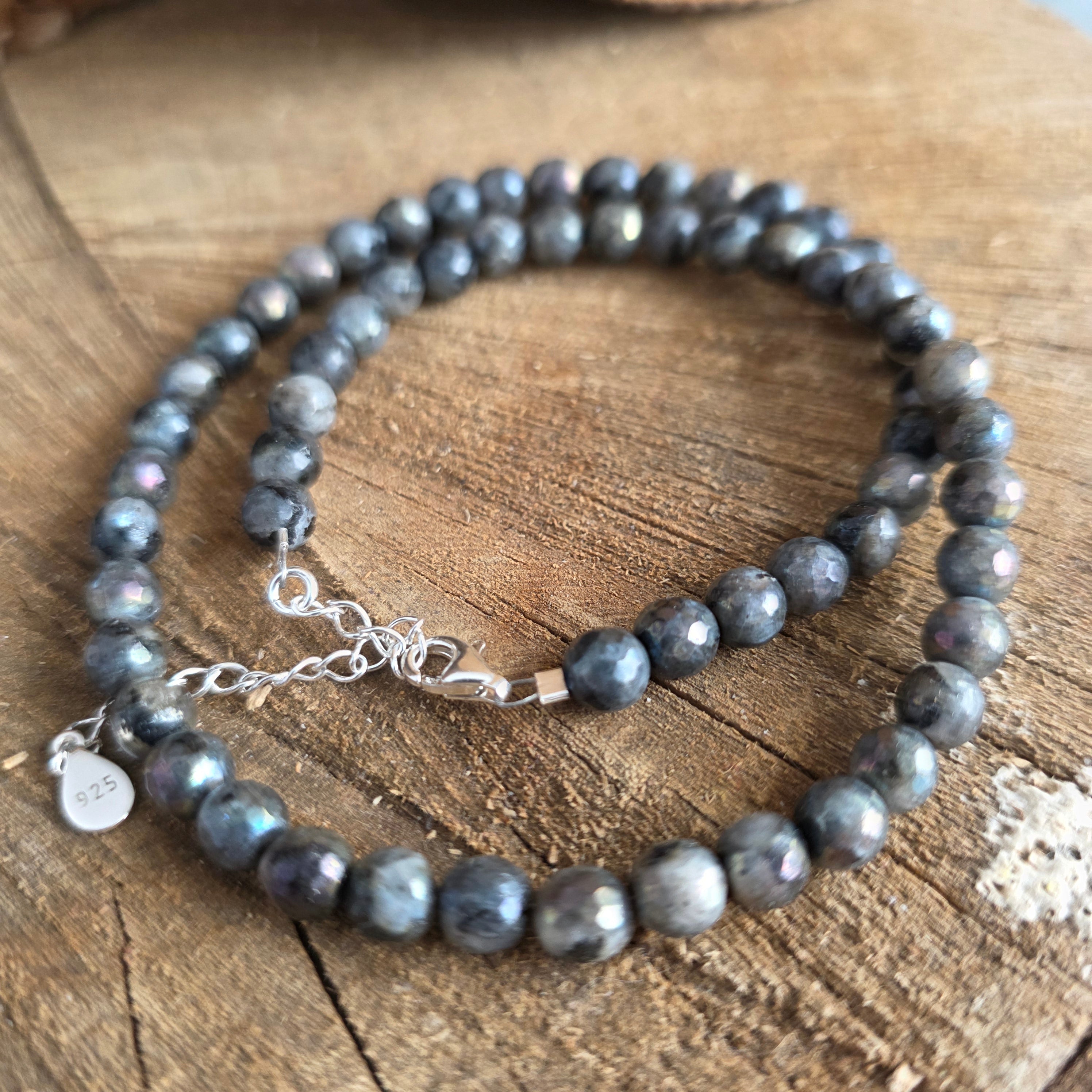 Un colier care îmbină sobrietatea nordică a larvikitului cu o notă modernă de lumină subtilă. Mărgelele fațetate de 6 mm captează și reflectă discret lumina, evidențiind nuanțele gri-argintii și irizațiile albăstrui specifice acestei pietre vulcanice. Tratamentul special pentru efect glow adaugă o aură delicată, vizibilă în lumină difuză, oferind bijuteriei un caracter contemporan și ușor misterios.
