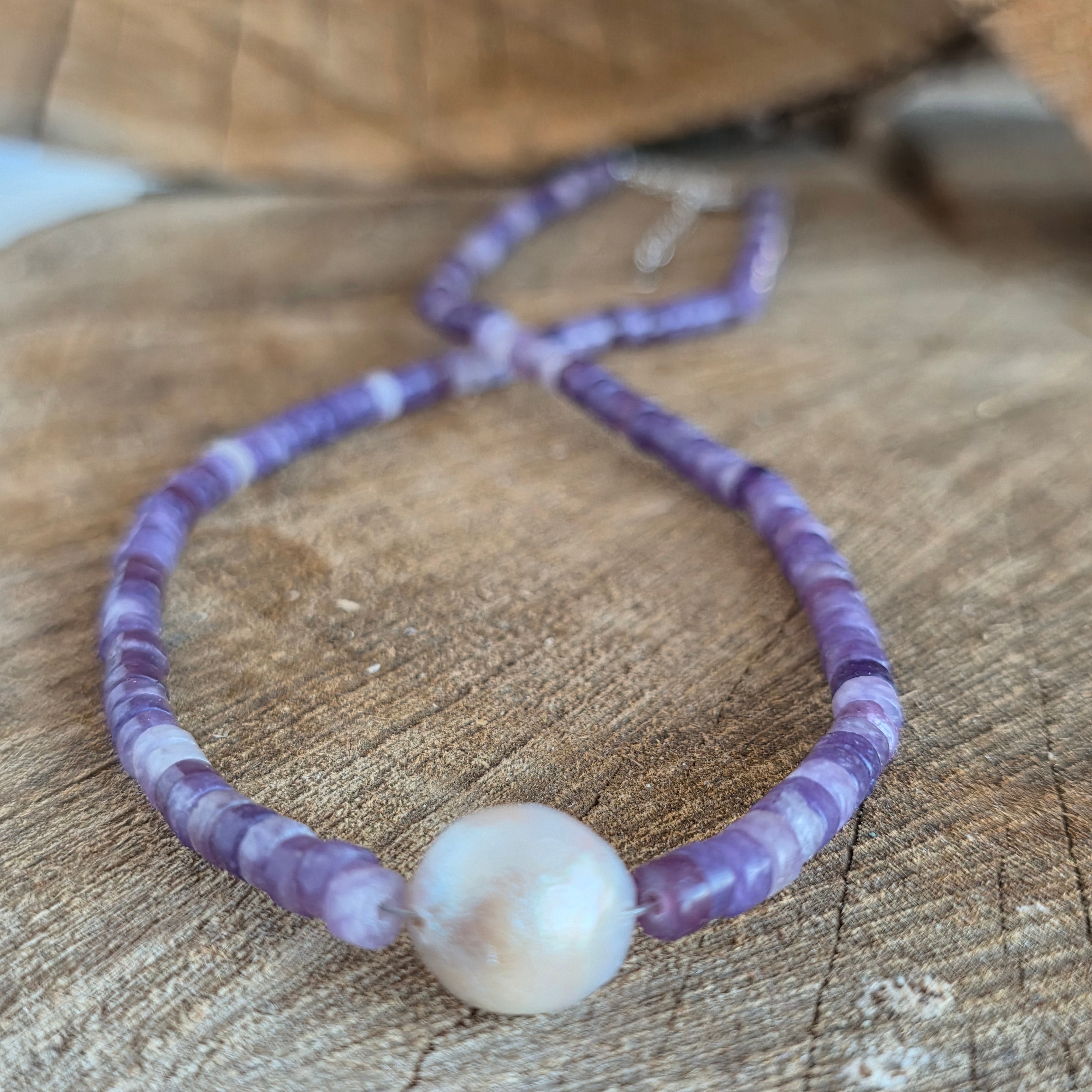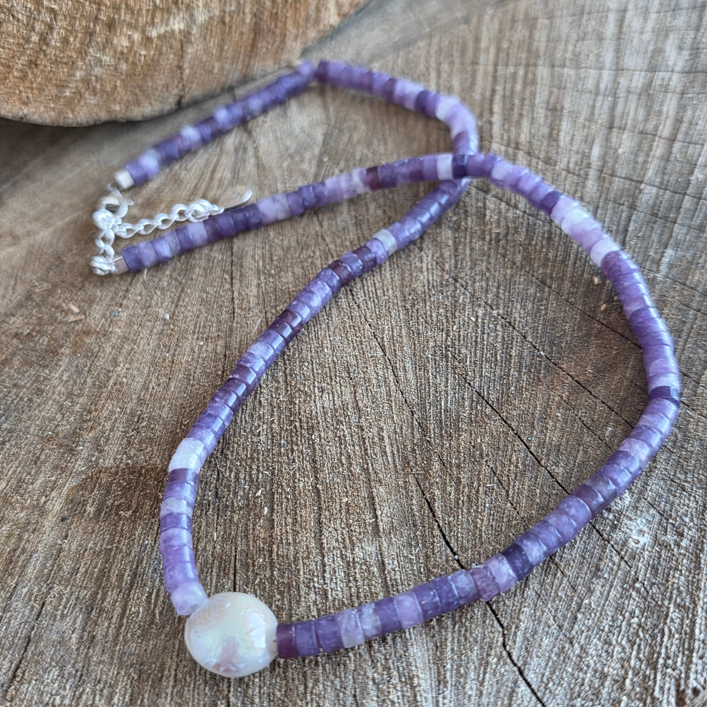 Un colier care emană liniște și rafinament, născut din îmbrățișarea subtilă a lepidolitului cu lumina catifelată a perlei. Lepidolitul natural de 8 mm, cu nuanțele sale diafane de mov-liliachiu, aduce un sentiment de calm și echilibru, ca o respirație adâncă în mijlocul furtunii. Fiecare sferă poartă o vibrație blândă, translucidă, ce amintește de pacea interioară și claritatea minții.