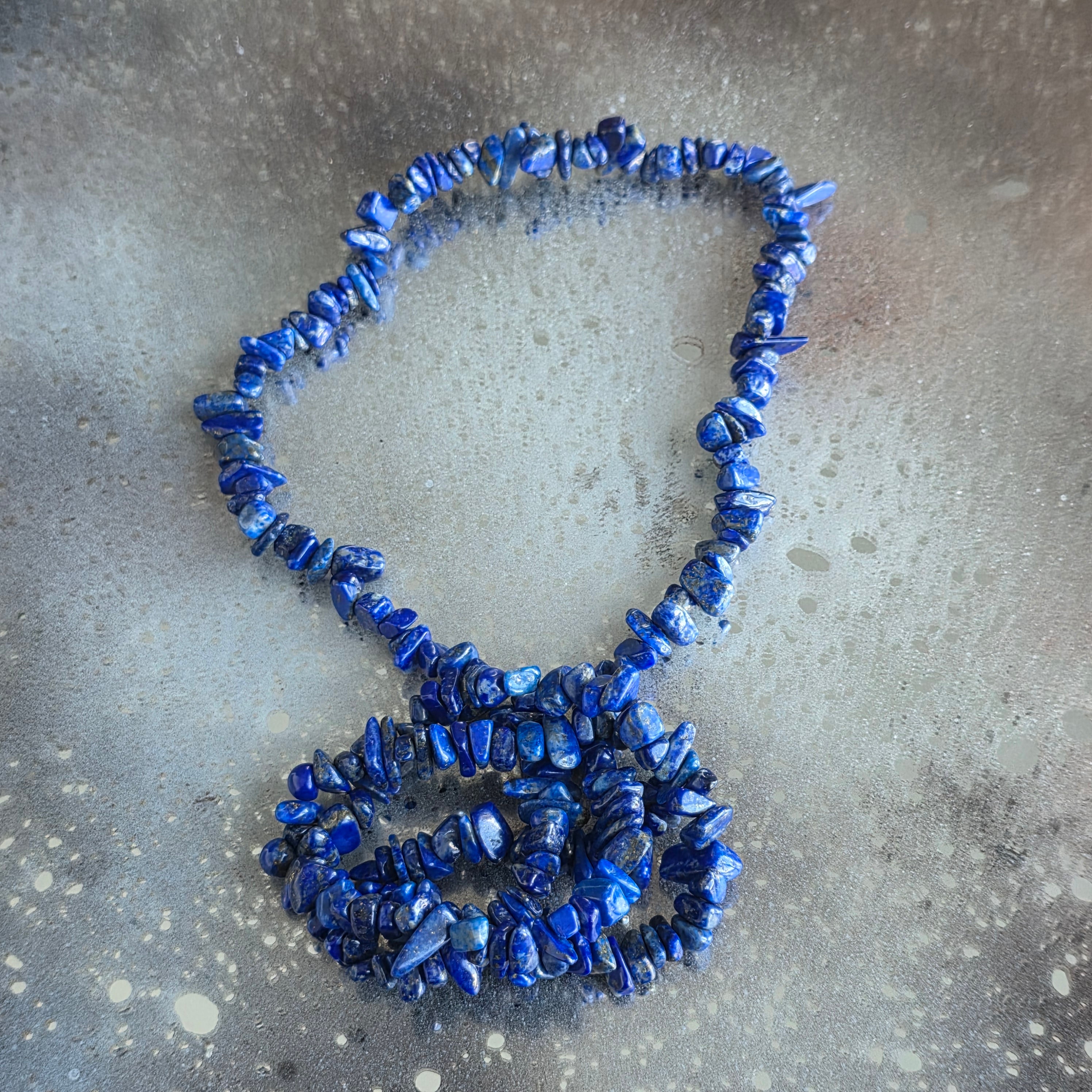 Un colier lung din lapis lazuli, construit din chipsuri neregulate, care păstrează frumusețea autentică a pietrei în forma sa organică. Nuanțele de albastru profund, uneori presărate cu reflexii aurii subtile, creează o prezență elegantă și ușor de remarcat.