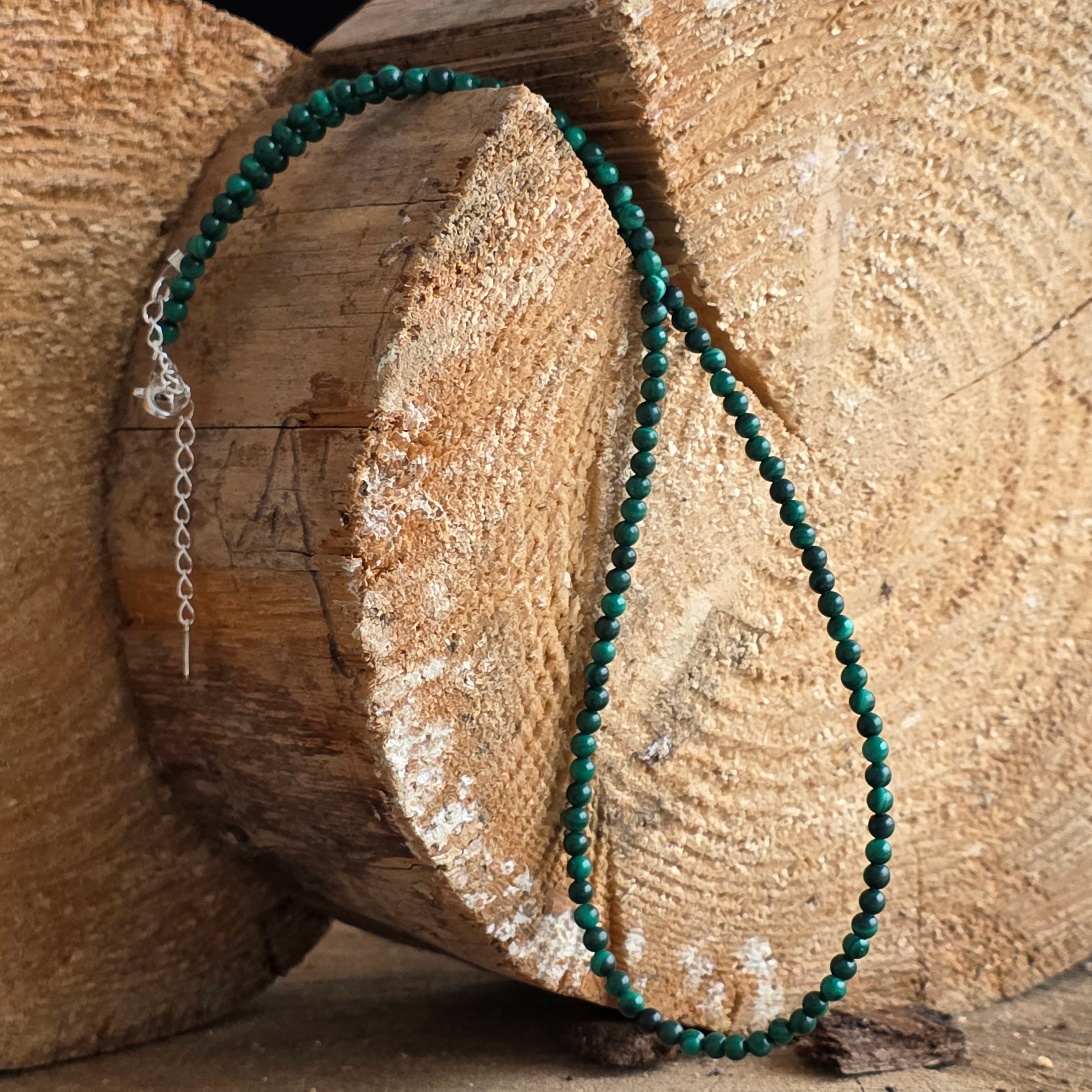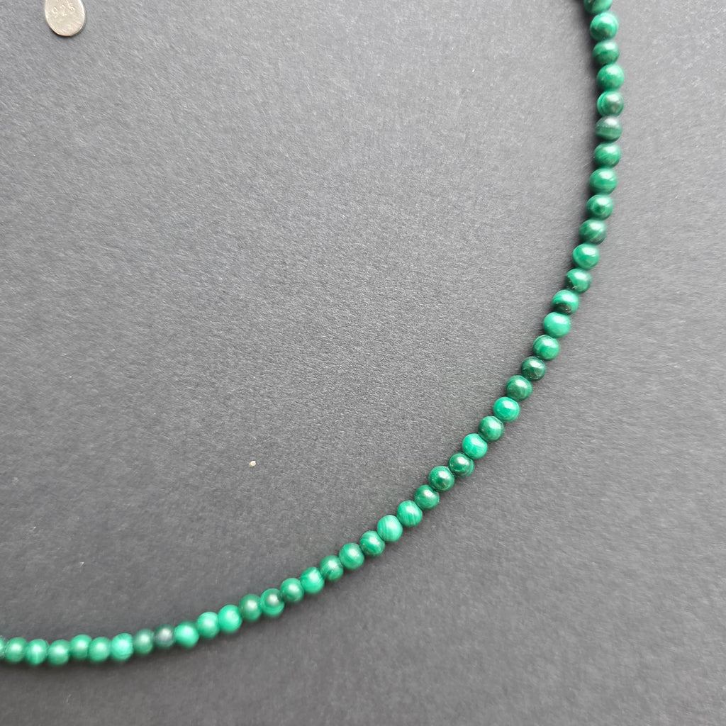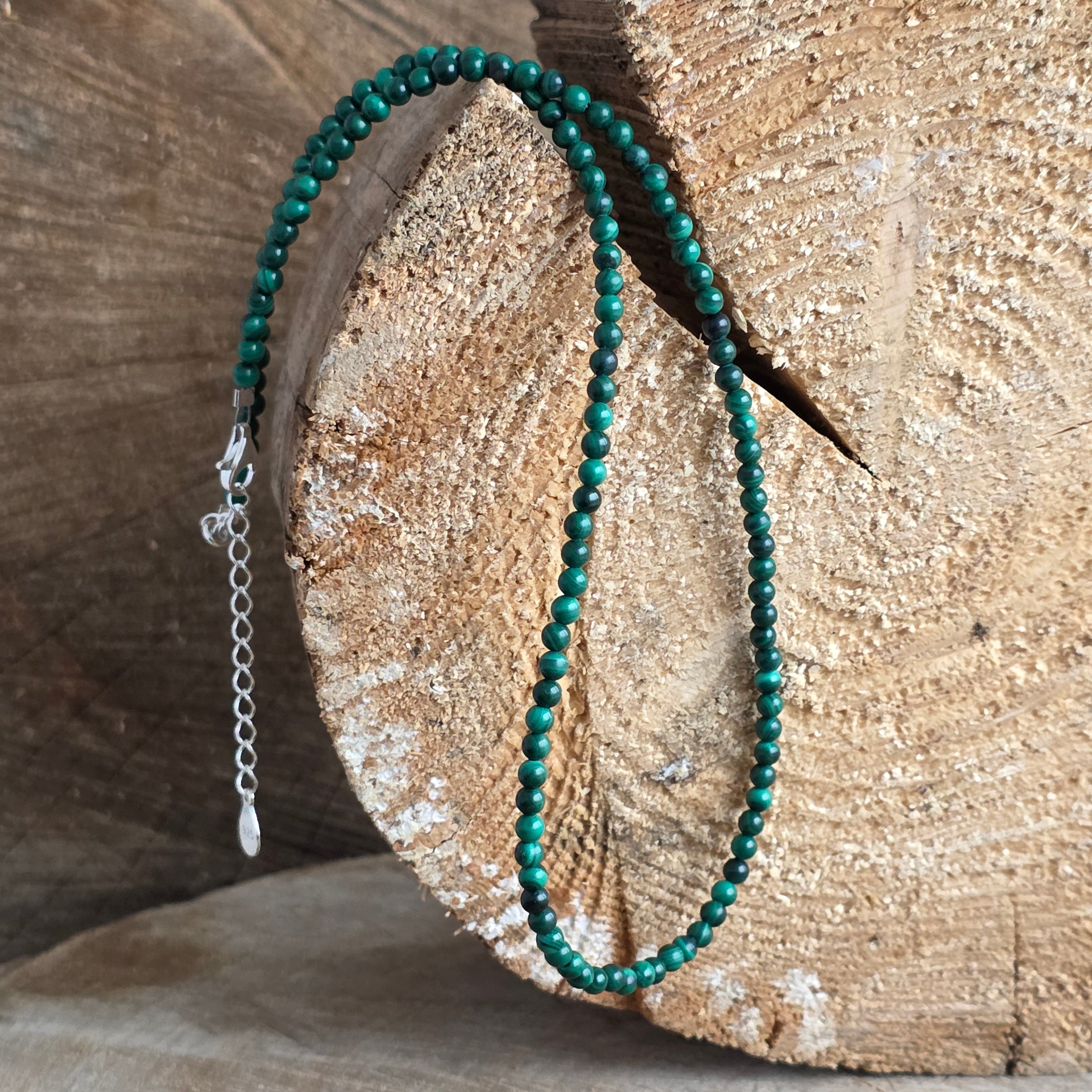 Un colier care poartă cântecul adânc al pământului, un ecou al forței și al regenerării. Malachitul, cu nuanțele sale de verde intens și dungi fluide, este o piatră vie — expresie a transformării, protecției și renașterii interioare. Fiecare mărgea de 3 mm este o lume în sine, un dans între lumina smaraldului și umbra pădurii.